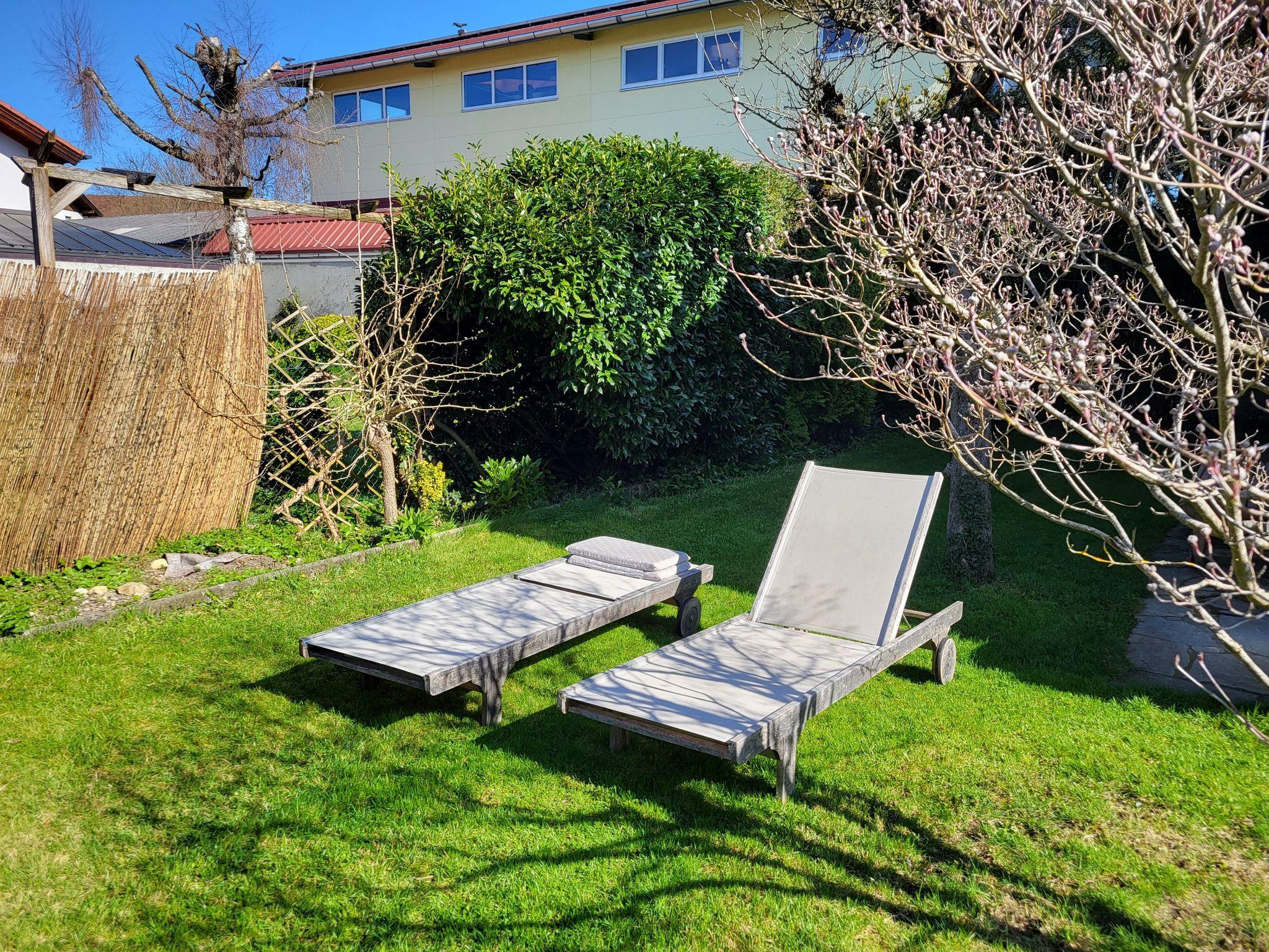 Der Garten liegt hinter dem Haus und kann gerne zum Verweilen auf Sonnenliegen oder am Abend zum gemütlichen Beisammensein am Feuer genutzt werden.