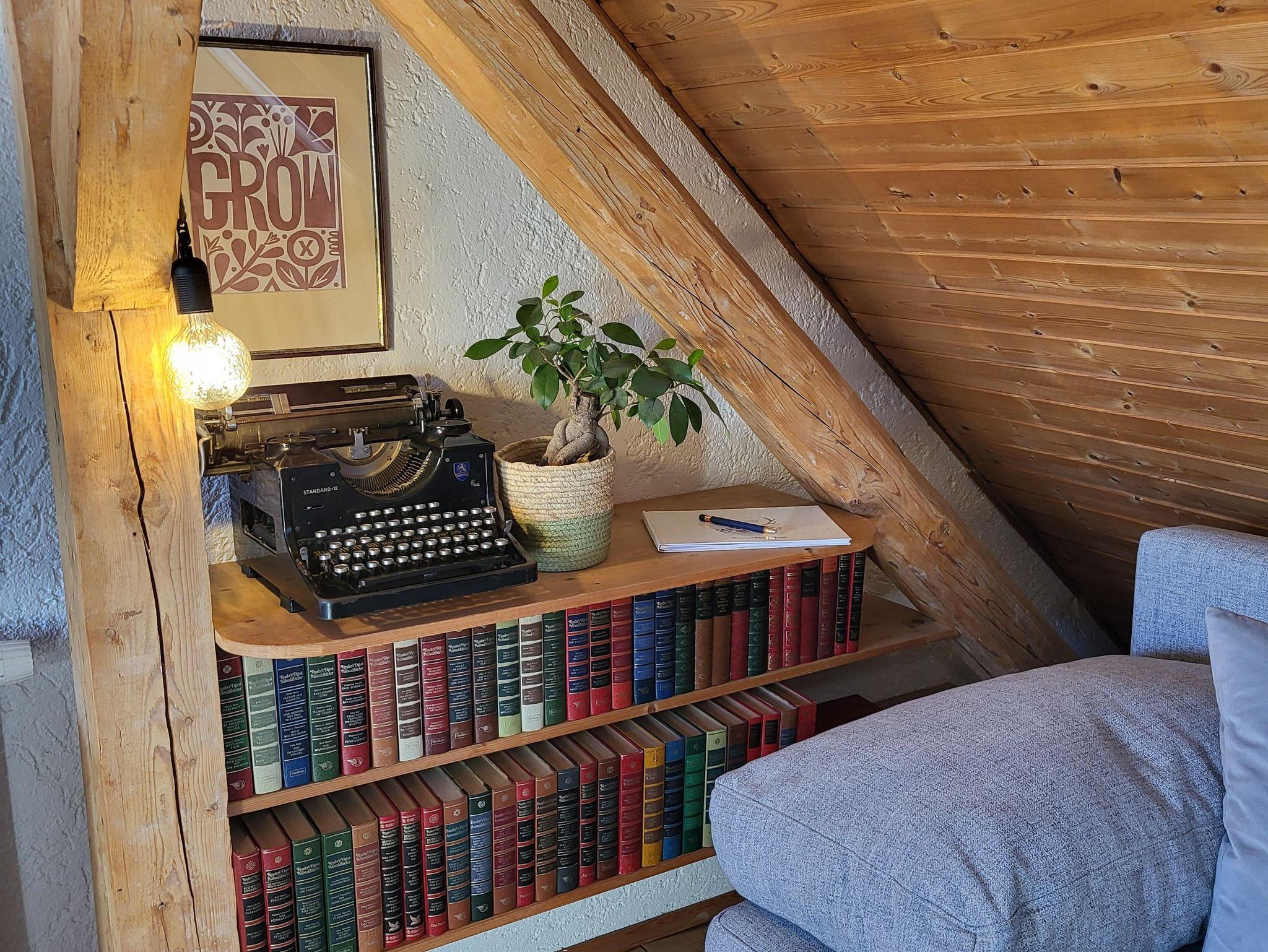 Unser gemütliches 40 qm Dachstudio hat eine komplett ausgestattete Küche, eine Essecke und eine Wohnsitzecke mit Kachelofen. Das Tageslichtbad ist ausgestattet mit einer Dusche/WC. Das Doppelbett liegt im oberen Mansardenbereich und ist über eine steile Treppe erreichbar. Bitte bei einer Buchung beachten. Inkl. Bettwäsche, Handtücher, kostenloses WLAN, TV und Gartenmitbenutzung. Kostenlose Liegestühle zum Sonnenbaden. Parkmöglichkeiten sind vor dem Haus an der Straße in unmittelbarer Nähe vorhanden. Be- und Entladen direkt am Haus ist selbstverständlich möglich. Ein kostenloses Babybett steht zur Verfügung.