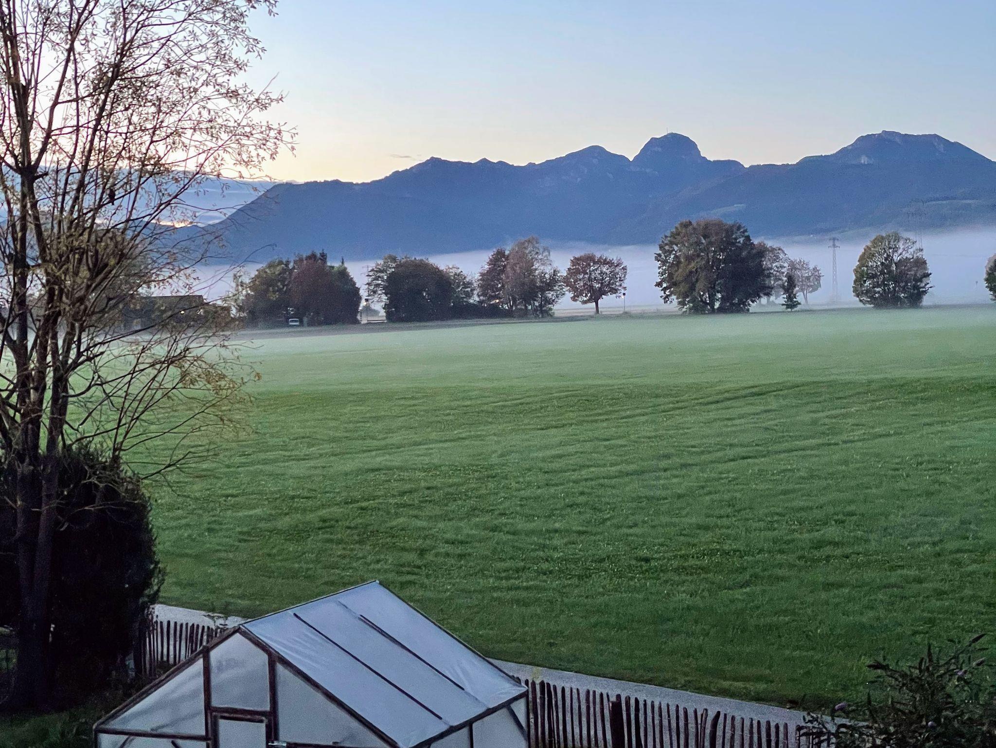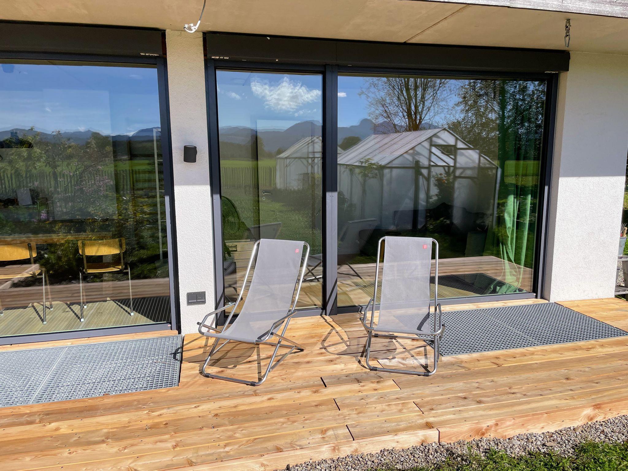 Am Rande des kleinen Dorfes Mitterham befindet sich inmitten eines wild-romantischen Gartens ein modernes Haus mit großer Holzterrasse. Die Ferienwohnung mit einer Fläche von 74 qm nimmt das gesamte Erdgeschoss ein und ist über einen geteilten Hauseingang zu erreichen. Die Terrasse lässt sich über insgesamt 3 Glastüren betreten, der Garten kann zum Sonnen, Spielen oder Kräuterpflücken mitgenutzt werden. Hinter dem Gartenzaun befindet sich der kaum befahrene Kirchweg, und direkt dahinter beginnen die Felder und man hat freien Blick bis zu den nächsten Dörfern, sanften Hügeln und die nahegelegenen Voralpen. Es ist ruhig und erholsam.