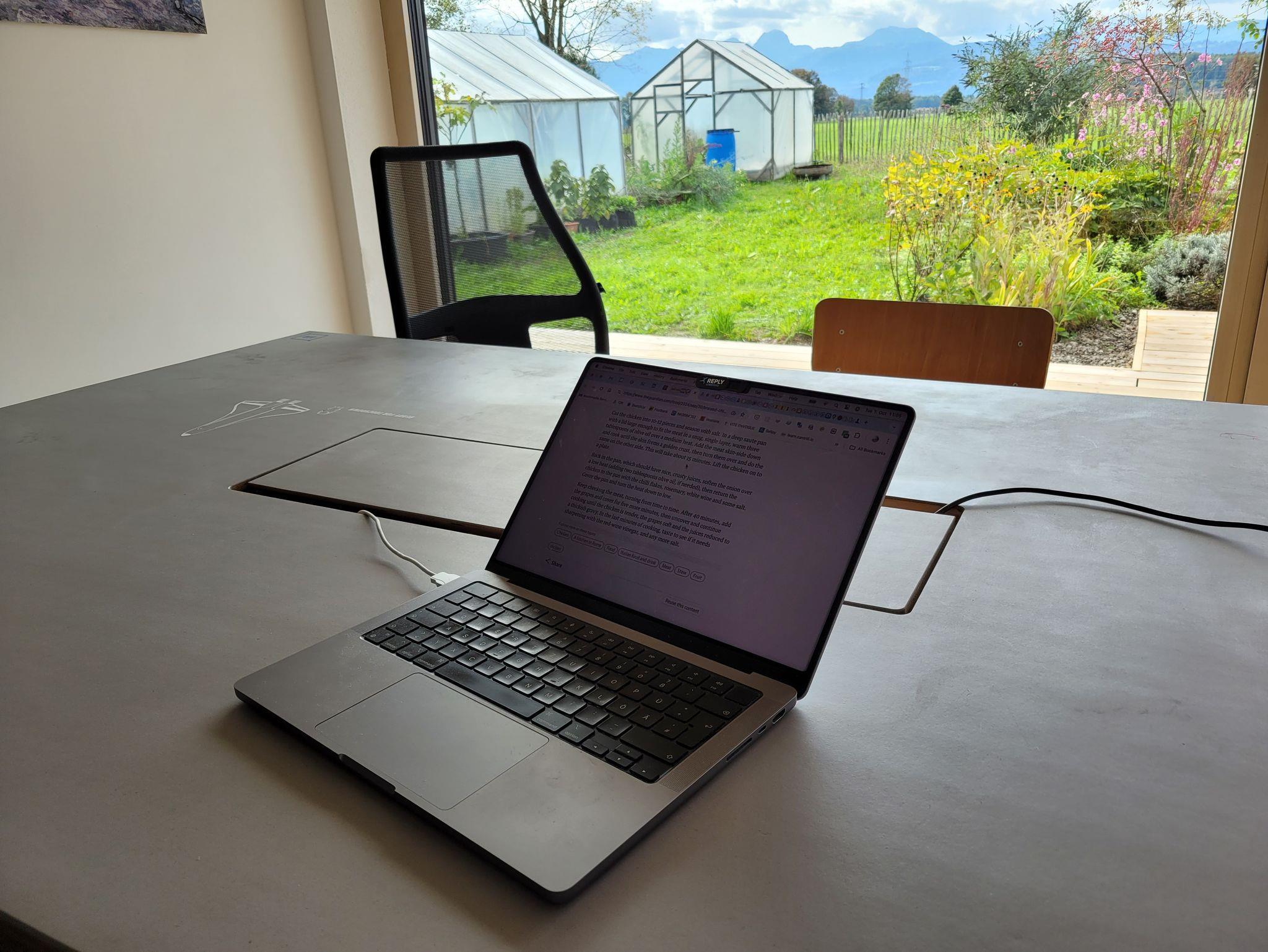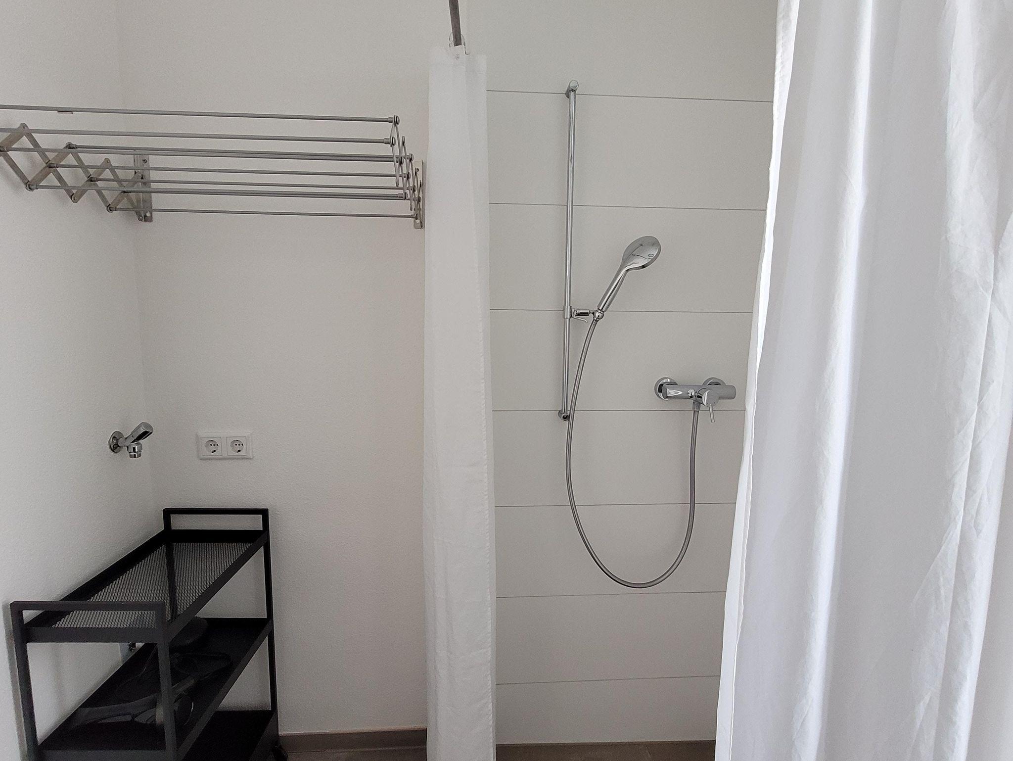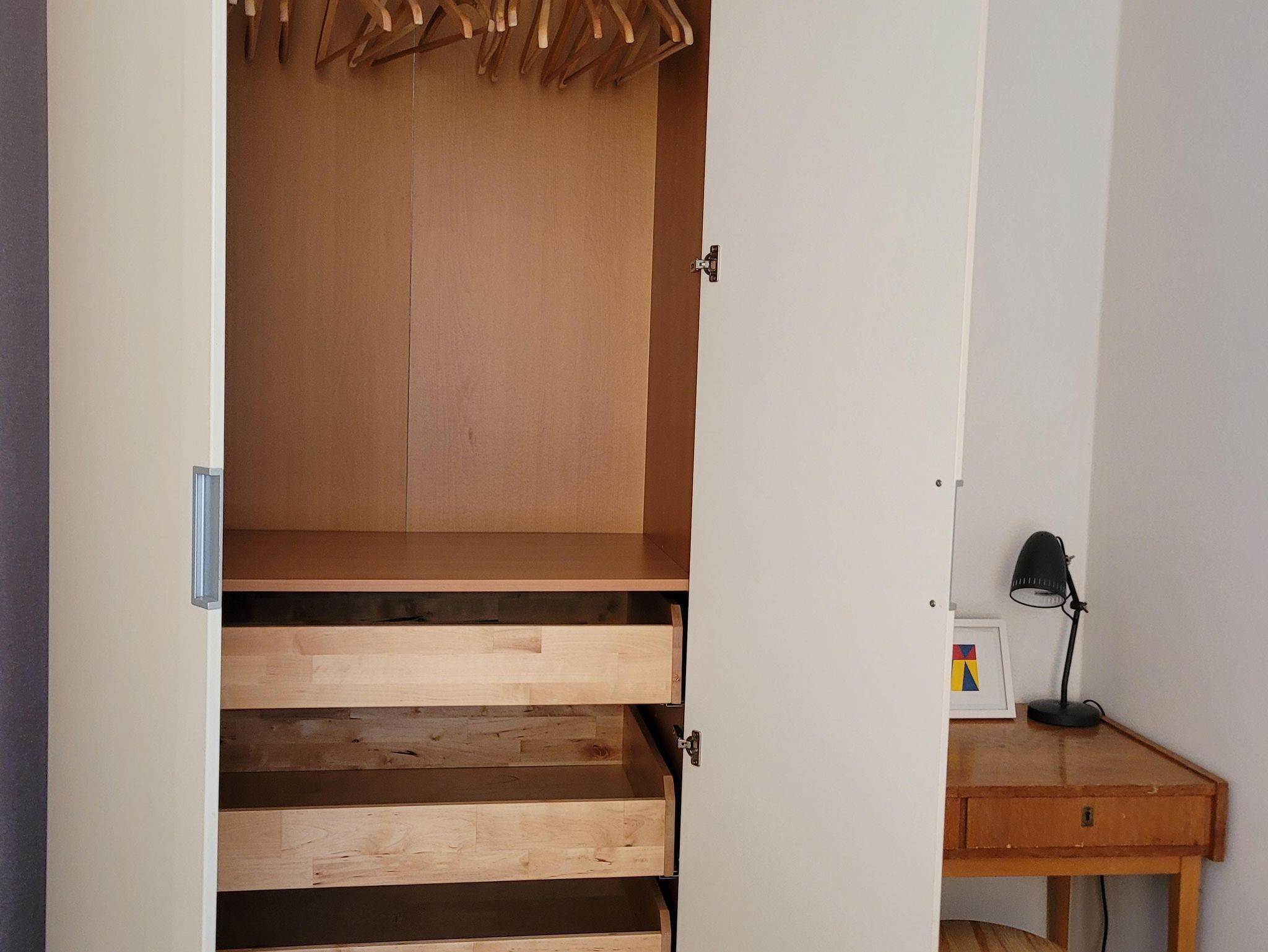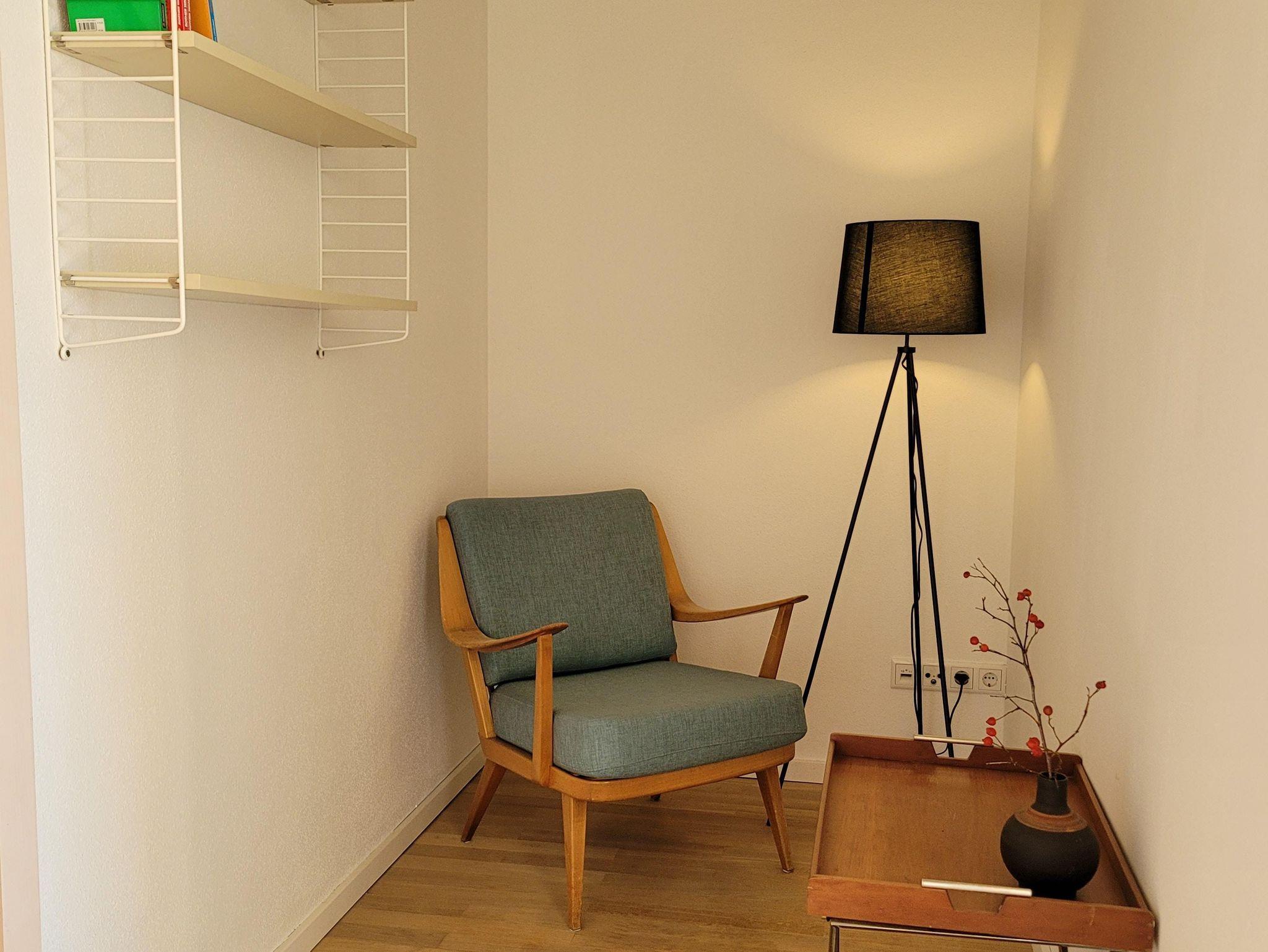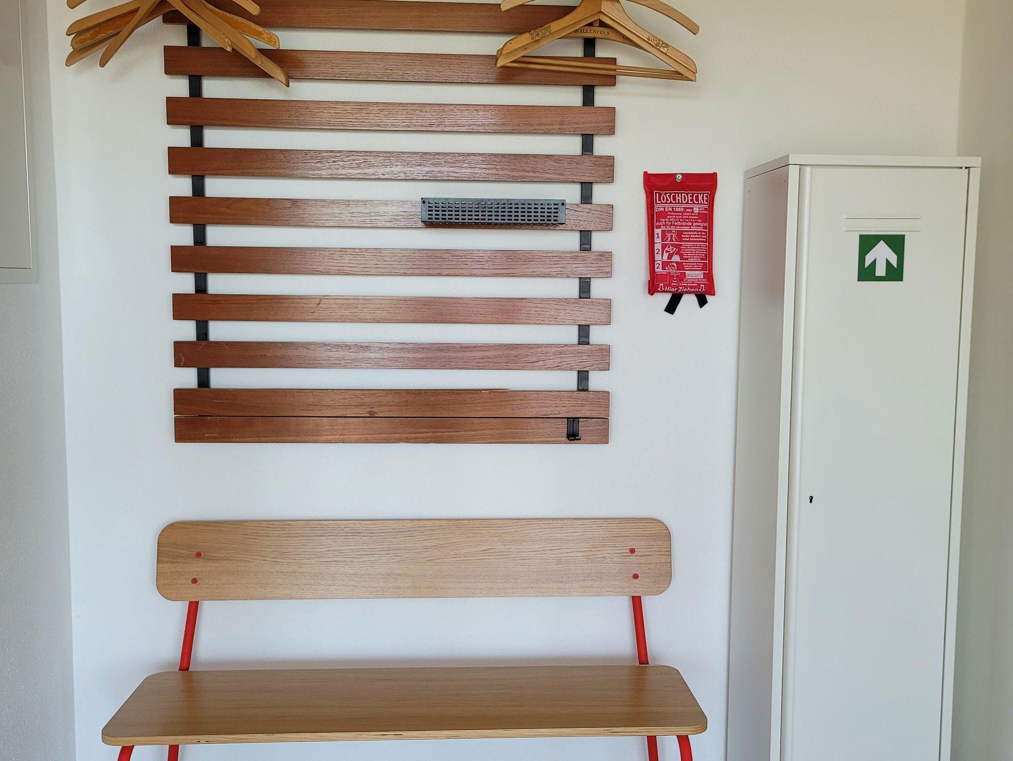 Wer mit dem Auto anreist, kann sein Fahrzeug für die gesamte Zeit des Aufenthalts direkt vor dem Garten in einer Parkbucht am Gartenzaun parken. Für Fahrräder, Skier oder andere Sportgeräte ist im Carport eine offen zugängliche Unterstellmöglichkeit gegeben (nicht absperrbar). Man betritt die Ferienwohnung im Erdgeschoss über einen gemeinsam genutzten Hauseingang und gelangt zur rechten in den Flur mit Garderobe und Sitzbank. Von dort geht zum einen das Badezimmer mit Dusche, Waschbecken und Toilette ab. Zum anderen öffnet sich hinter einer zweiflügeligen Glastür das Herzstück der Wohnung: eine große Wohnküche, die der Länge nach verglast ist und einen freien Blick auf den Garten und die dahinter liegende Landschaft freigibt. Die voll ausgestattete Wohnküche hat auf der rechten Seite eine Küchenzeile und einen Stehtisch, an dem sich Kochen und Essen lässt. Daneben befinden sich Sitzstufen aus Holz an der Wand, wo man gemütlich einen Kaffee trinken oder lesen kann. Im Zentrum der Wohnküche steht ein (wirklich) sehr großer Holztisch, der schon einige Gebrauchsspuren aufweist und an dem viele Personen Platz haben. Seine Besonderheit: in der Mitte sind hinter Klappen Steckdosen und LAN-Anschlüsse versteckt, falls man arbeiten oder einfach nur ins Internet gehen möchte. Wer es gemütlicher haben möchte, kann den Tisch mit verschiedenen Tischdecken dekorieren. Über einen Wandflur - mit Sprossenwand und Platz für Yogaübungen, einer Sitzecke mit Lesesessel und Buchregal - gelangt man links zum Schlafzimmer mit Kleiderschrank, Schminktischchen und französischem Bett. Zur rechten schließt sich das Wohnzimmer mit einem großen Loungesofa an, ebenfalls mit einer durchgängigen Glasfront und Zugang zu Terrasse und Garten. Hier befindet sich auch der Beamer und die Soundanlage, mit denen sich Filme auf die freie weiße Wand projizieren lassen. Das Loungesofa lässt sich für zwei weitere Personen zu einem Gästebett umfunktionieren, die Bettwäsche dazu befindet sich im selben Raum in zwei großen Aluminiumkisten, die auch als Ablage genutzt werden können. Auf Anfrage kann sowohl die Waschmaschine als auch ein Trockner im Obergeschoss mitbenutzt werden als auch die Feuerschale im Garten.