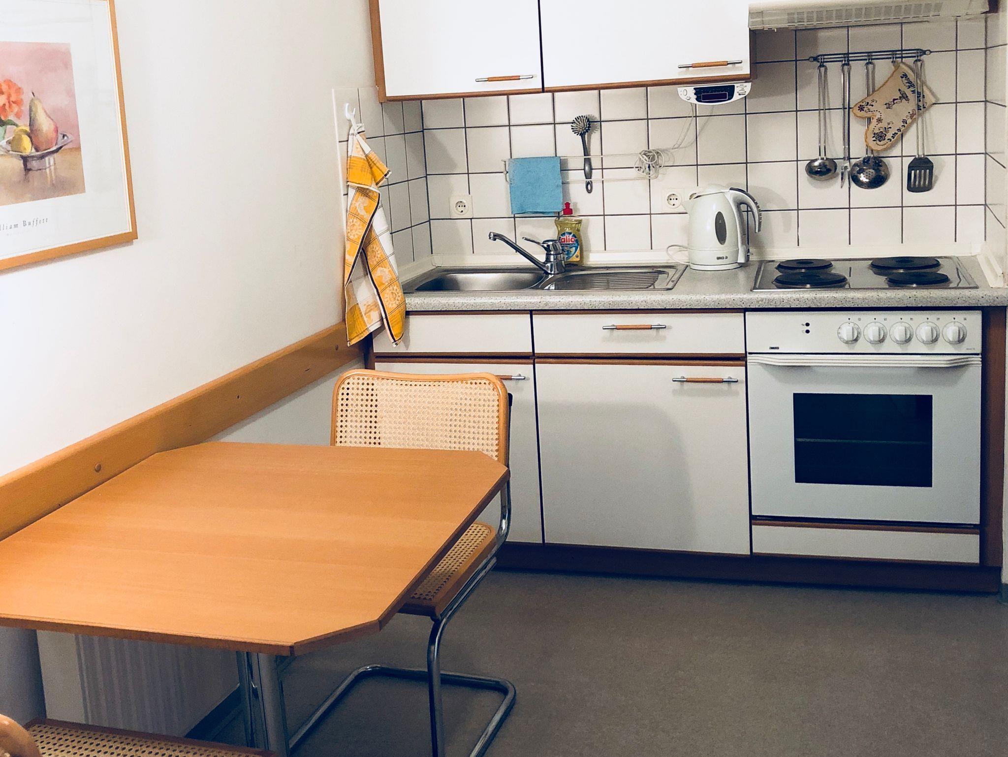 Die Ferienwohnung König Max im Alten Kurhaus bietet auf 55 m² Wohnfläche einen Eingangsbereich mit Garderobe sowie ein Badezimmer mit Dusche (Duschhocker vorhanden), WC und Waschbecken. Die gut ausgestattete Küche mit Backofen, Herd und Wasserkocher lässt so gut wie keine Wünsche offen. Daneben gibt es ein gemütliches Wohnzimmer mit Schlafcouch, Radio und TV sowie ein Schlafzimmer mit Doppelbett.