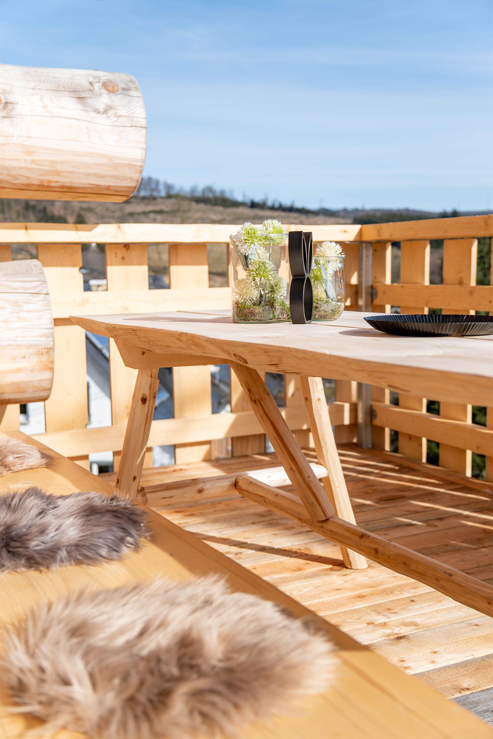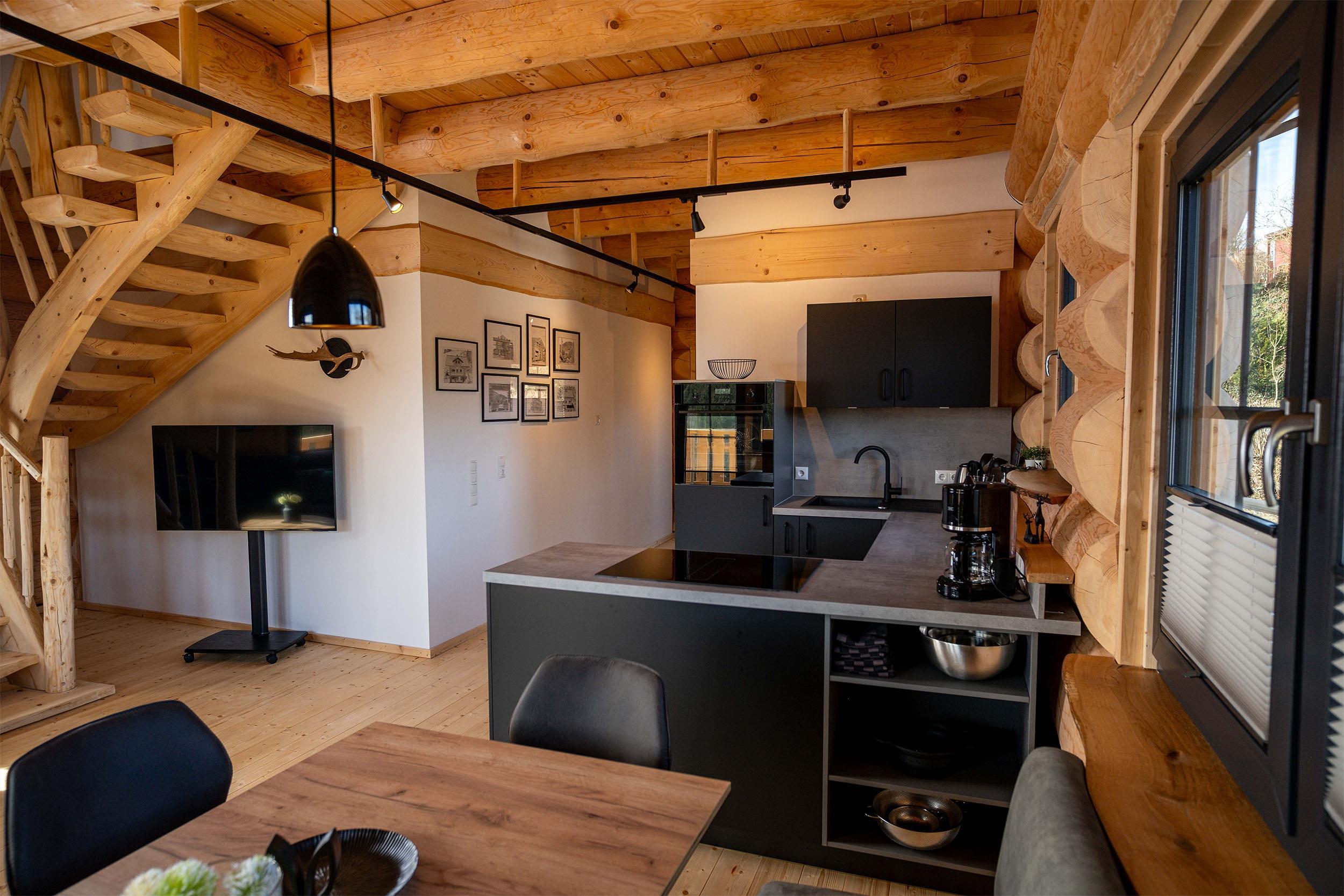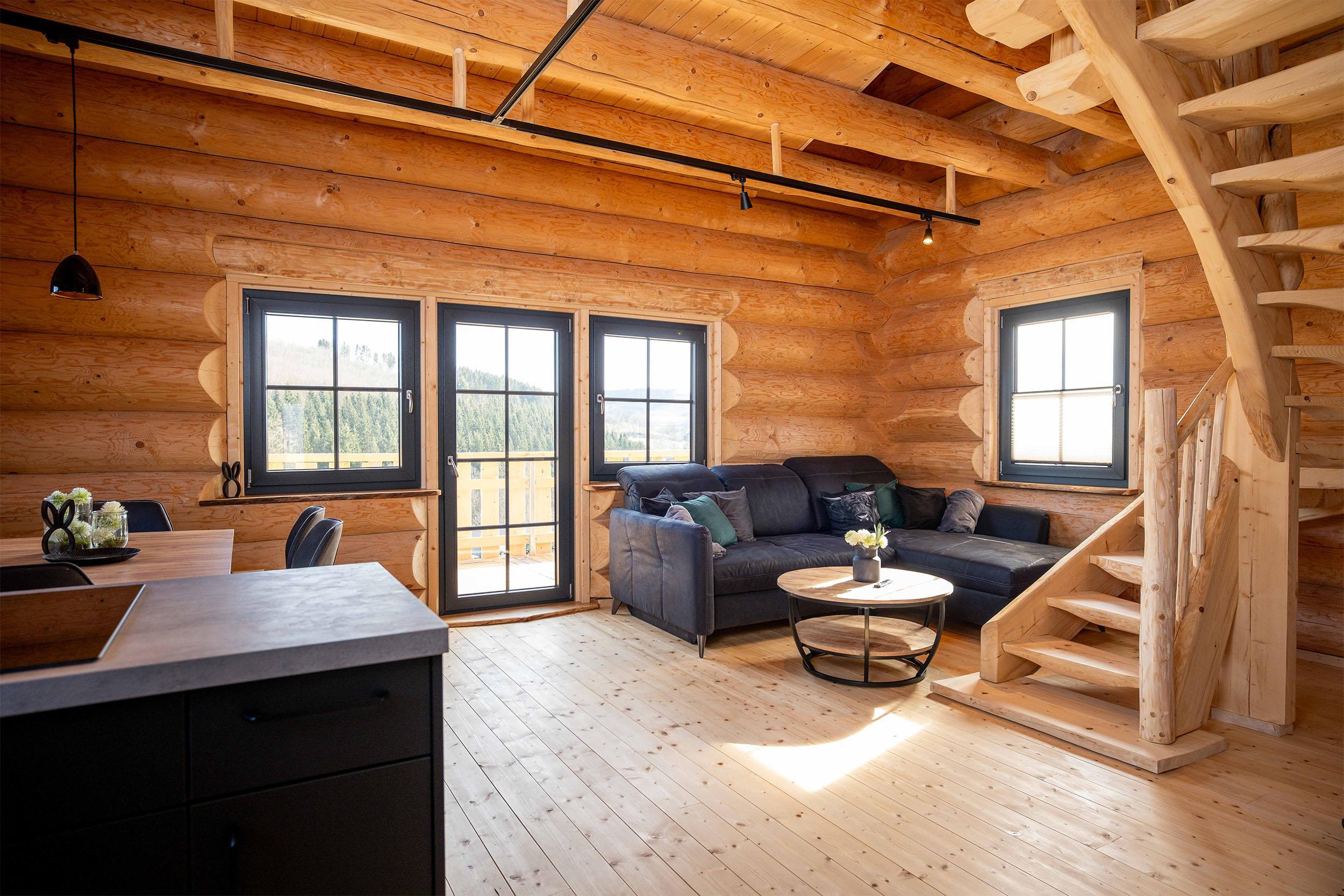 Willkommen in der Großen Fichte – Ihrem gemütlichen Naturstammblockhaus mitten im Grünen! Erleben Sie unvergessliche Tage in unserer liebevoll handgefertigten Ferienunterkunft "Fichtenhaus". Auf rund 85 qm erstreckt sich die "Große Fichte" über zwei Etagen und bietet Platz für bis zu sechs Personen. Hier vereinen sich rustikaler Charme und moderner Komfort zu einem einzigartigen Wohnerlebnis. Ihr Rückzugsort mit Wohlfühlgarantie. Bereits beim Betreten des Erdgeschosses empfängt Sie ein großzügiger, offener Wohnbereich. Die voll ausgestattete Küche mit Kühl-Gefrierkombination, Backofen, Geschirrspüler, Toaster, Wasserkocher, Kaffeemaschine und Induktionskochfeld lässt keine Wünsche offen. Ob ausgedehnte Frühstücke oder gemeinsame Kochabende – der gemütliche Essbereich lädt zum Verweilen ein. Direkt angrenzend befindet sich der behagliche Wohnbereich mit einer großen, ausziehbaren Couch und TV. Hier können Sie entspannte Stunden mit Ihren Liebsten verbringen. Ein separates WC im Eingangsbereich sorgt für zusätzlichen Komfort.Panoramablick & Natur pur ! Vom Wohnbereich aus gelangen Sie auf den umlaufenden Balkon – ein wahres Highlight der Unterkunft. Genießen Sie von hier aus den atemberaubenden Blick über das Tal und die dichten Wälder der Gemeinde Wingeshausen. Ob beim Frühstück in der Morgensonne oder bei einem Glas Wein am Abend – dieser Ort lädt zum Träumen ein. Über die handgefertigte Holztreppe erreichen Sie das Obergeschoss mit drei gemütlichen Doppelschlafzimmern. Hier erwarten Sie zwei Betten mit 160 cm Breite und ein großzügiges Bett mit 180 cm Breite – alle ausgestattet mit hochwertigen Einzelmatratzen für optimalen Schlafkomfort in natürlicher Atmosphäre. Auf Wunsch stellen wir Ihnen gerne ein Babybett und einen Hochstuhl zur Verfügung. Ein charmantes Duschbad sorgt für einen erfrischenden Start in den Tag. Und für die Abenteuerlustigen: Die offene Galerie begeistert mit einem angebrachten Fischernetz – perfekt zum Klettern, Entspannen oder einfach zum Genießen des traumhaften Ausblicks auf die Natur.