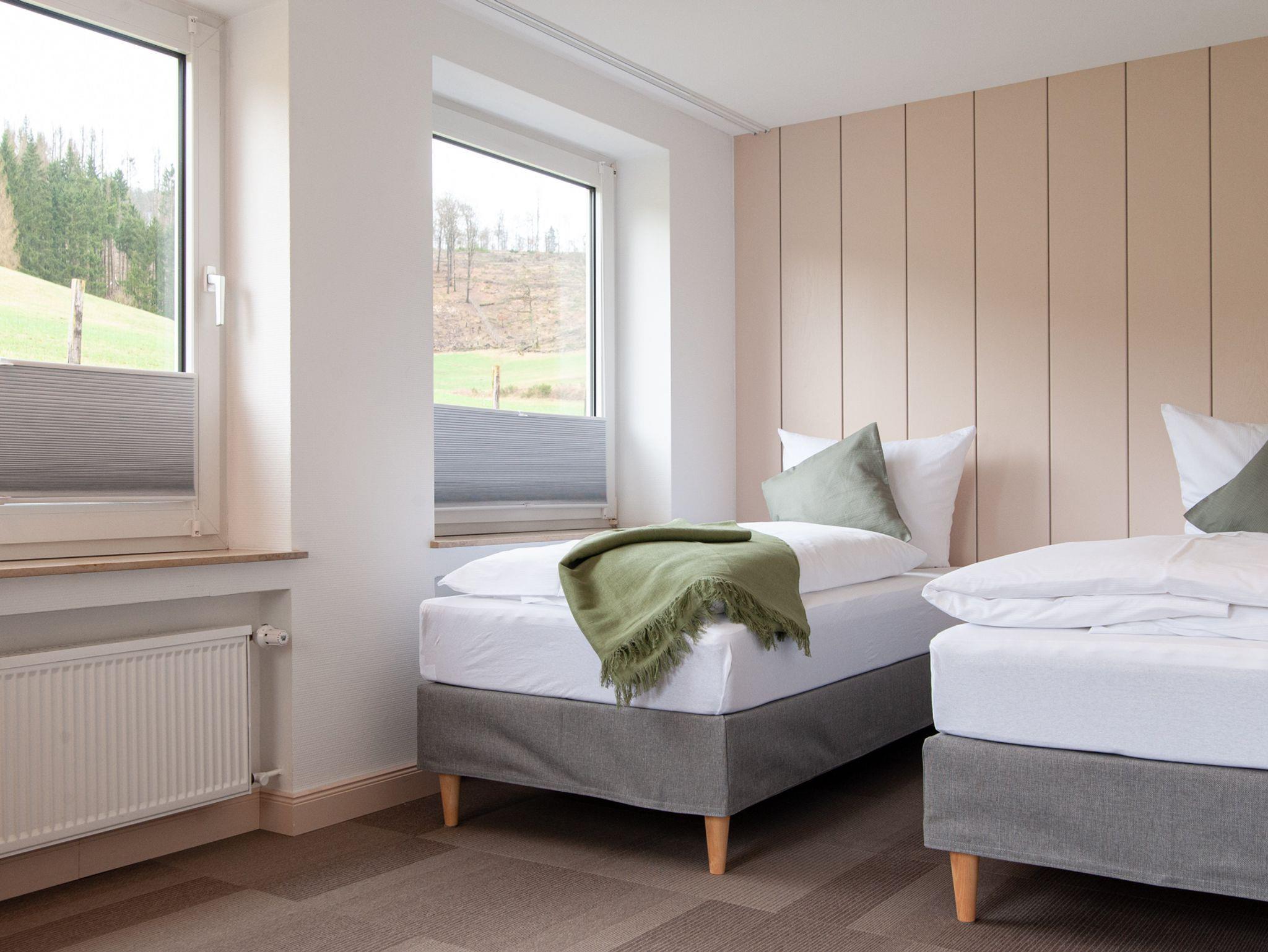 Unsere Vierbettzimmer bestehen aus einem Doppelbett und zwei Einzelbetten, in jedem Raum hängt ein Fernsehen. Zimmer Nr. 2 (ca. 27 qm) besteht aus 2 Schlafräumen und ist nur durch einen kleinen Durchgang ohne Tür getrennt. Zimmer Nr. 7 (ca. 26 qm) hat ebenfalls zwei Schlafräume, diese sind jedoch durch einen kleinen Flur voneinander getrennt und das Badezimmer liegt zwischen den beiden Räumen. Die Zimmer bieten einen Blick auf die umliegenden Wiesen und Wälder.