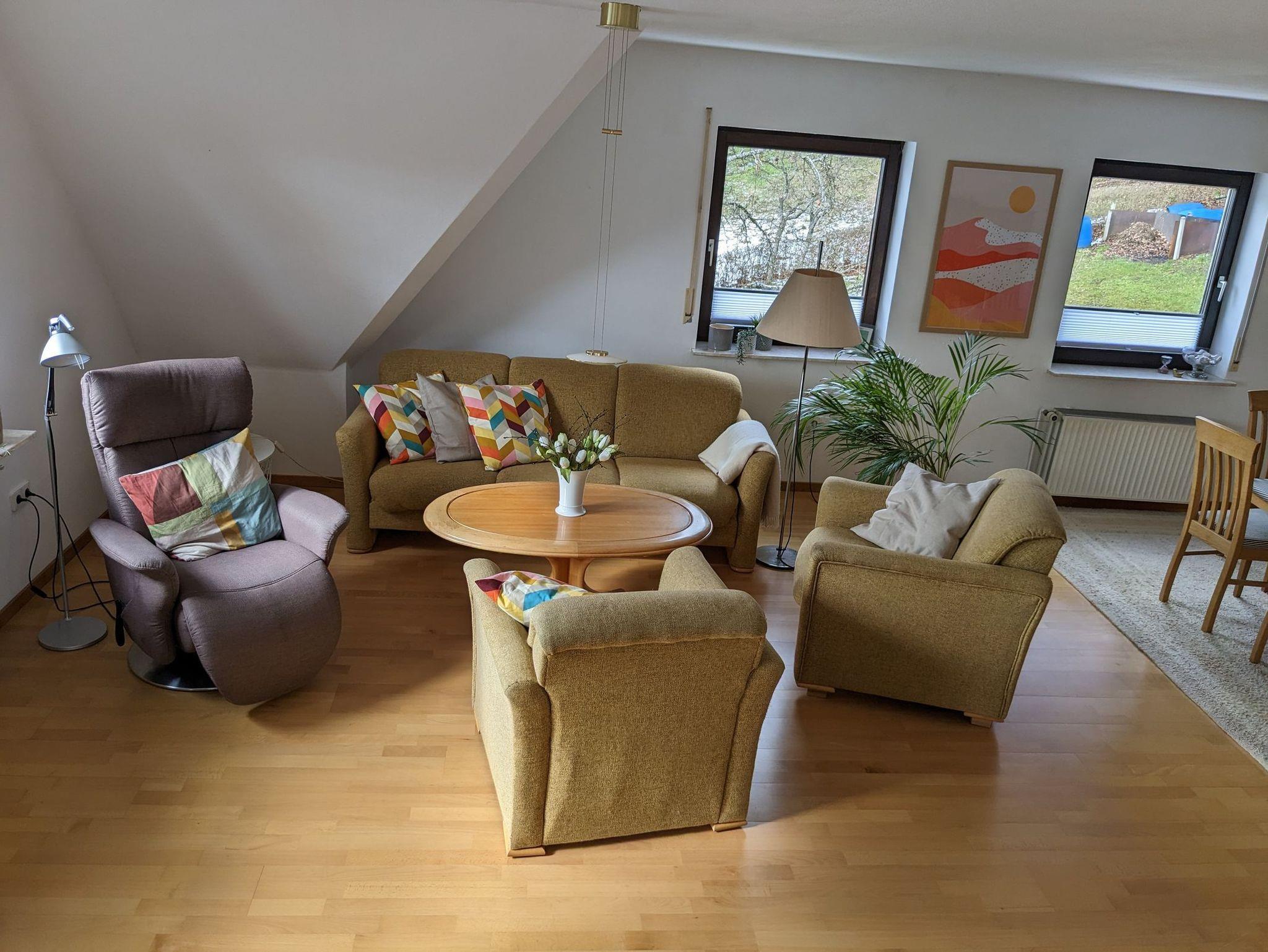 Die komplett renovierte 95 qm 4 Sterne Ferienwohnung befindet sich im Dachgeschoss und bietet eine moderne Einrichtung in heller und ansprechender Atmosphäre. Sie verfügt über 2 Schlafzimmer, ein Tageslichtbad mit Dusche, einen offenen Wohn- Essbereich mit Kachelofen, eine Küche und eine Vorratskammer. Vom Wohnzimmer aus gelangt man zur Loggia, welche Richtung Süden ausgerichtet ist. Der perfekte Ort für laue Sommerabende mit einem Glas Wein. In einer eigens eingerichteten Grillecke, können regionale Spezialitäten der nahegelegenen Hofschlachterei und Milcherei ausprobiert werden.
