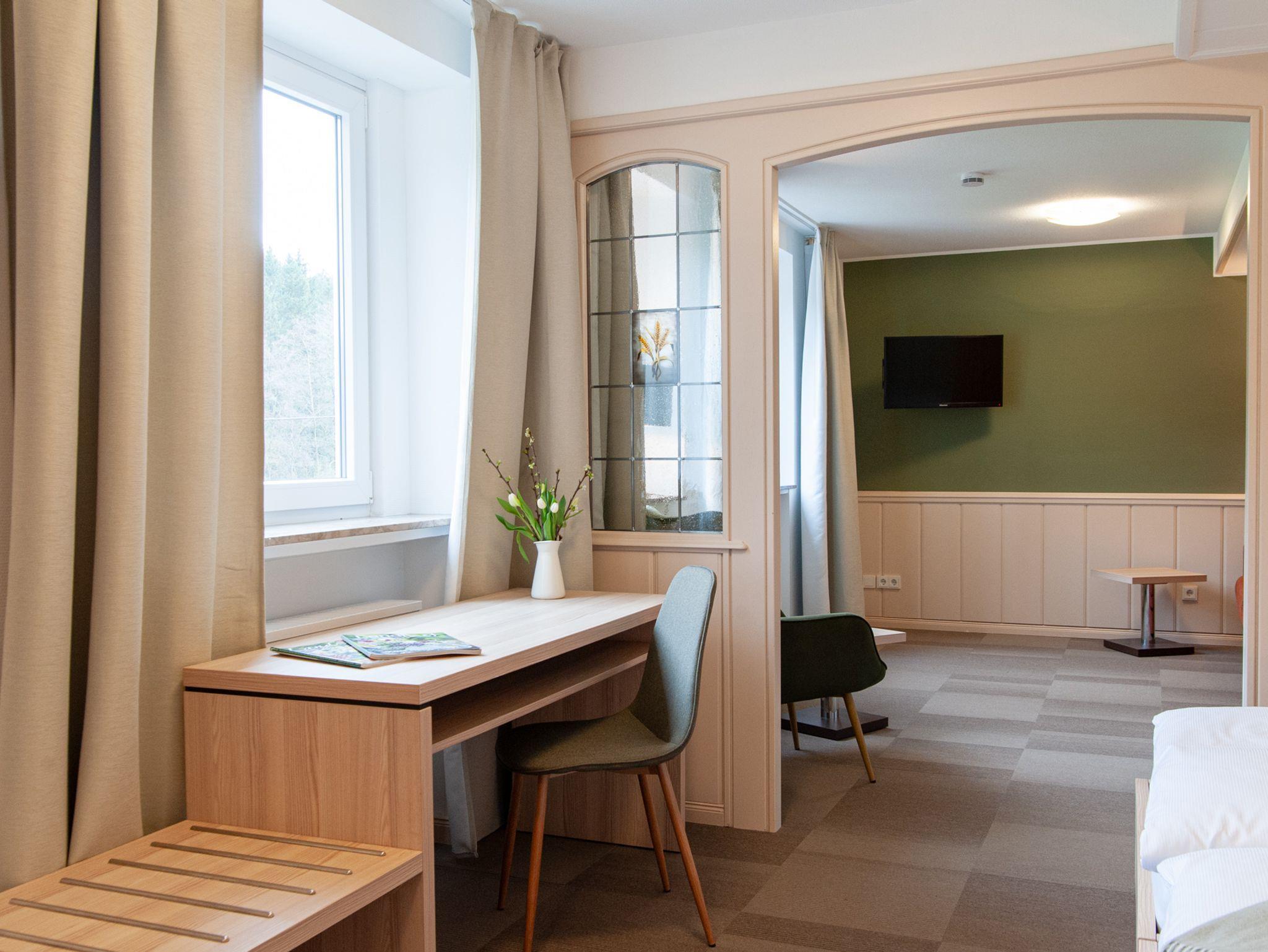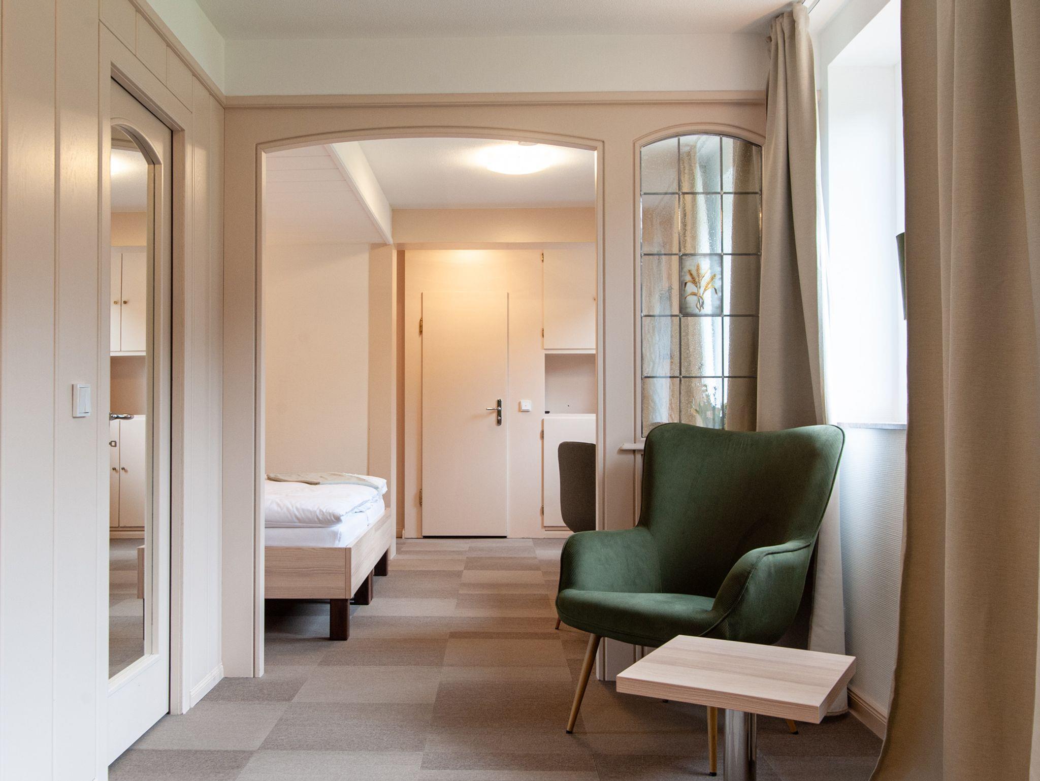 Unsere Zimmer mit Schlafcouch sind sehr hell und großzügig. Zimmer Nr. 4 (ca. 35 qm) besteht aus Wohn- und Schlafraum und hat einen begehbaren Kleiderschrank. Zimmer Nr. 9 (ca. 24 qm) liegt im Dachgeschoss und bietet absolute Ruhe. Die Zimmer haben einen wunderschönen Blick auf umliegende Wiesen und Wälder. Handtücher und Bettwäsche sind inklusive.