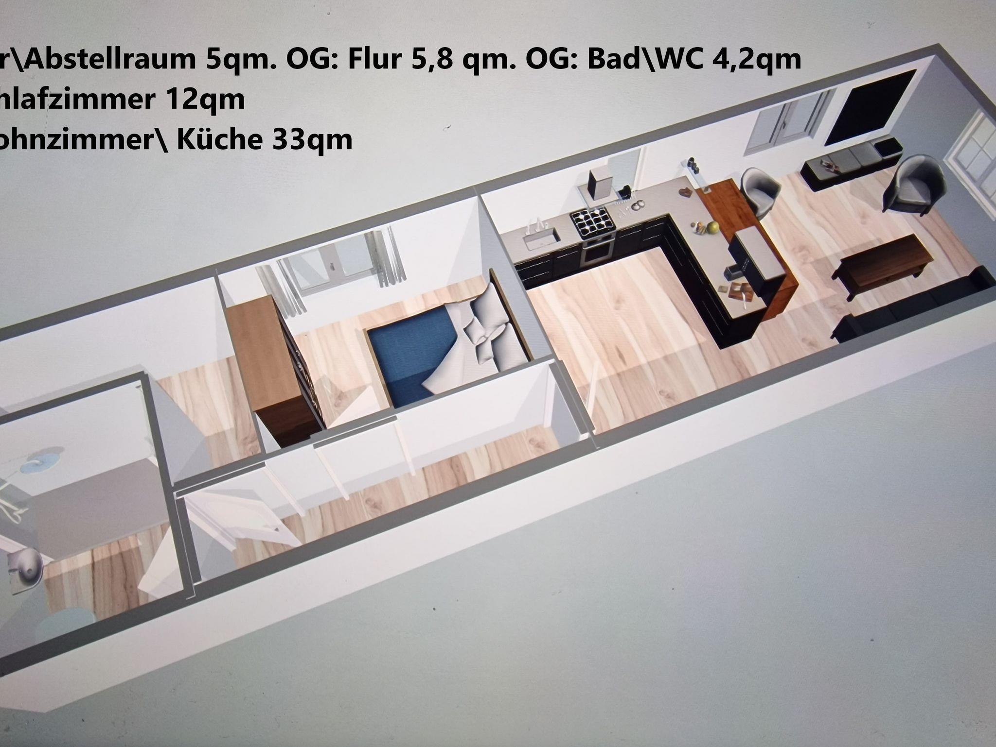 Die Ferienwohnung befindet sich in einem Nebengebäude des Haupthauses und wurde in 2023 aufwendig renoviert, unter Anderem mit neuen 4fach verglasten Lärmschutzfenstern mit Rollläden.