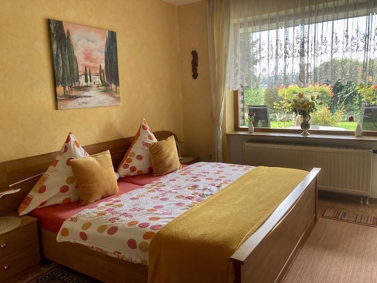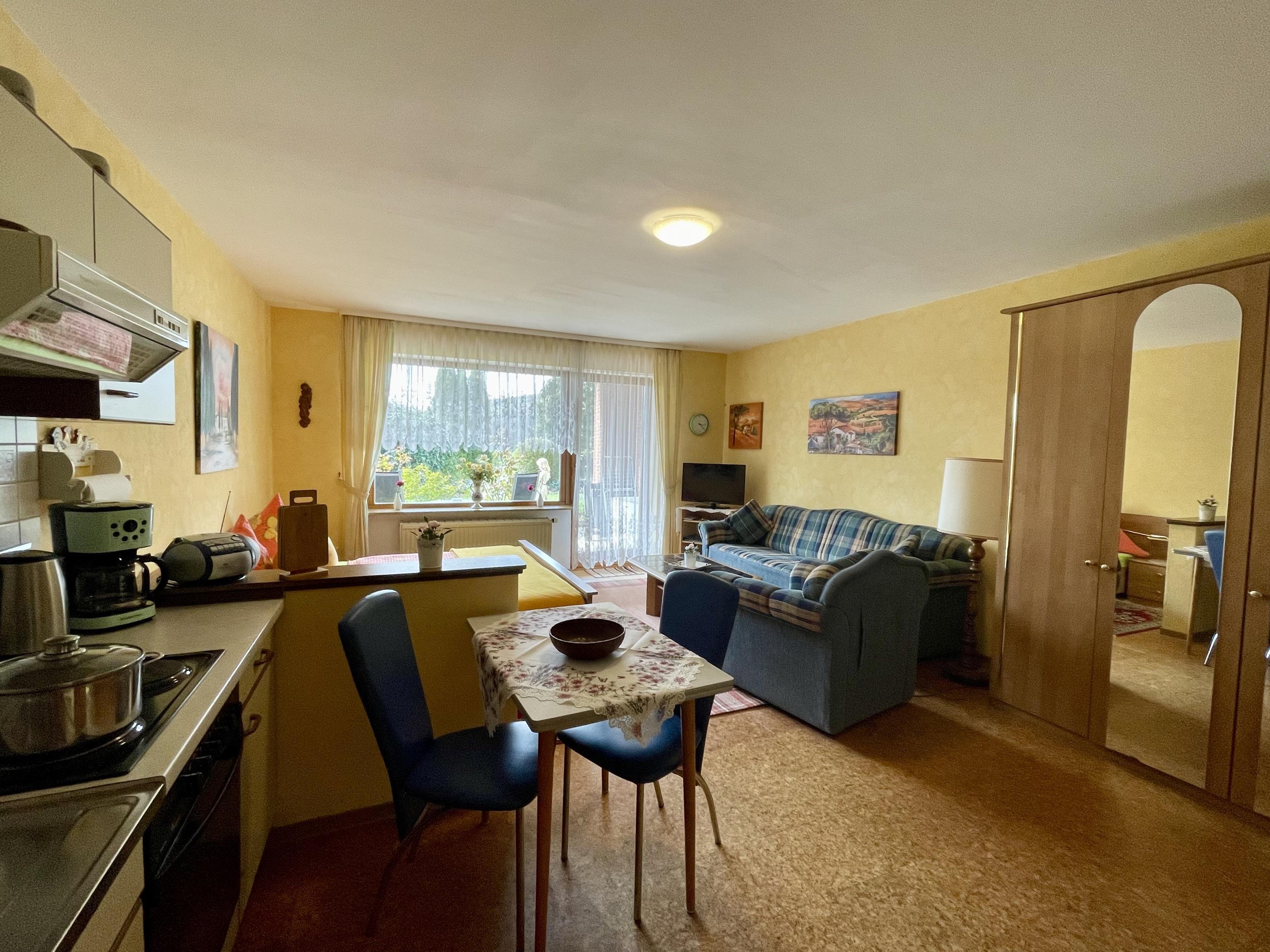 Erdgeschosswohnung - 35qm, Wohn- Schlafraum mit großen Doppelbett, verstellbaren Lattenrost, gute Qualitätsmatratzen, geräumigen Kleiderschrank,