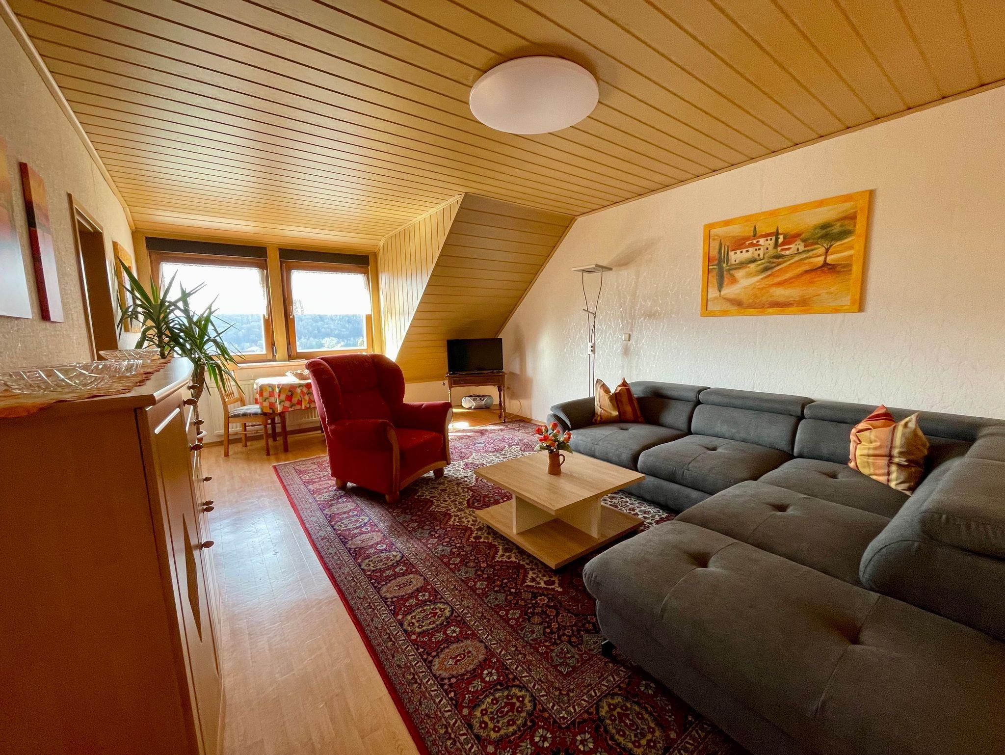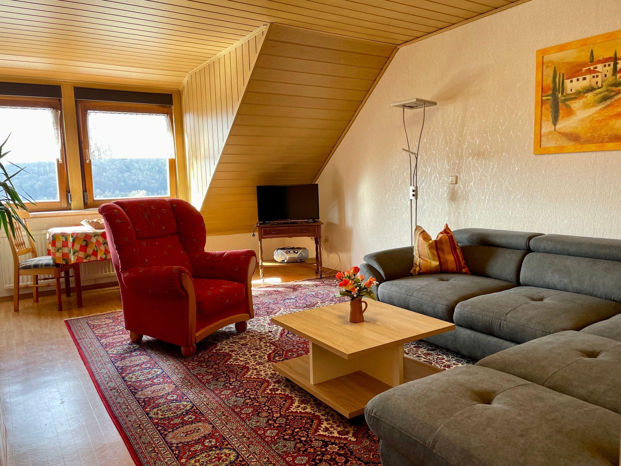 * Großes Wohnzimmer mit bequemer Couchgarnitur + Sessel, Essecke mit wunderschönen Weitblick, Sat-TV, Radio/CD-Player.
