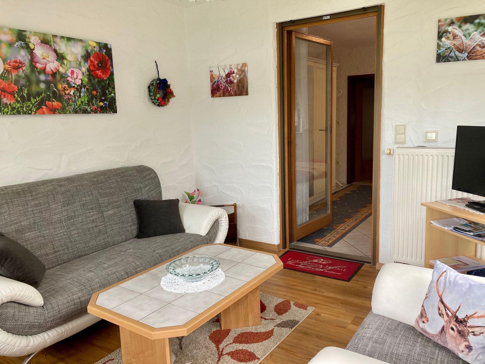 Das Wohnzimmer befindet sich im Wintergarten mit direkten Zugang zur überdachten Südterrasse, bequeme Couch + Sessel, Flachbildschirm-TV, Radio/ CD-Player, Wohnküche mit Essecke und Schlafcouch für 2 Personen, Kühlschrank, ausreichend Küchenutensilien, Herd, Backofen....., DU/WC, DU mit Haltegriff, Duschmatte + Duschhocker, Fön.