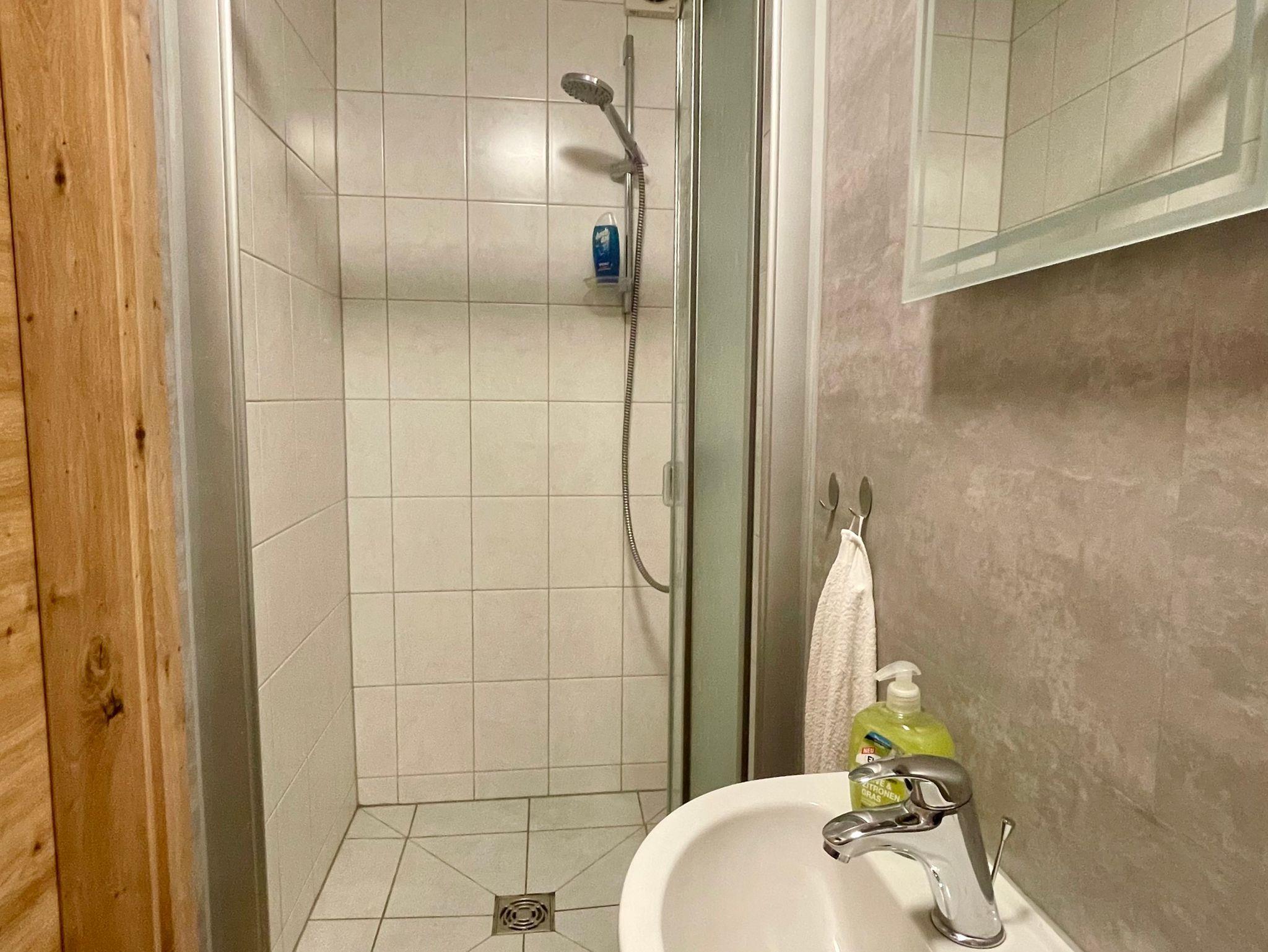 Das Badezimmer verfügt über eine Dusche, ein WC, ein kleines Waschbecken sowie einen Föhn.