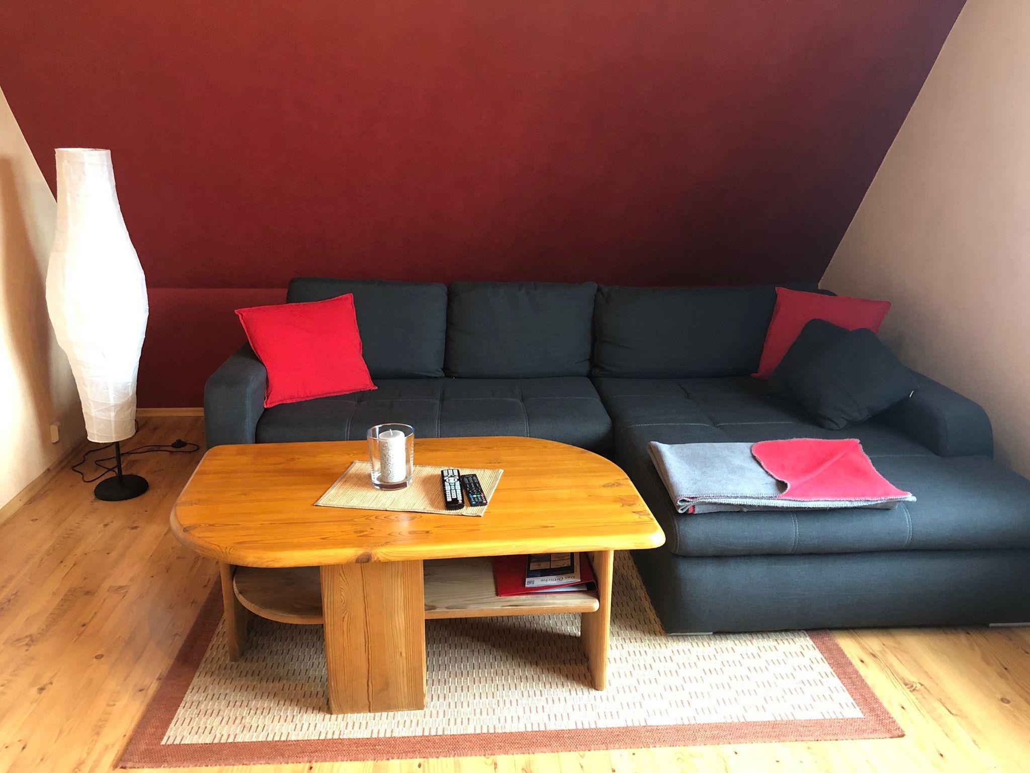Die 2-Zimmer-Nichtraucher-Wohnung für 2 Personen (Wohnzimmer, Schlafzimmer, Küche und Bad) liegt in der 1. Etage (ca. 47 qm, Schrägen). Die Tür zur Ferienwohnung liegt im EG/ Vorflur. Eine Treppe führt in den oberen Flur (Korkboden), hier oben befindet sich keine Tür-Abgrenzung zur Treppe. Alle Räumlichkeiten sowie die Dachterrasse sind vom Flur aus begehbar. TV, Radio, CD- und DVD-Player, Wäscheständer, Bügeleisen und Bügelbrett gehören zur Ausstattung. Nach Absprache bieten wir: Einkaufsservice vor Anreise, Getränkeservice, Reinigungsservice während des Aufenthaltes. Sprechen Sie uns auch gerne an, wenn Sie sich ein Kanu zum Schippern auf der Au ausleihen möchten. Informationen über die Region und diverse Veranstaltungen finden Sie in einer Mappe, die in der Wohnung ausliegt.