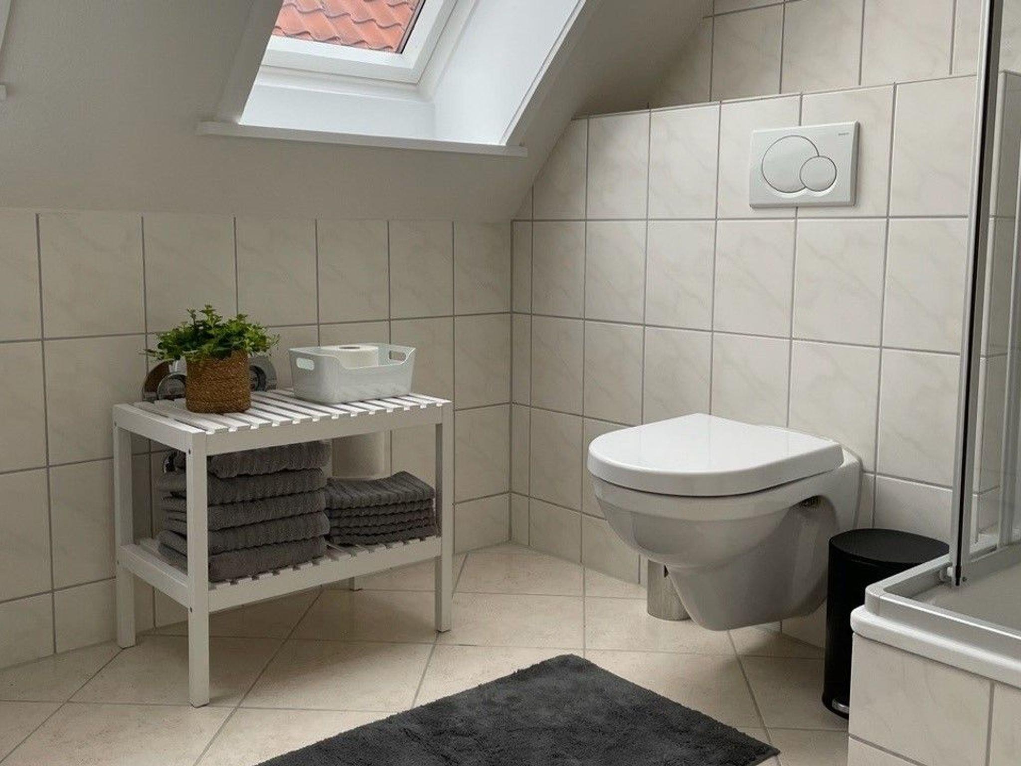 Das moderne Badezimmer verfügt unter anderem über Waschbecken, WC, Dusche und eine Waschmaschine. Außerdem stellt der Gastgeber frische Seifen bereit.
