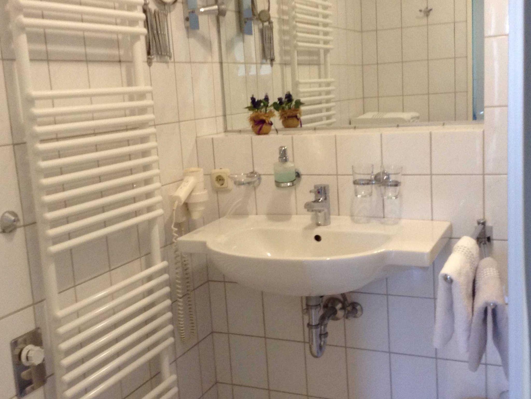 Im Duschbad finden Sie einen Haartrockner, Handtuchtrockner und einen Kosmetikspiegel.