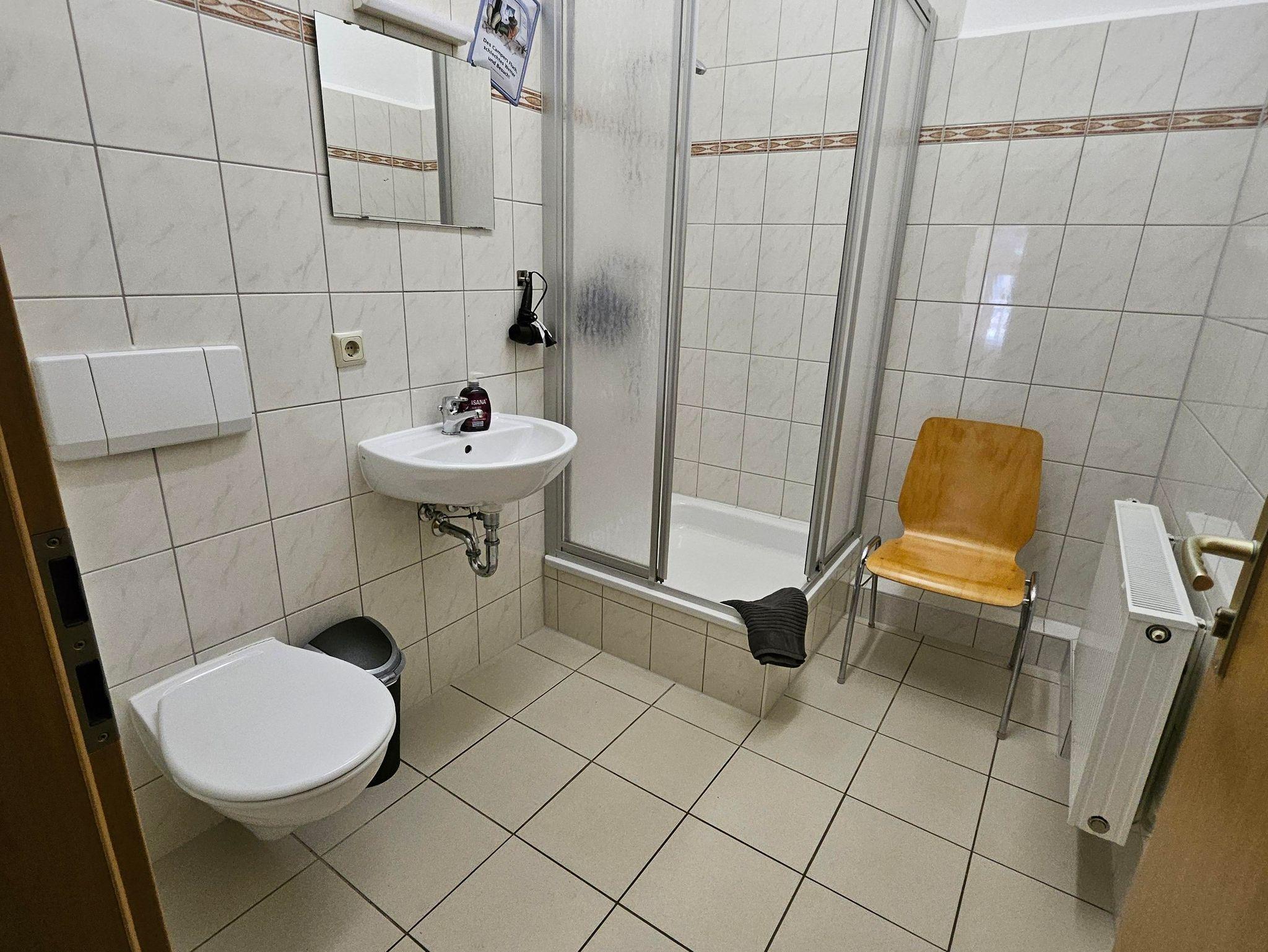 Sie haben hier ein Schlafzimmer mit 4 Einzelbetten und das Bad nutzen Sie auserhalb Ihres Zimmers. Dafür halten wir getrente WC´s und Duschen (mit eigenen Kabienen) für Sie bereit.