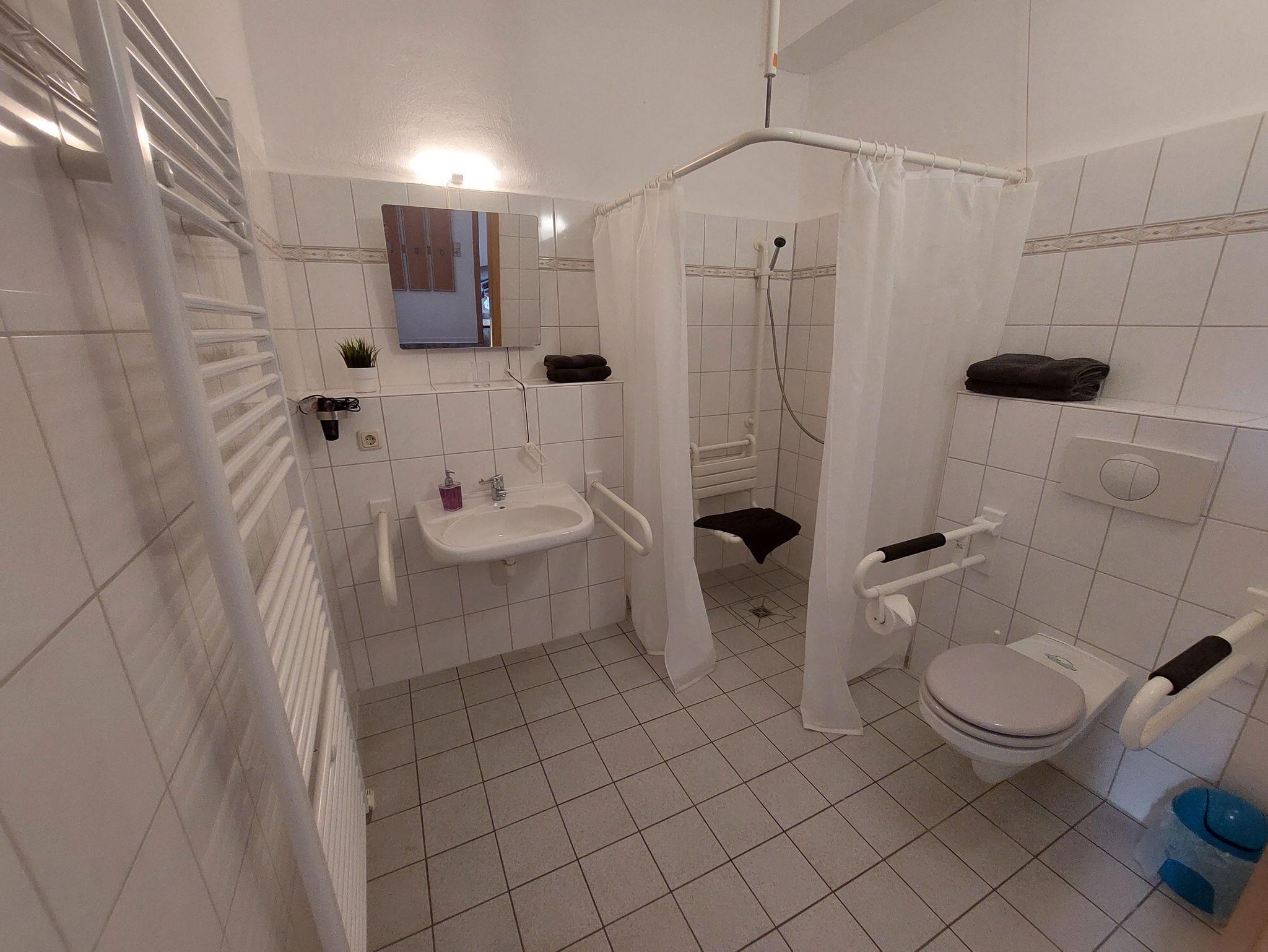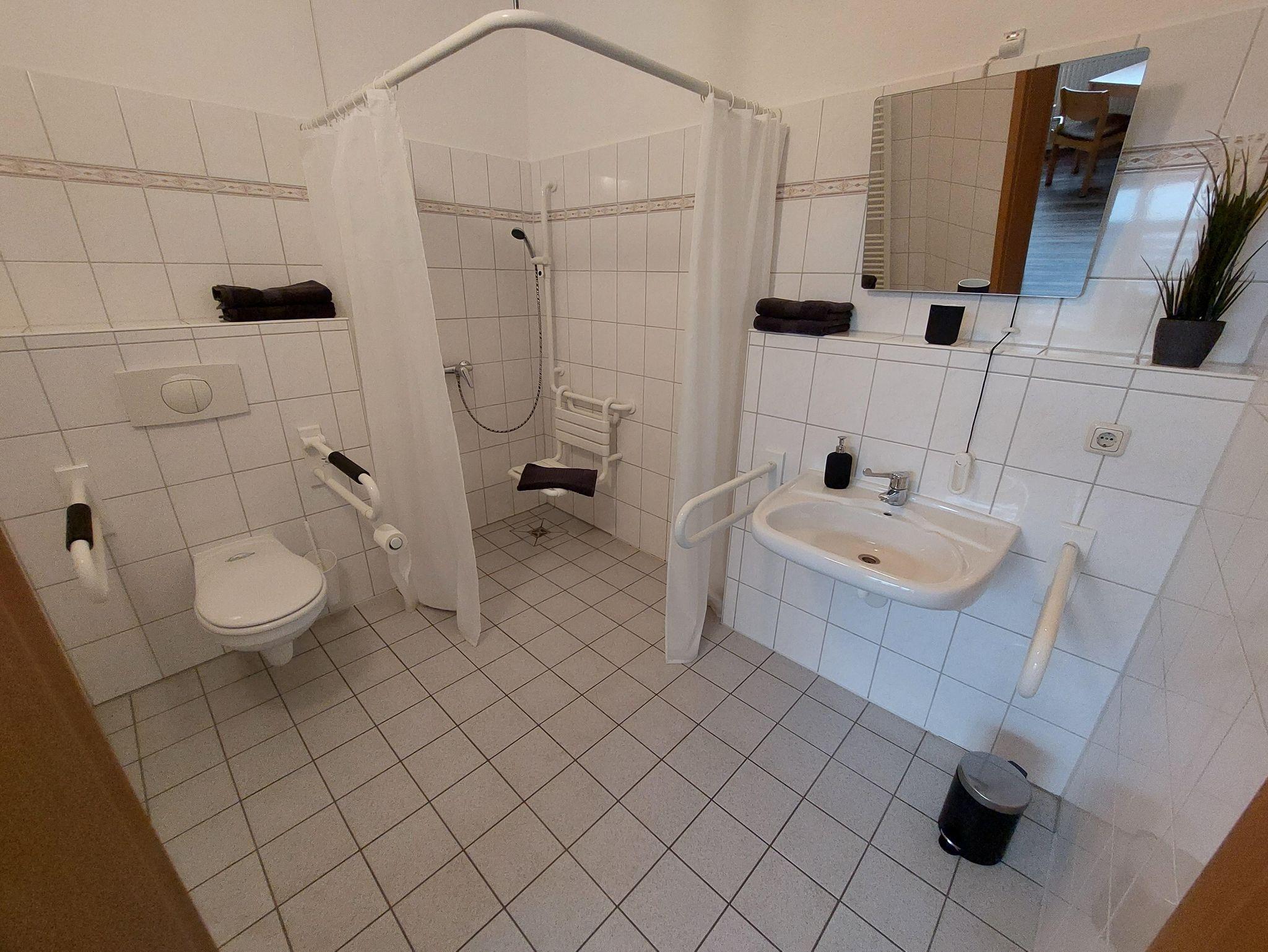 In unseren barierefreien Doppelzimmer ist für Sie genügend Platz. Auch das Badezimmer mit ebenerdiger Dusche bietet alles was Sie benötigen, wenn Sie es barierefrei benötigen. Auch alle anderen Gäste dürfen das großzügige Doppelzimmer nutzen. Das ganze Erdgeschoss ist barierefrei angelegt und für die drei Stufen im Haus zum Gemeinschaftsraum haben wir extra einen Hebelift eingebaut. So sind Sie überall dabei ohne Einschränkungen.