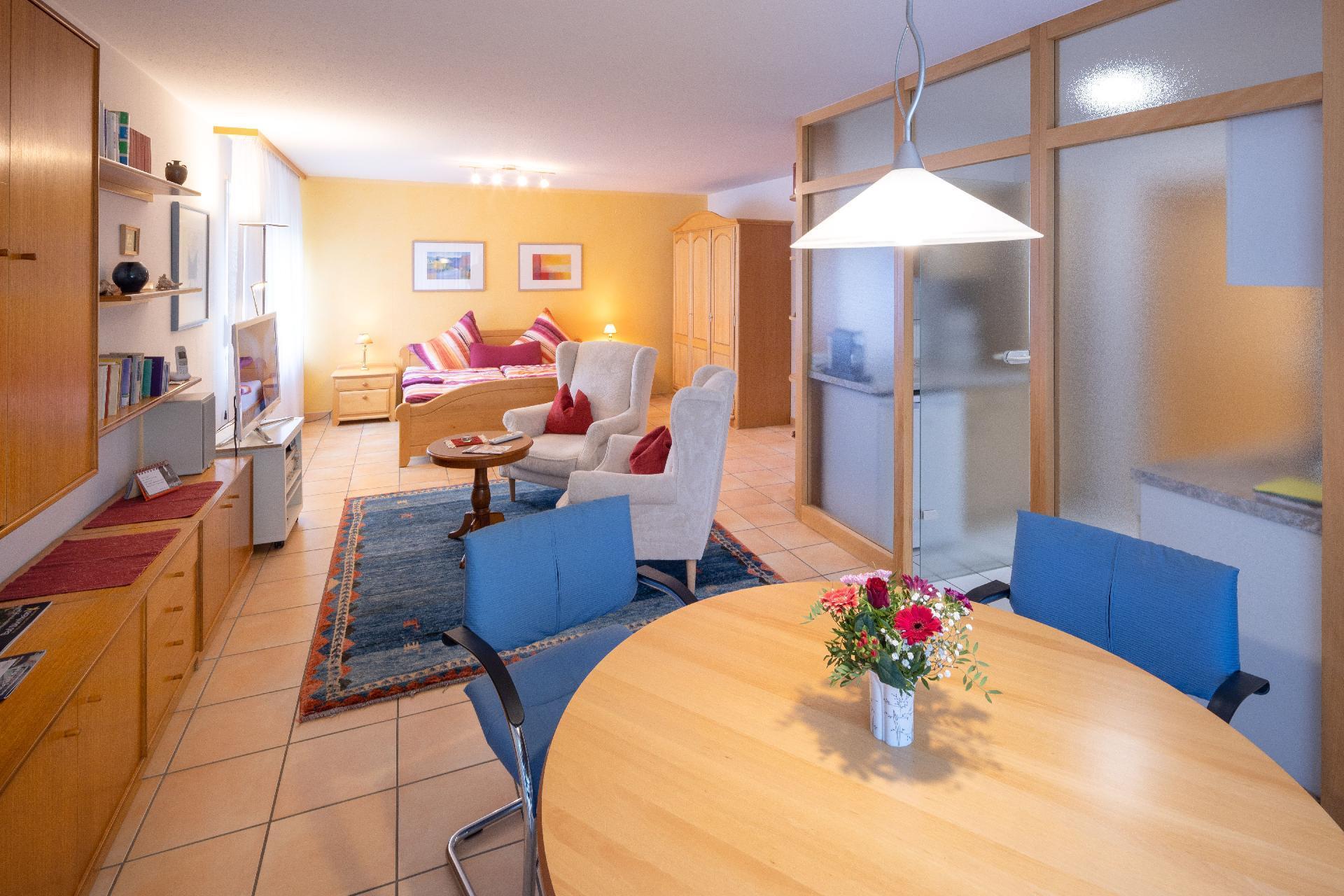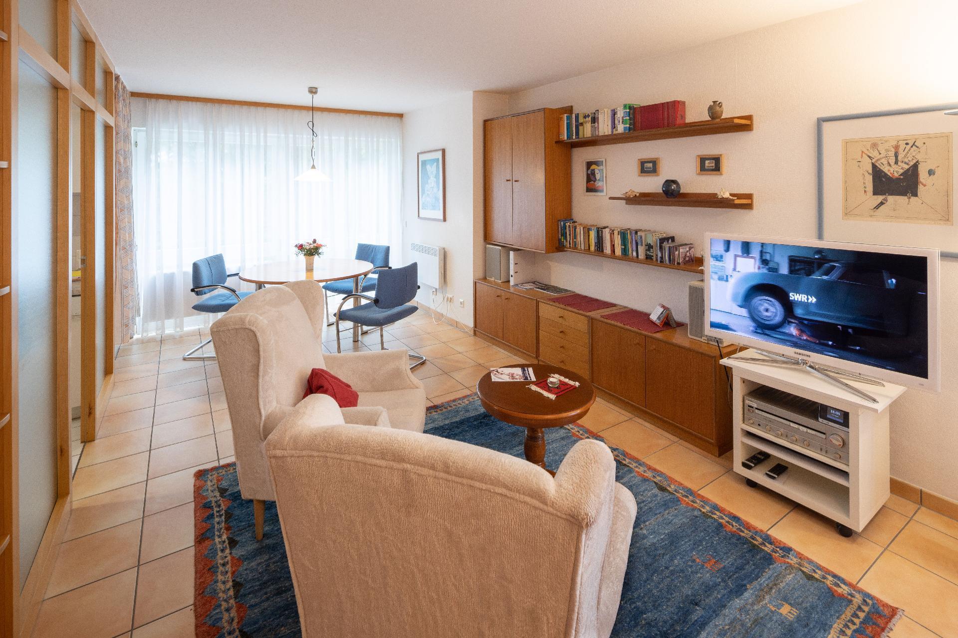 The studio (45 m2) is suitable for up to two people. It consists of a large living room/bedroom (33 m²), a fitted kitchen (dishwasher, coffee machine, microwave) and a bathroom with shower and WC. The living room is furnished with a double bed, wardrobe, two armchairs with coffee table, a wall unit and a dining table with 4 chairs. Other equipment: telephone, radio, large television, cable TV, DVD player. The flat has an east-facing terrace (approx. 10 m²) and a seating area in the south-facing garden.