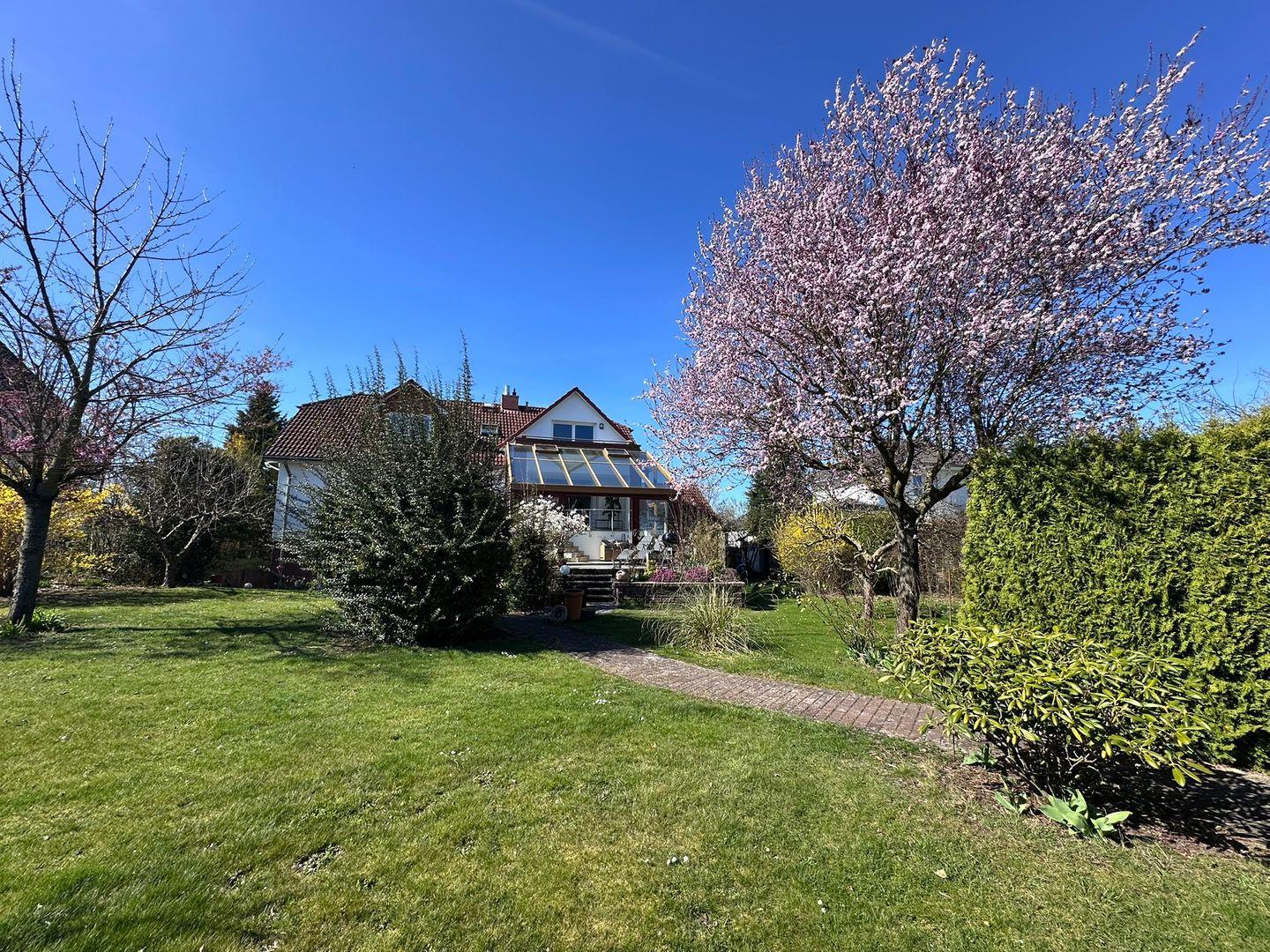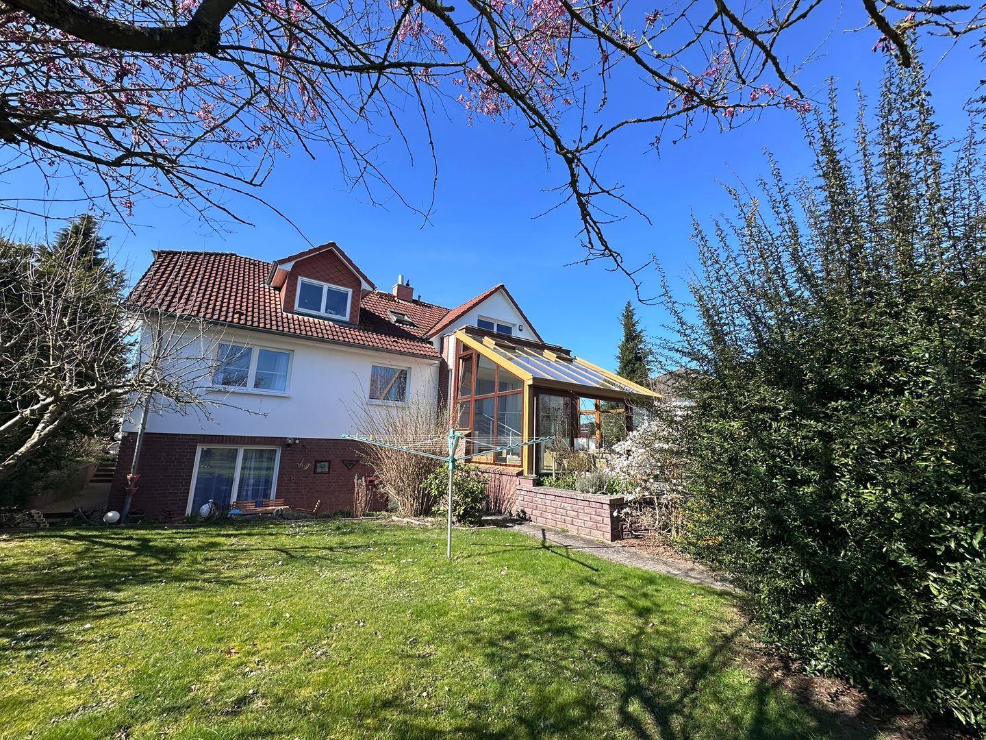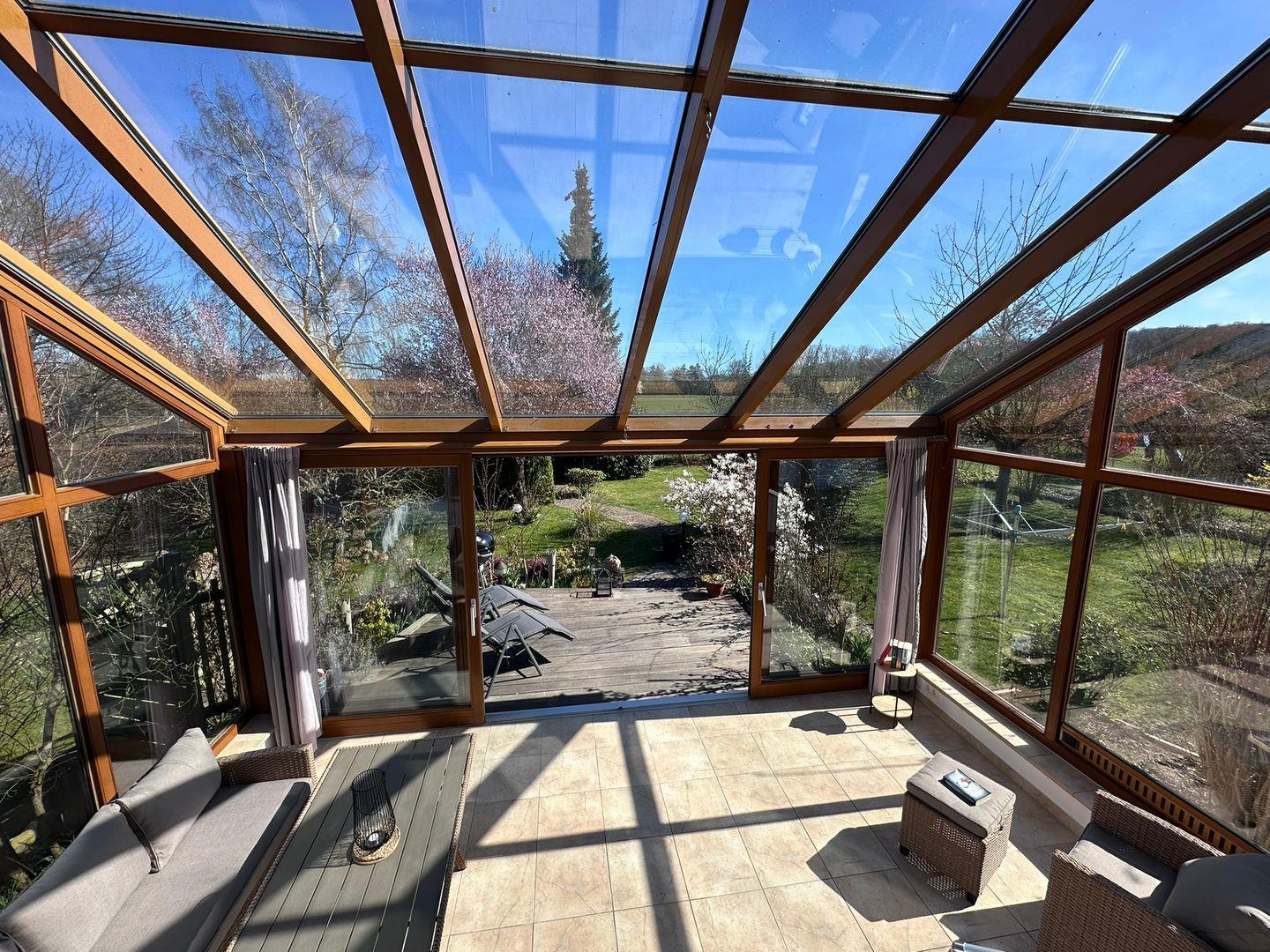 Ein besonderes Highlight des Hauses ist der Wintergarten, der Ihnen einen schönen Blick auf den Garten bietet und sich perfekt eignet, um auch an kühleren Tagen das Tageslicht zu genießen. Die überdachte Terrasse lädt dazu ein, im Freien zu speisen oder einfach nur die Ruhe und den Blick in den Garten zu genießen. Der Garten selbst ist mit Gartenmöbeln und einem Grill ausgestattet, ideal für gesellige Barbecues mit der Familie oder Freunden.