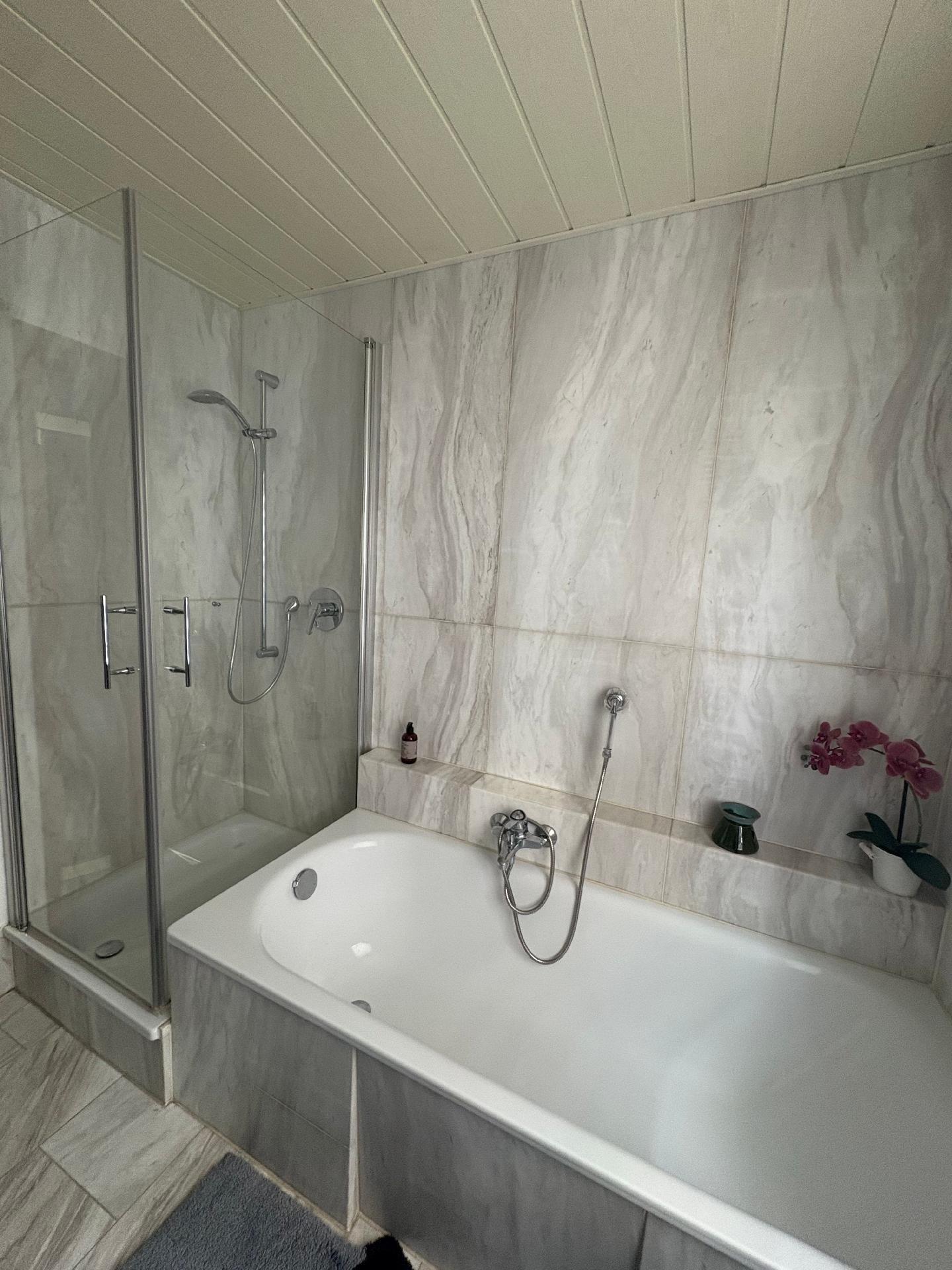 The bathroom has a shower and a bathtub. There are plenty of towels and everything is ready when you arrive. The beds are freshly made.