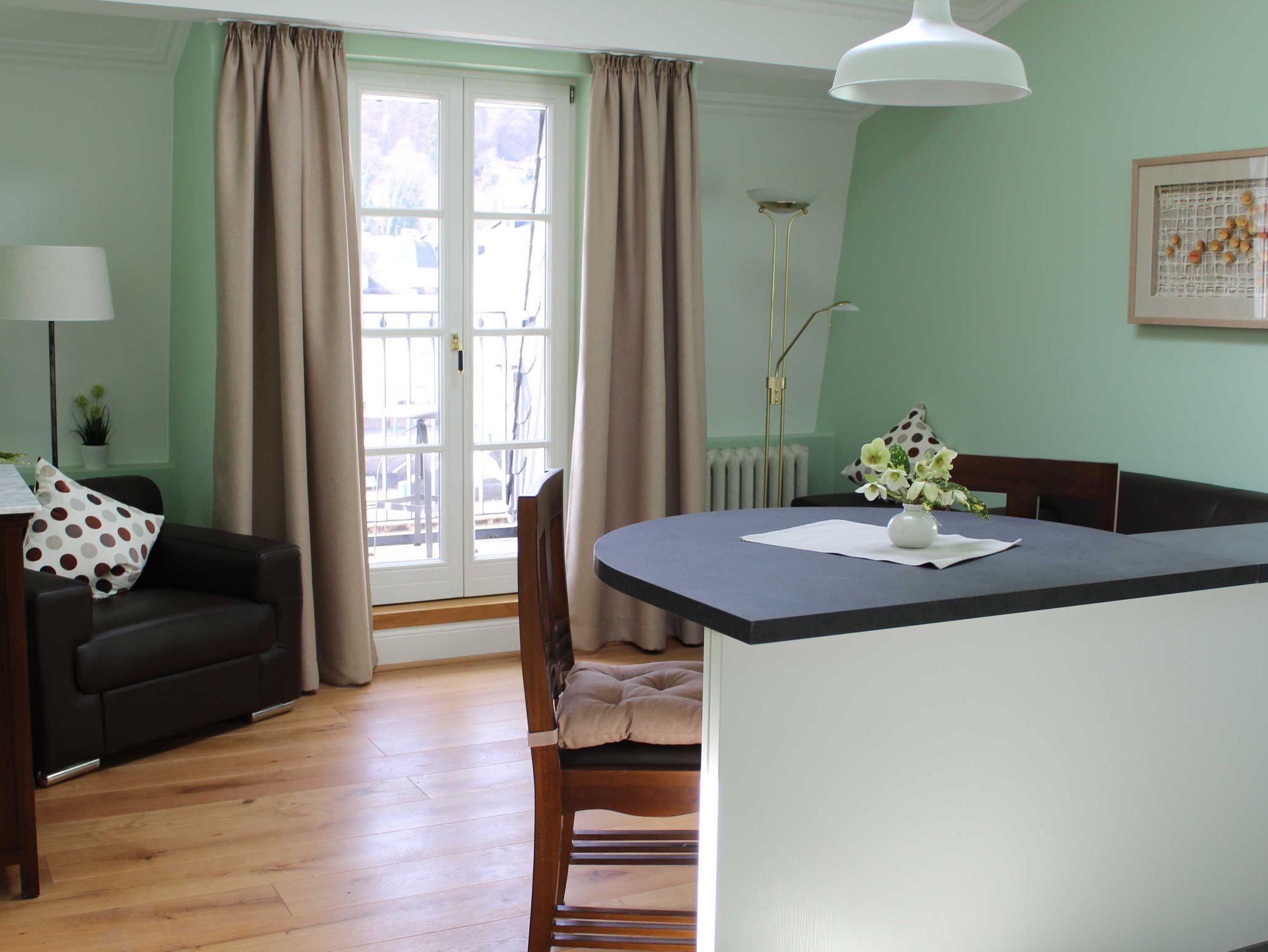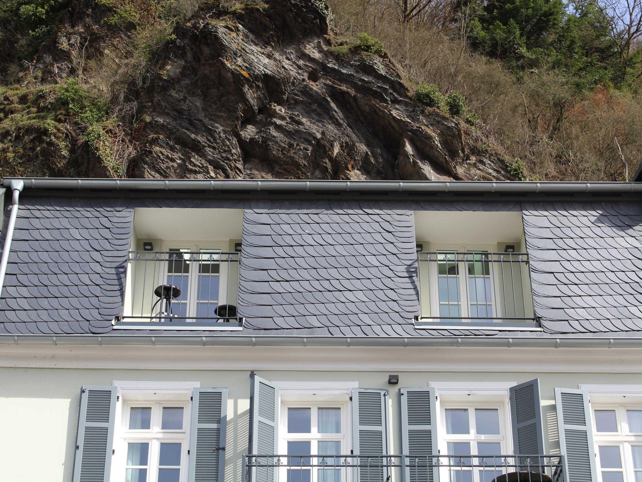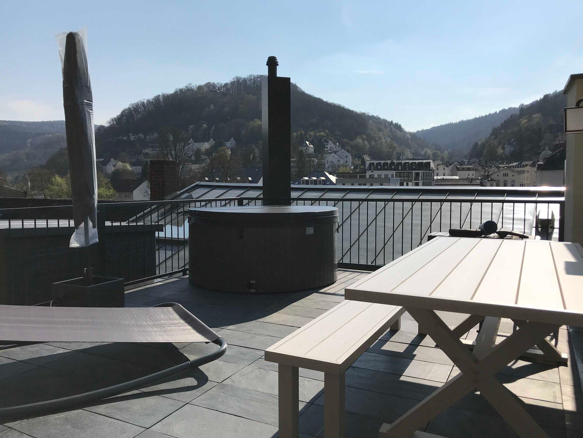 Schlafzimmern, Bad, Wohnzimmer mit Küchenzeile und Loggia zum Fluß und Blick auf das Kurzentrum. Das Schlafzimmer ist mit einem Boxspringbett und hautfreundlicher Baumwollbettwäsche ausgestattet. Es liegen Frottierhandtücher, Bademantel und Badetücher bereit. Vom Schlafzimmer gibt es einen eigenen exklusiver Zugang zur Felsendachterrasse mit Jacuzzi, Schaukelliege, Grillstation phantastischem Ausblick auf das Kurzentrum von Bad Ems und das hauseigene Felsenmassiv. An die Wohnung angrenzend kann für Bedienstete das 1-Zimmer Apartment 'Le Service' hinzugebucht werden (Buttler, Dolmetscher, Tourist-Guide, Kosmetiker, etc.) - wie zu Kaiser's Zeiten.