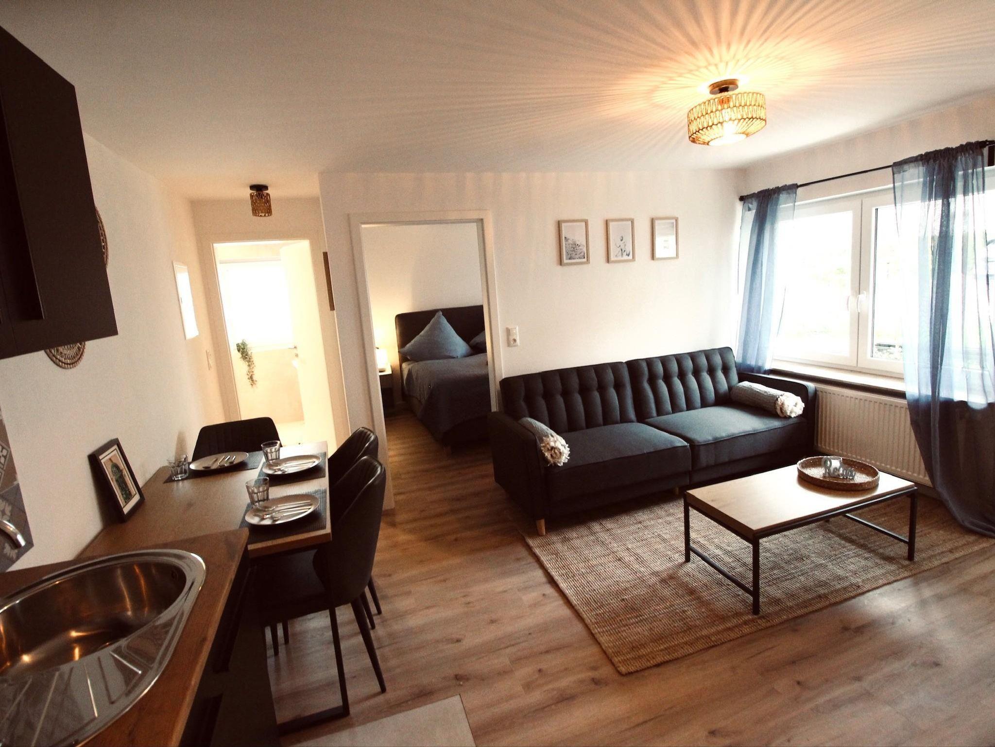 Ferienwohnung „Yacoub“ (ca. 50 m² | bis zu 3 Personen) Elegant und gemütlich – ideal für Paare oder kleine Gruppen. Ein Schlafzimmer mit einem großen Boxspringbett, eine komfortable Schlafcouch im Wohnbereich, eine moderne Küche und ein behaglicher Essbereich lassen keine Wünsche offen. Natürlich auch mit Zugang zum Grillplatz.