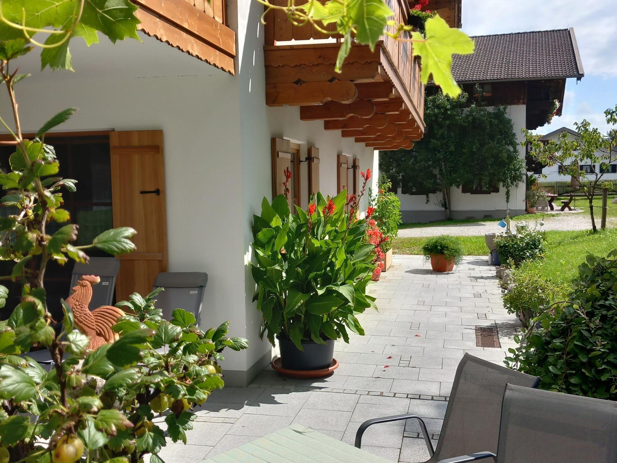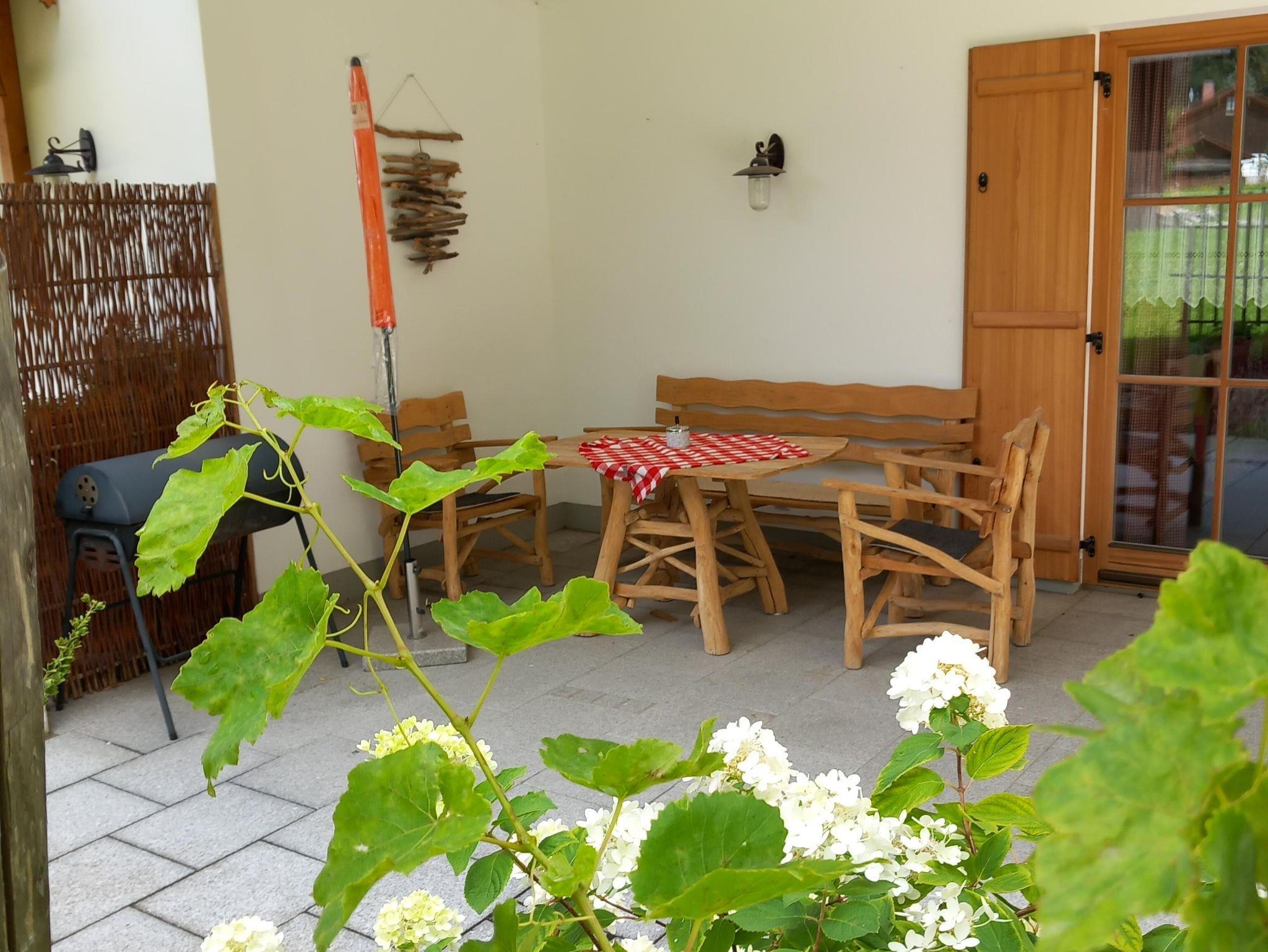 Genießen Sie auf unserer großen überdachten Terasse den Blick zum Hocheck und zum Auerberg.
