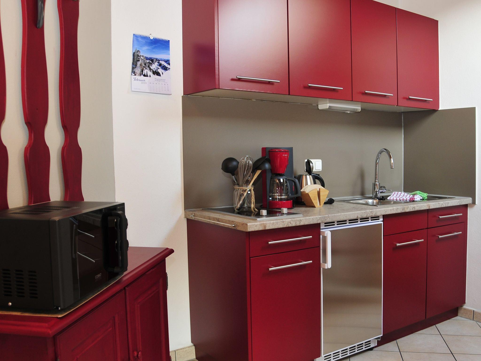 Ferienwohnung für 2 bis 4 Personen. 41 m². 2. Stock, Studio, nach Süden gelegen. Wohnraum mit Couchgarnitur, Fernseher, Radio mit Bluetooth, W-LAN kostenlos, Küche mit Essplatz, Mikrowelle, Kaffeemaschine, Wasserkocher, Toaster, Geschirr für 4 Personen, Doppelschlafzimmer, Bettcouch im Wohnzimmer für 2 Personen geeignet, Dusche mit WC, Föhn, Flur, Großer Südbalkon mit Tisch und 2 Stühlen.