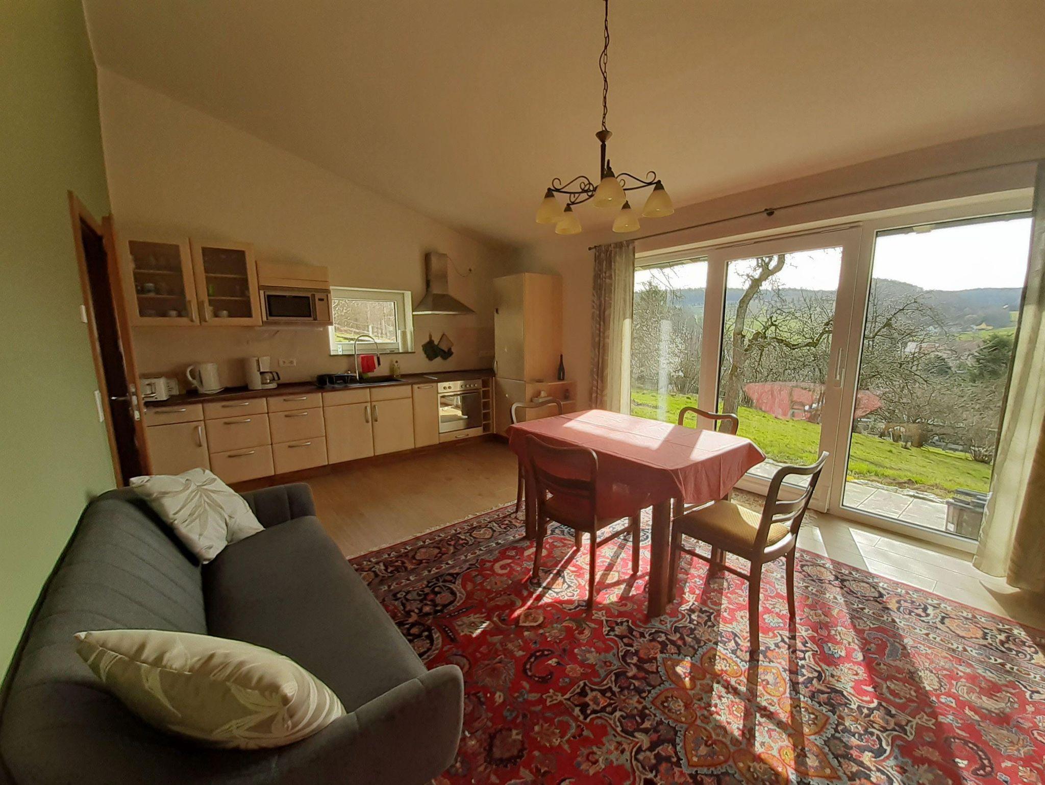 Die Terrasse bietet eine hervorragende Aussicht auf die Streuobstwiese und das im Tal gelegene Dorf. Gern können wir unsere Gäste mit Kräutern und Gemüse aus unserem Garten sowie Eier von unseren Hühnern versorgen. Bei Bedarf stellen wir ein Kinderreisebett und einen Hochstuhl zur Verfügung.