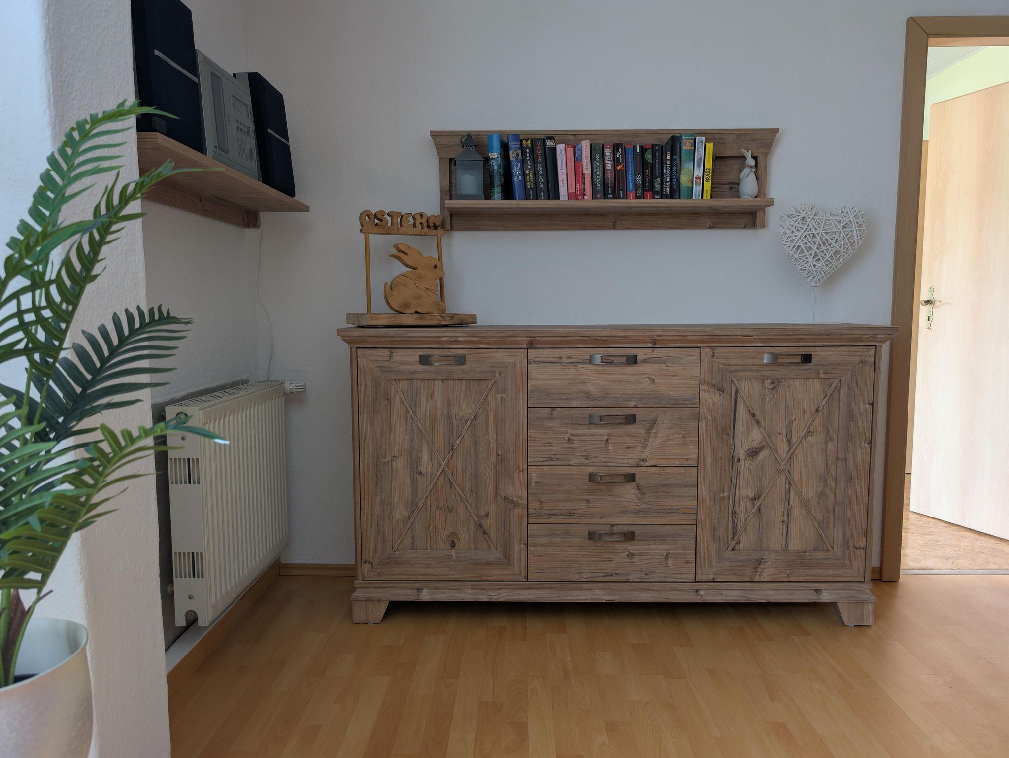 Die Küche ist ausgestattet mit Kochutensilien, Wasserkocher, Mikrowelle, Tischgeschirrspüler und Backofen sowie einem Essplatz für 2 Personen. Der Wohnbereich ist mit einer Sitzecke und Sat-TV eingereichtet. Für die kühlere Jahreszeit sorgt der Kaminofen für eine gemütliche Atmosphäre.
