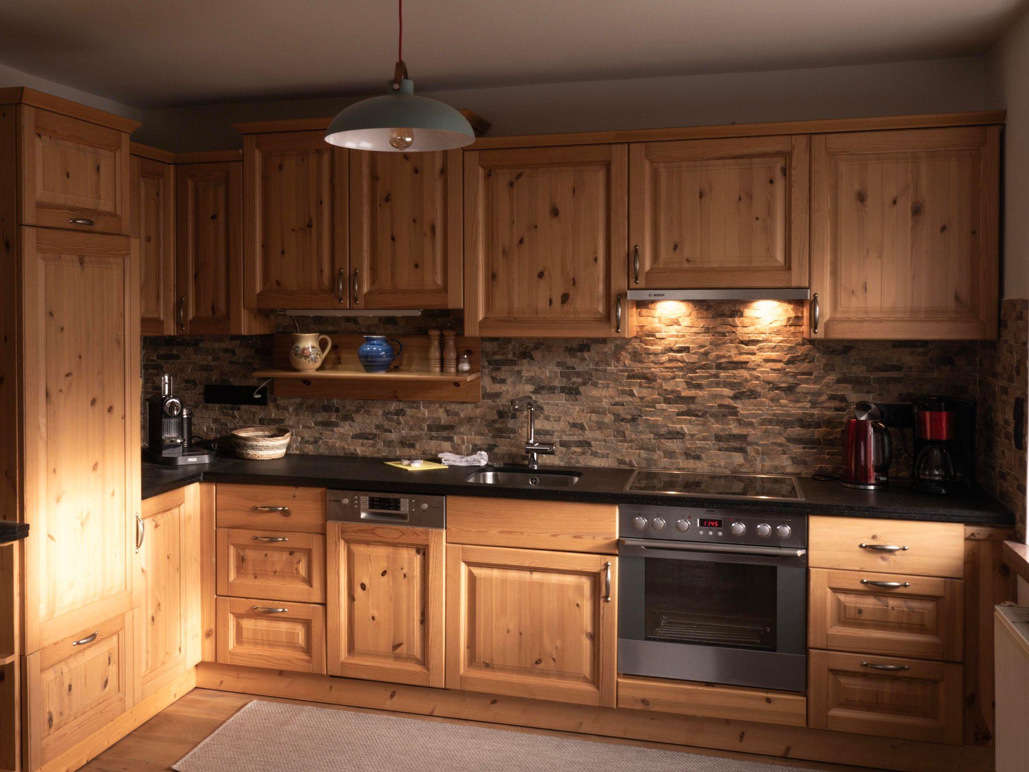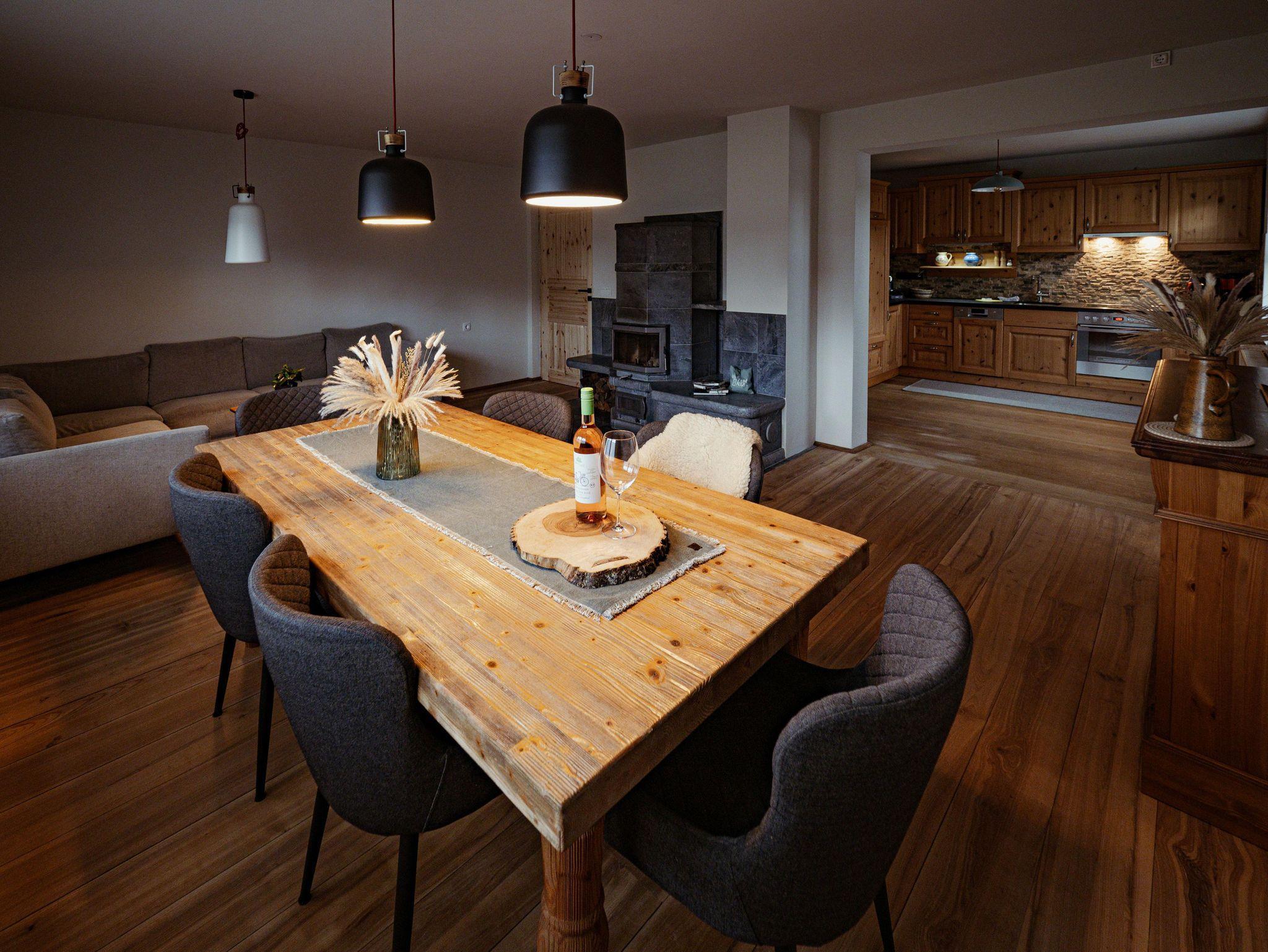 Die Vollholzküche, der Dielenboden und der Specksteinofen schaffen eine warme Atmosphäre im Erdgeschoss. Die separate Küche ist mit Geschirrspüler, Backofen, Kaffeemaschine, Kühlschrank und Wasserkocher ausgestattet. Im Wohnbereich steht eine gemütliche Sitzecke, TV und ein Essplatz für 6 Personen zur Verfügung.