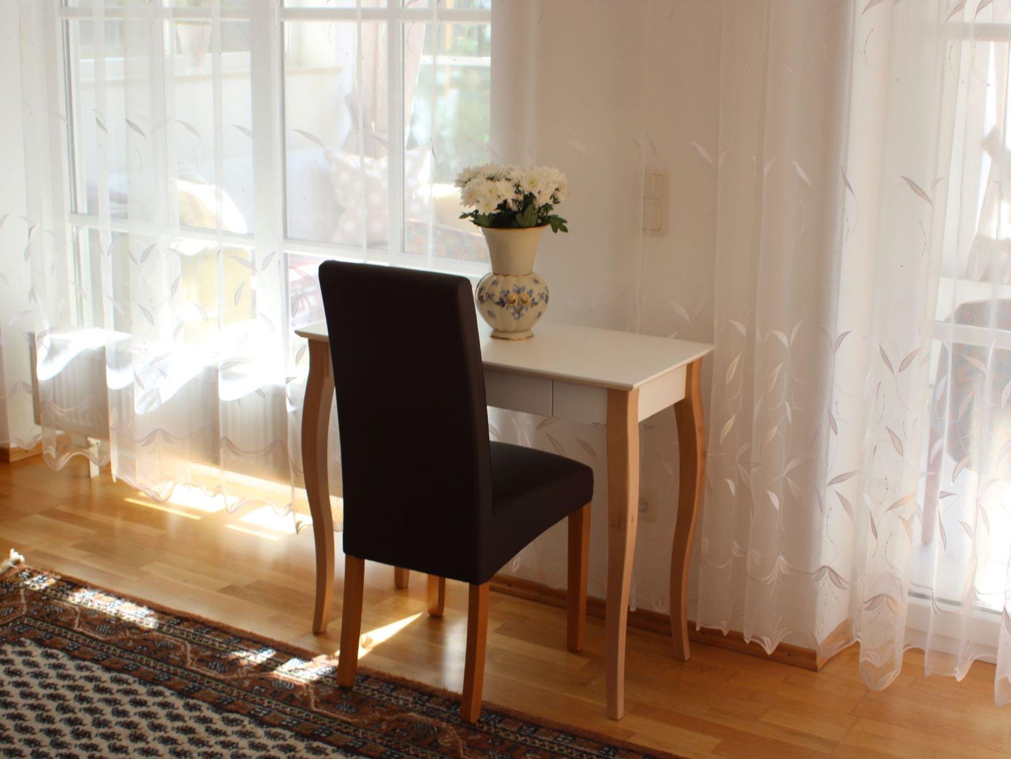 Die Ferienwohnung Veronika ist eine liebevoll eingerichtete Ferienwohnung mit einer Größe von etwa 60 Quadratmetern für bis zu 2 Personen, mit separatem Eingang und Wintergarten in Südwestlage. Die Wohnung ist komplett eingerichtet und entspricht heutigen modernen Anforderungen. Sie verfügt über ein Schlafzimmer mit Doppelbett und Schrank, ein großzügiges Wohnzimmer mit Sat-TV (Flachbildschirm)und Sofa, einen Wintergarten sowie eine Einbauküche, welche mit Backofen, Kühlschrank, Spülmaschine, Mikrowelle, Kaffeemaschine, Toaster sowie Geschirr und Küchenwäsche komplett ausgestattet ist. Das Badezimmer verfügt über Wachbecken, WC und Badewanne. In den wärmeren Monaten laden ein Garten und eine Terrasse zum Entspannen ein.