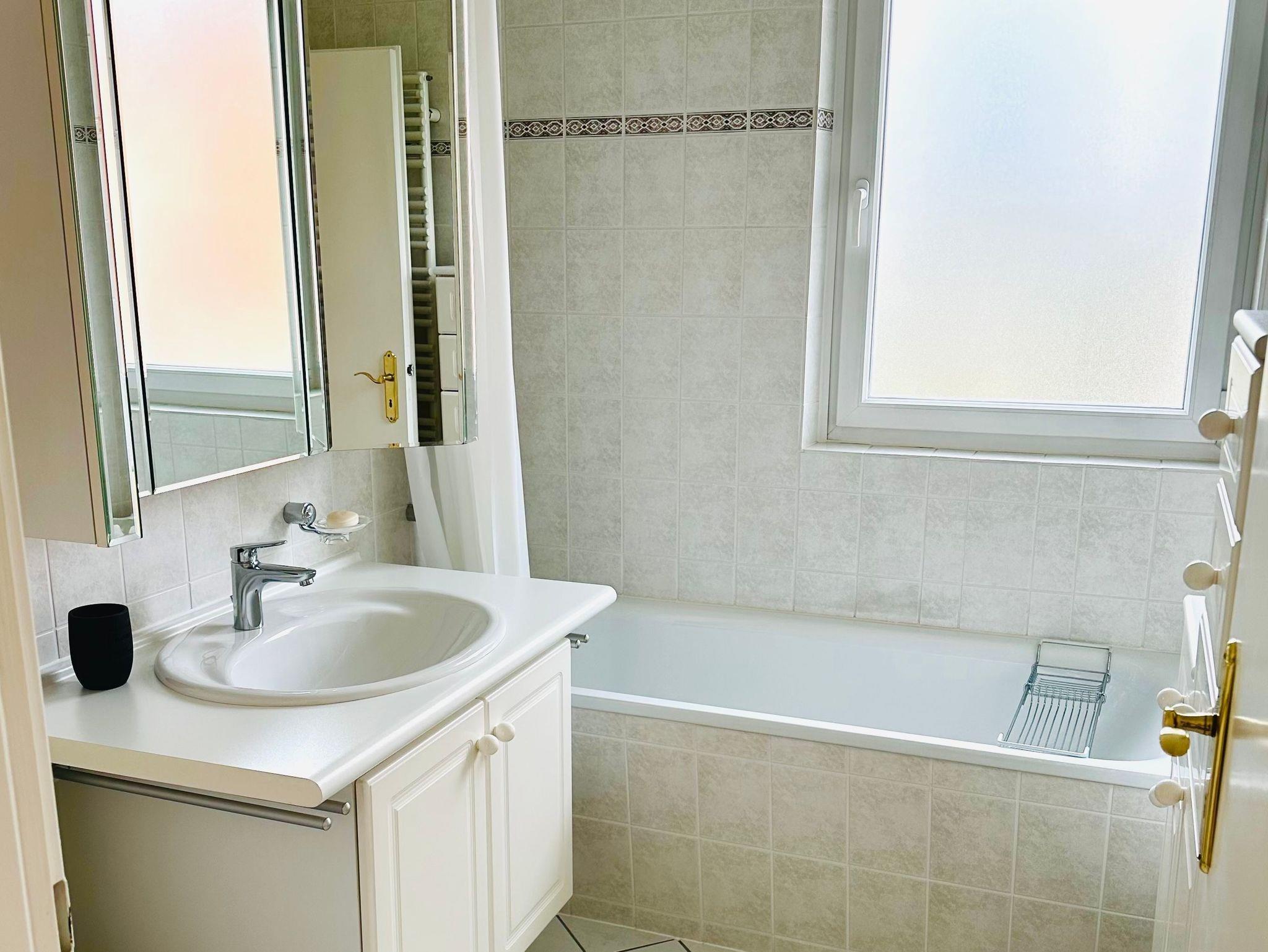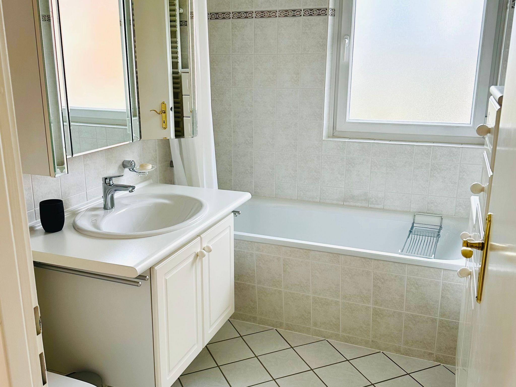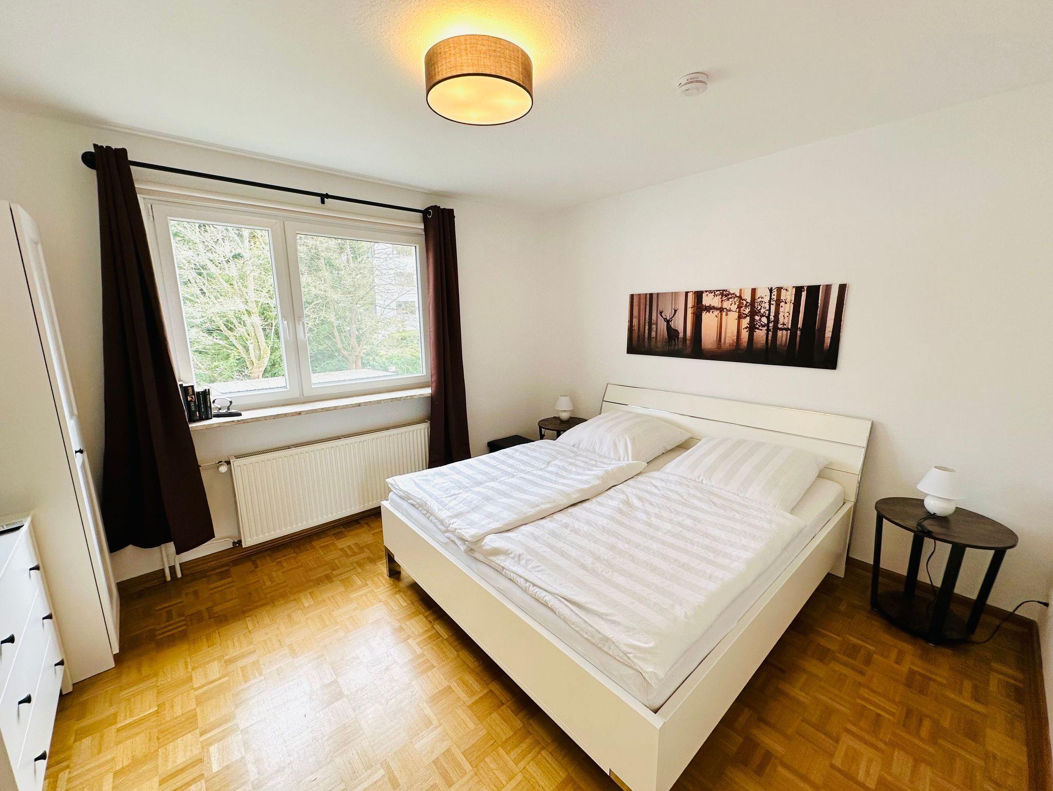 Die voll ausgestattete Küche verfügt neben einer Spülmaschine über einen Herd mit Backofen, einen Kühlschrank mit Gefrierfach, eine Kaffeemaschine, einen Toaster und einen Eierkocher. Im Erdgeschoss befindet sich ein Gäste-WC und das erste Schlafzimmer mit Doppelbett und Fernseher. Im Obergeschoss stehen drei weitere Schlafzimmer zur Verfügung, jeweils ausgestattet mit Fernseher und Doppelbett. Ein Zimmer besticht durch ein Panoramafenster und einen Südbalkon mit Balkonmöbeln. Zwei Badezimmer, eins mit Dusche und eins mit Badewanne, befinden sich ebenfalls im Obergeschoss.