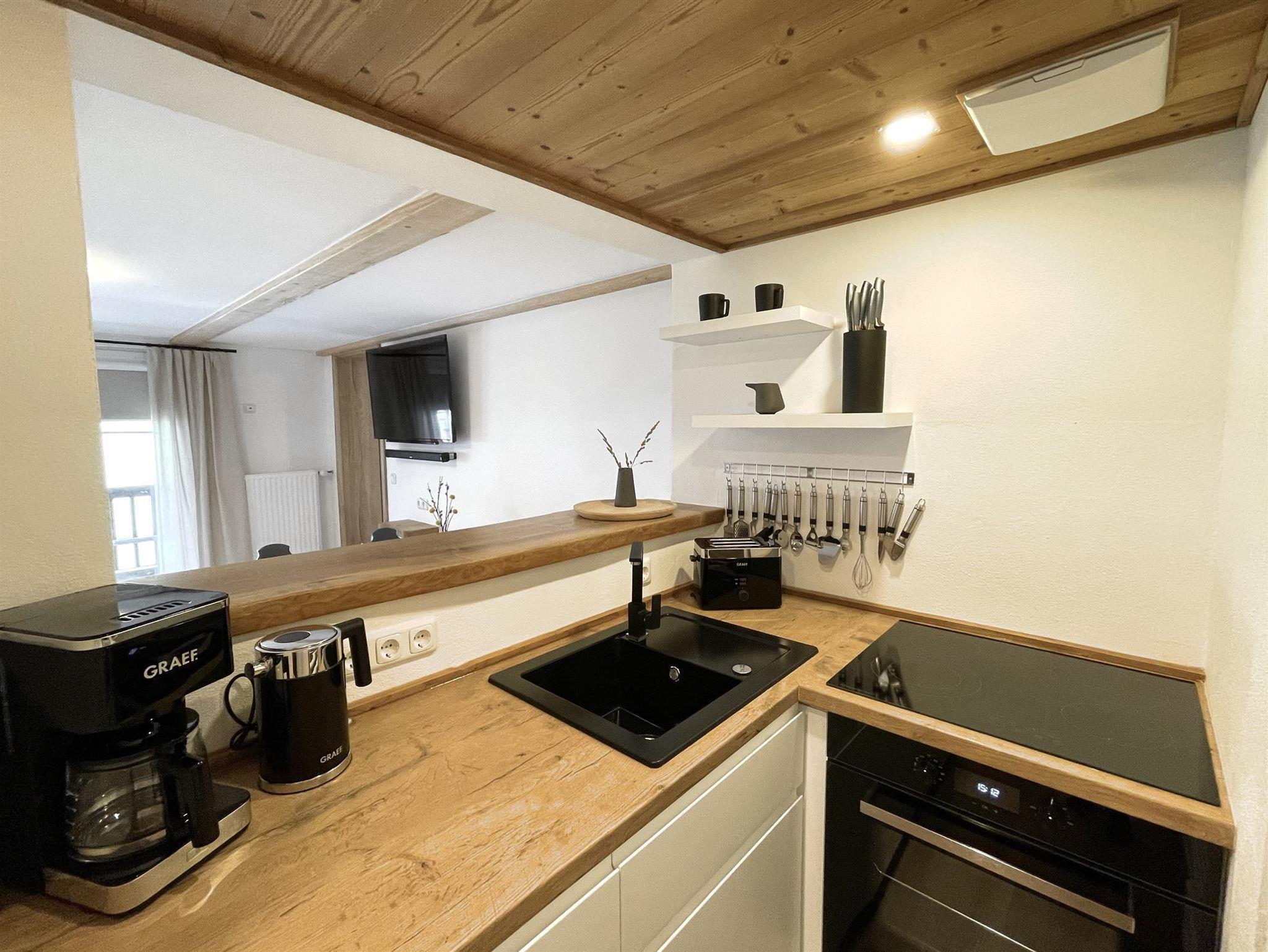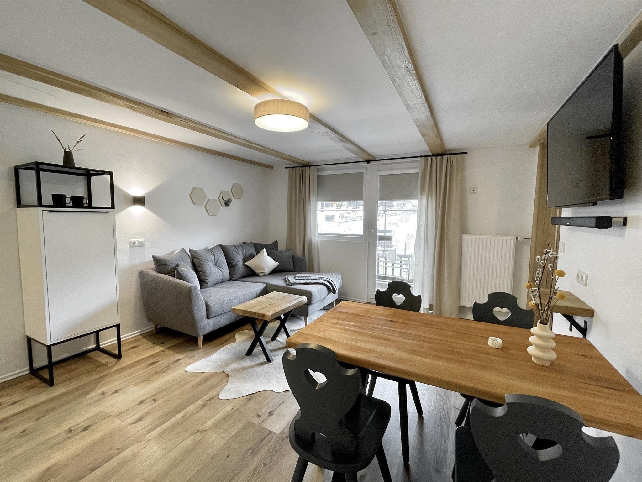 Unsere Ferienwohnung Hirschberg eignet sich hervorragend für 2 Personen. Sie verfügt über eine Grundfläche von 50qm und einen Balkon. Über den Eingang gelangen Sie durch eine kleine Garderobe in die Küche oder in das Wohn- / Esszimmer und über dieses ins Schlafzimmer. Das Wohn- / Esszimmer bietet eine gemütliche Couchecke, einen Esstisch, einen 55 Smart TV, eine Bluetooth Soundbar und ein Sideboard mit Geschirr. Das Schlafzimmer verfügt über ein Doppelbett aus Zirbenholz.