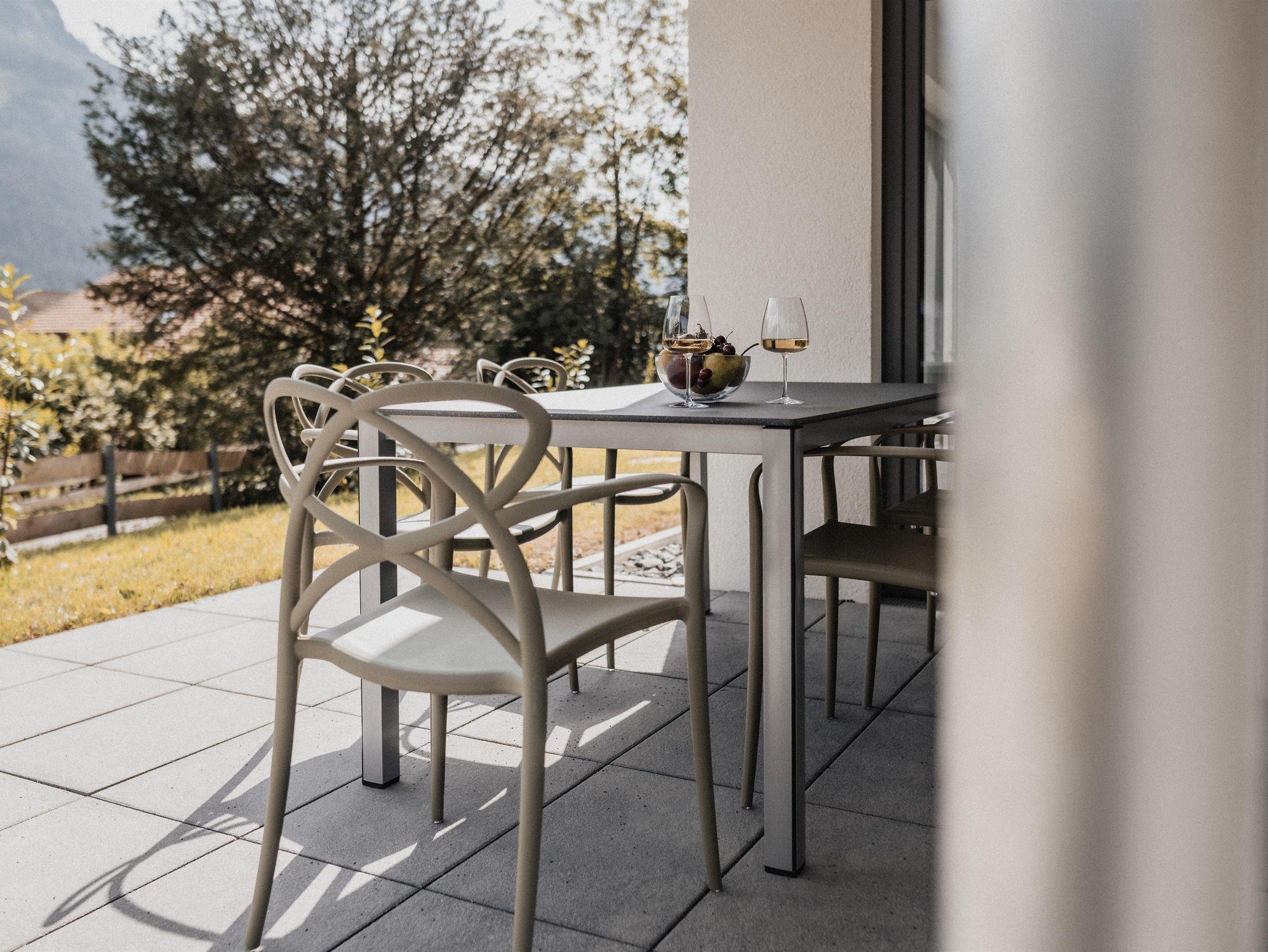Das Appartement im Erdgeschoss befindet sich auf der Süd Ostseite des Hauses und verfügt über eine wunderschöne Terrasse mit eigenem Garten. Zwei Schlafzimmer sind mit komfortablen Zirbenholz-Doppelbetten ausgestattet, und im Wohnzimmer befindet sich zusätzlich eine Schlafcouch. Der Wohn- und Essbereich umfasst eine moderne, voll ausgestattete Küche mit Panoramasitzfenster und Ausblick auf die umliegende Bergwelt. Die Wohnung bietet ein Bad und ein separates WC sowie eine Infrarotkabine.