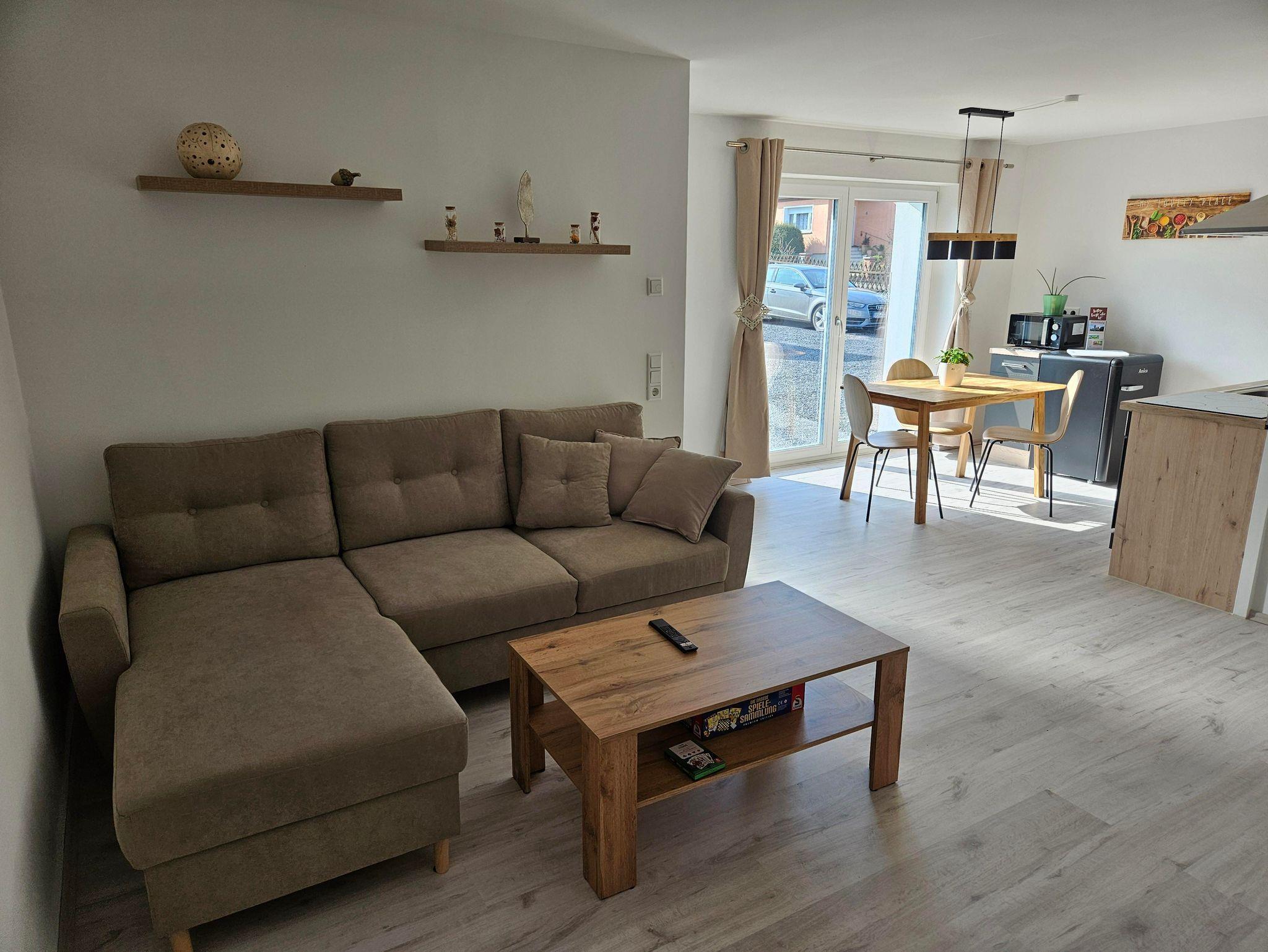 Unsere neue Ferienwohnung mit 56 m² Wohnfläche bietet im Erdgeschoss mit Gartenblick Platz für 1-4 Personen. Die gemütliche Wohnküche mit Sofa und Flachbild-TV lädt zum Verweilen ein. Die komplett ausgestattete Küchenzeile mit Geschirrspüler, Kühlschrank inkl. Gefrierfach, Herd, Backofen, Mikrowelle, Wasserkocher, Toaster und Kaffeemaschine lässt keine Wünsche offen. Die Ferienwohnung verfügt über zwei separate Schlafzimmer mit einem Doppelbett und einem Einzelbett. Das Badezimmer mit ebenerdiger Dusche, WC, Waschtisch und Handtuchtrockner rundet das Gesamtbild ab. Vor allem im Sommer können Sie entspannte Grillabende in unserem Garten verbringen. Bitte beachten Sie, dass keine Haustiere erlaubt sind. Das WLAN und den Parkplatz vor dem Haus können Sie kostenfrei nutzen.