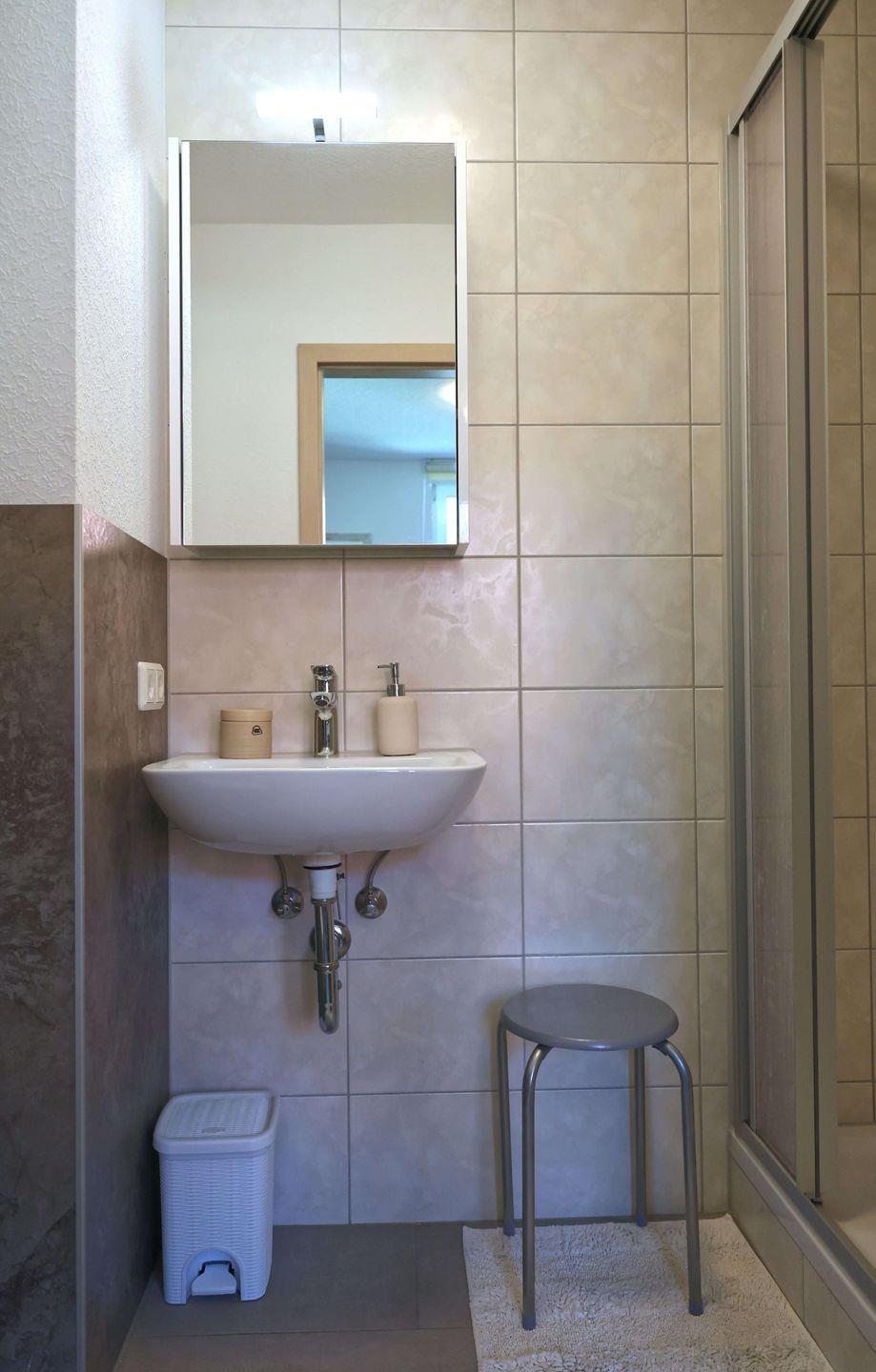 Das kompakte Badezimmer ist funktional gestaltet und bietet eine Dusche, WC sowie einen Fön – alles, was Sie für einen angenehmen Aufenthalt benötigen.