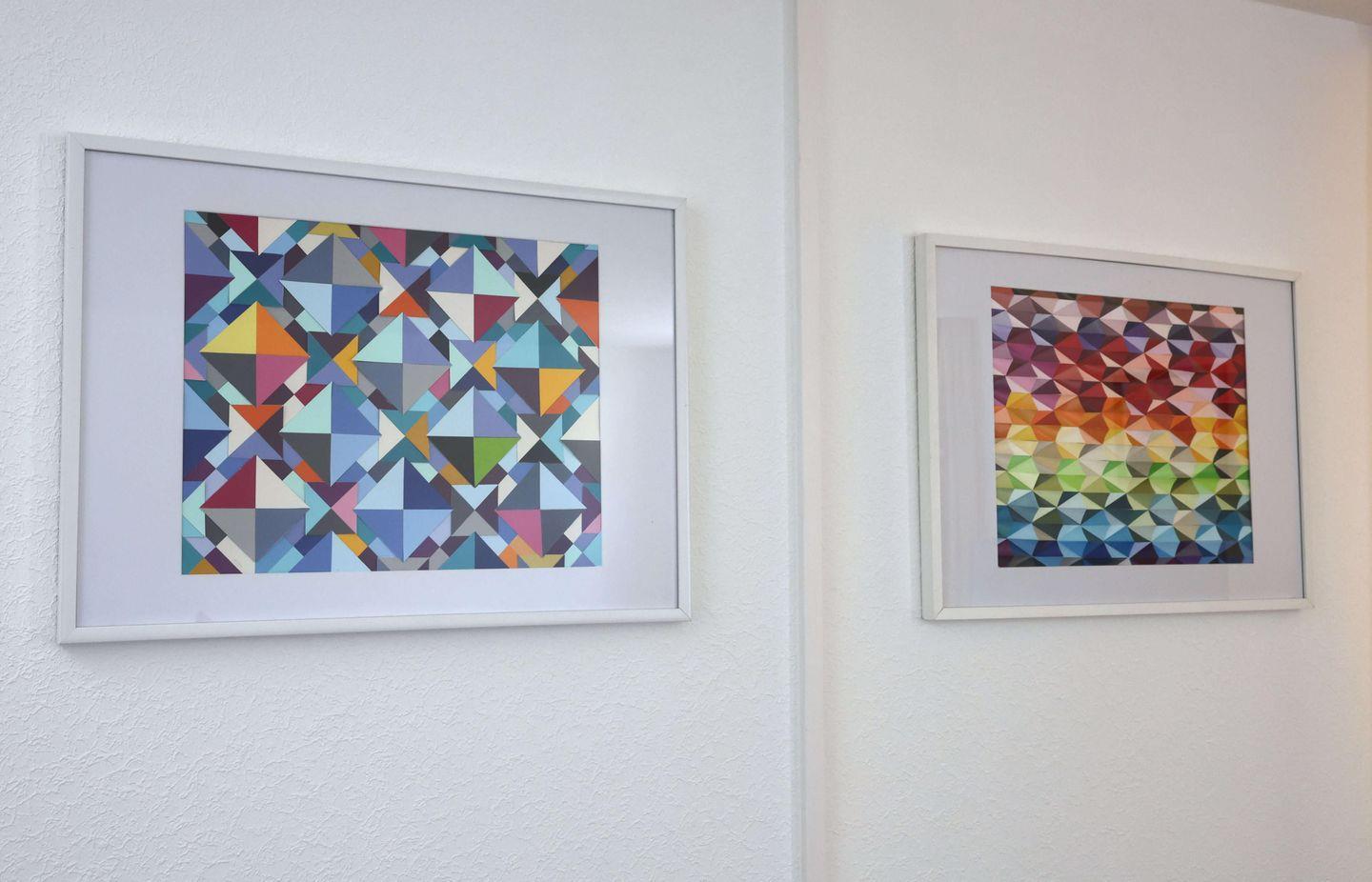 Das separate Schlafzimmer bietet neben einem komfortablen Bett auch eine stilvolle Sitzecke mit zwei Sesseln und einem kleinen Tisch, auf dem eine Originalarbeit der lokalen Künstlerin Simone Dittmar präsentiert wird. Zwei weitere Werke derselben Künstlerin schmücken die Wand und verleihen dem Raum eine besondere Note. Für Ihre Unterhaltung ist ein Fernseher so platziert, dass Sie ihn auch bequem vom Bett aus genießen können.