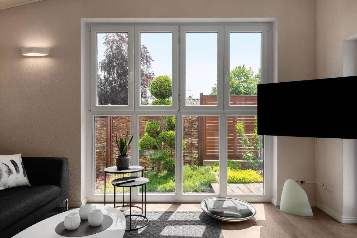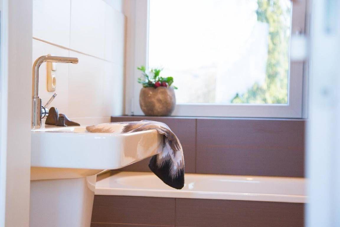 In the holiday home you will find two spacious bedrooms with double beds, which invite you to relax and feel good with high-quality mattresses and a cosy ambience. Each bedroom has its own modern bathroom, one with a bath and one with a shower. The large, light-flooded living and dining area invites you to linger and offers a beautiful view of the garden.