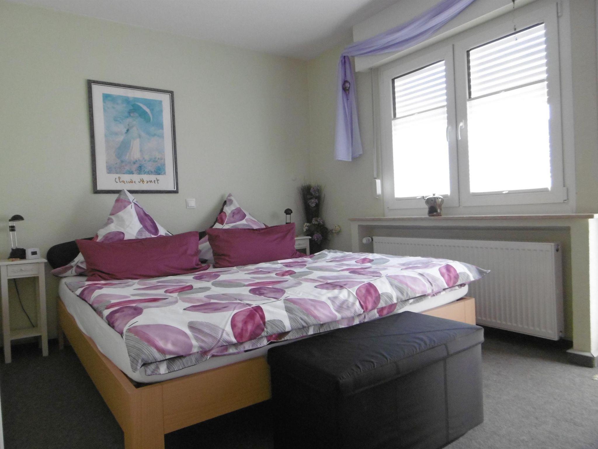 Unsere helle 65 m² große Ferienwohnung in der 2.Etage erreichen Sie über eine bequeme Treppe. In der Diele befindet sich ein Ganzkörperspiegel, Gardarobe und Schuhablage. Das Schlafzimmer ist mit einem Kleiderschrank, Doppelbett (180x200cm), mit zwei Lattenrosten und getrennten Matratzen ( Bettende offen )und Sessel ausgestattet. Von dort haben Sie Zugang zu einem kleinen Balkon, Süd-Seite, mit Sonnenschirm und Bestuhlung.