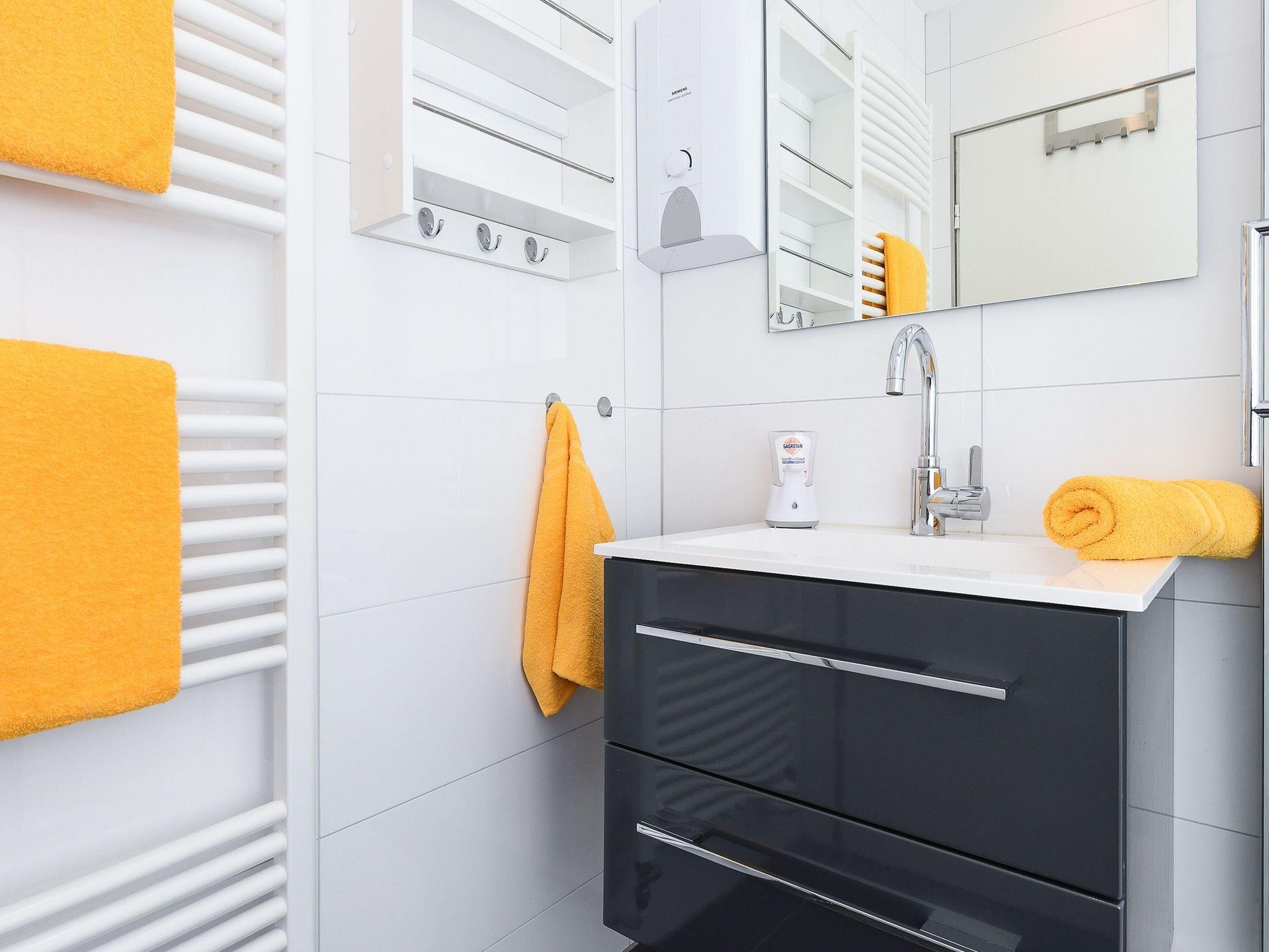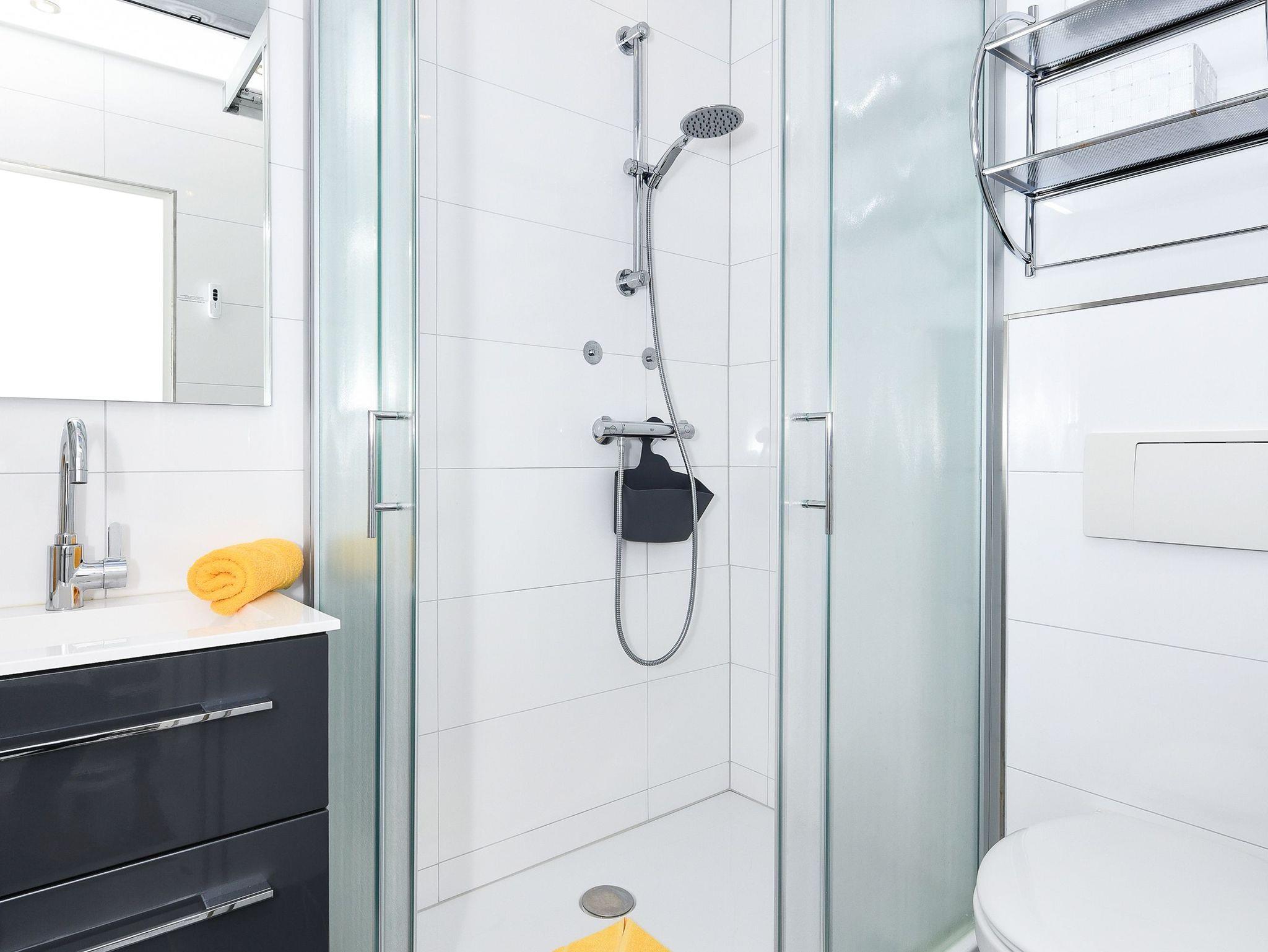 Badezimmer mit Dusche, Waschtisch und WC