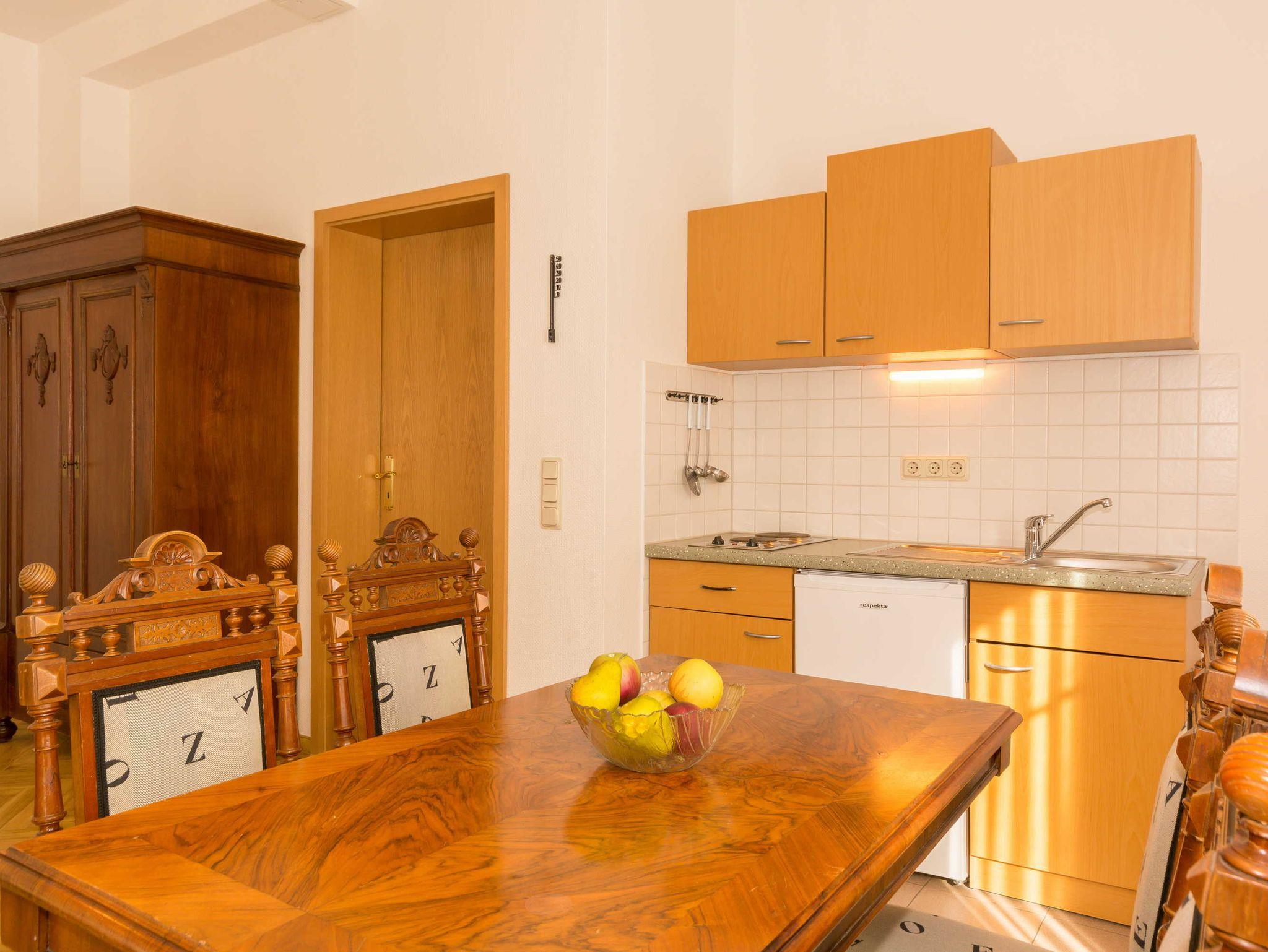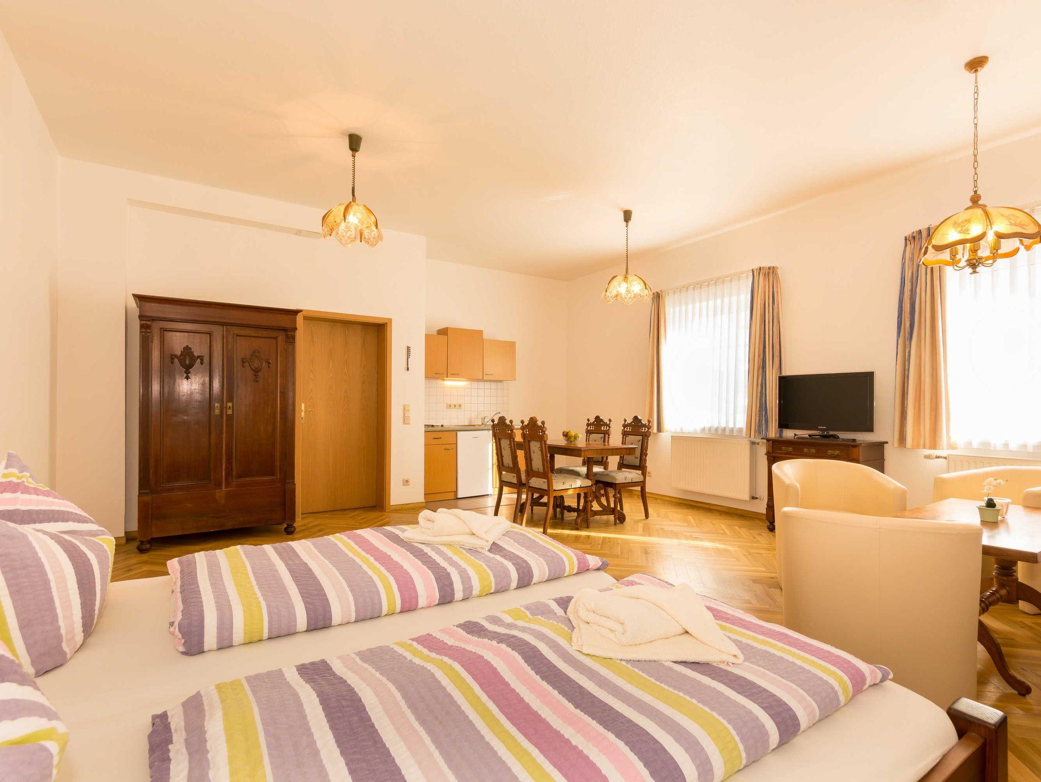 1-Zimmer Ferienwohnung: Kombiniertes Wohn- und Schlafappartement (2-4 Personen) mit Doppelbett und großer Sitzecke: Doppelbettcouch als Aufbettungsmöglichkeit (kein getrennter Schlafraum); Kuechenecke mit Herd, Kuehlschrank und Geschirr; Bad, Dusche und WC; Kabel-TV; ca. 50 qm;