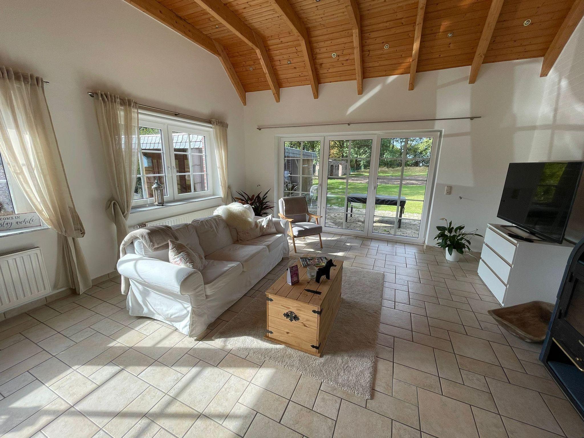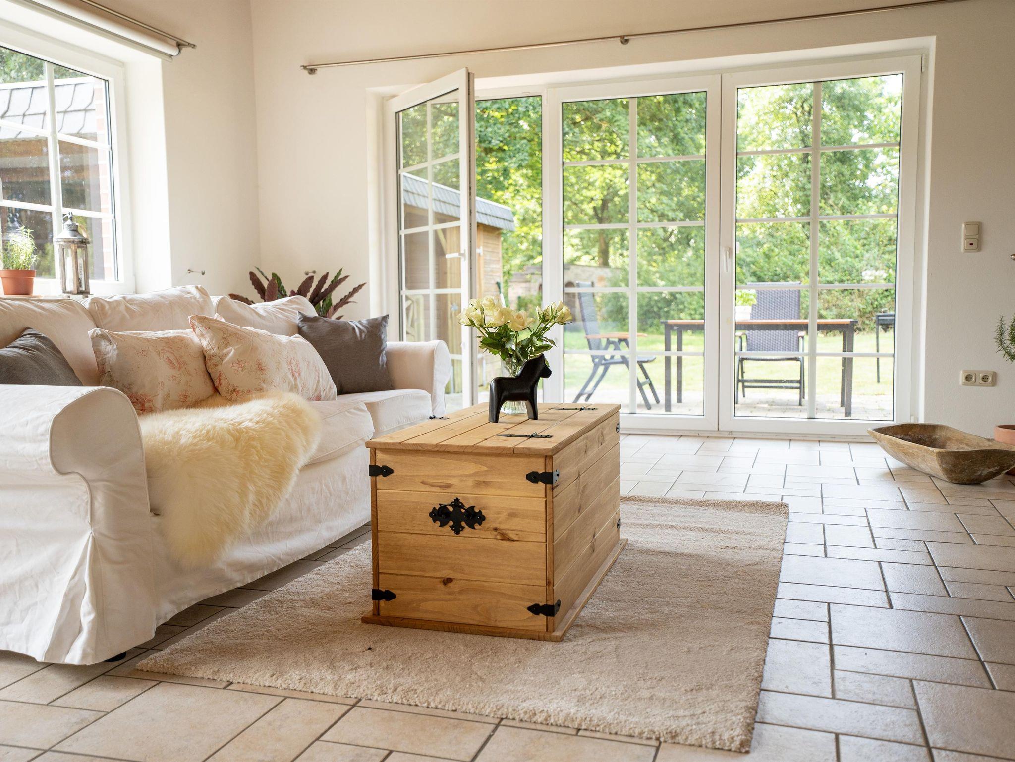 Die 125 m² große Ferienwohnung Haverbecker Heide bietet Platz für maximal 4 Erwachsene und 2 Kinder. Sie verfügt über zwei Schlafzimmer für Erwachsene, ein Kinderzimmer mit Etagenbett (1,60 m, ideal für Kinder bis 10 Jahre), ein modernes Duschbad, ein Gäste-WC mit Waschmaschine und eine großzügige, voll ausgestattete Küche mit Geschirrspüler. Das 35 m² große, helle Wohnzimmer mit Kamin und großem Flachbildfernseher führt direkt in den privaten Garten, der mit einer typischen Steinmauer perfekt für gemütliche Grillabende ist. Für die Gäste steht ein eigener Parkplatz im Carport, direkt vor der Haustür zur Verfügung.