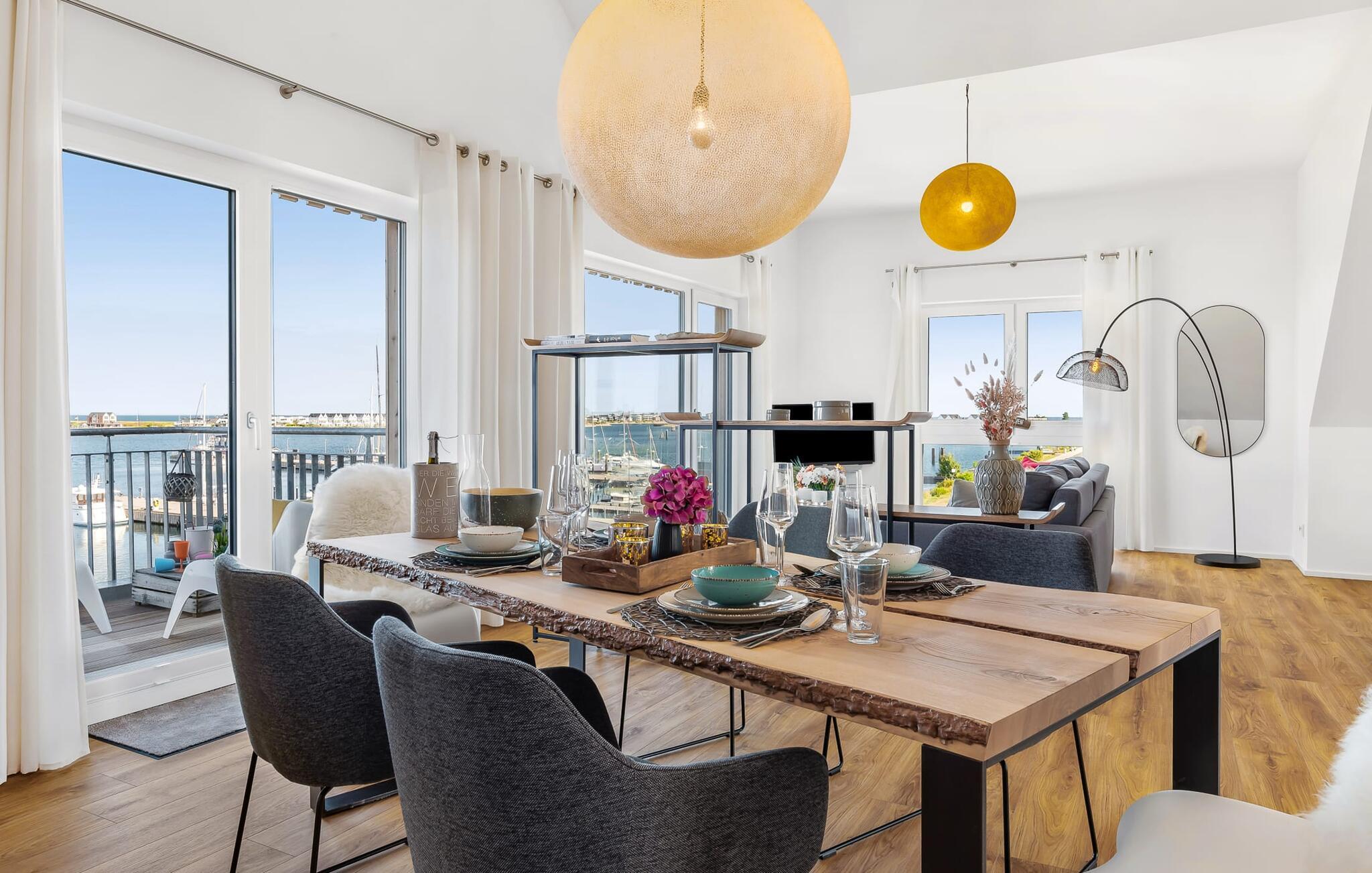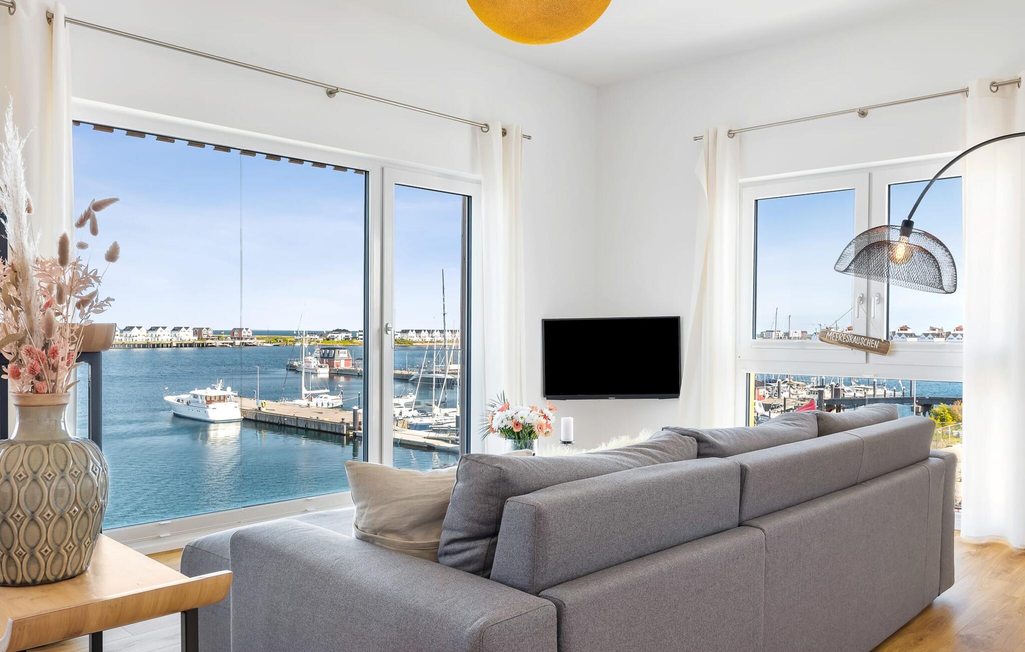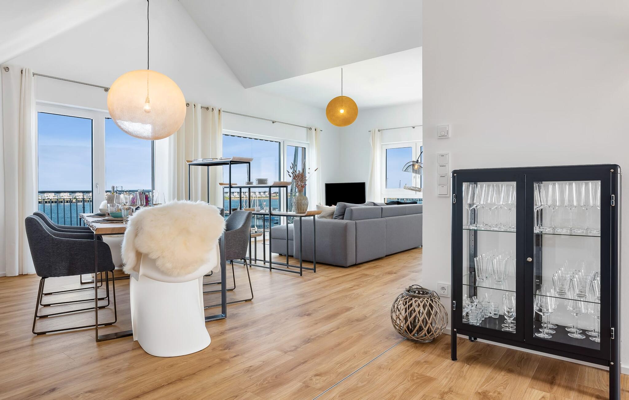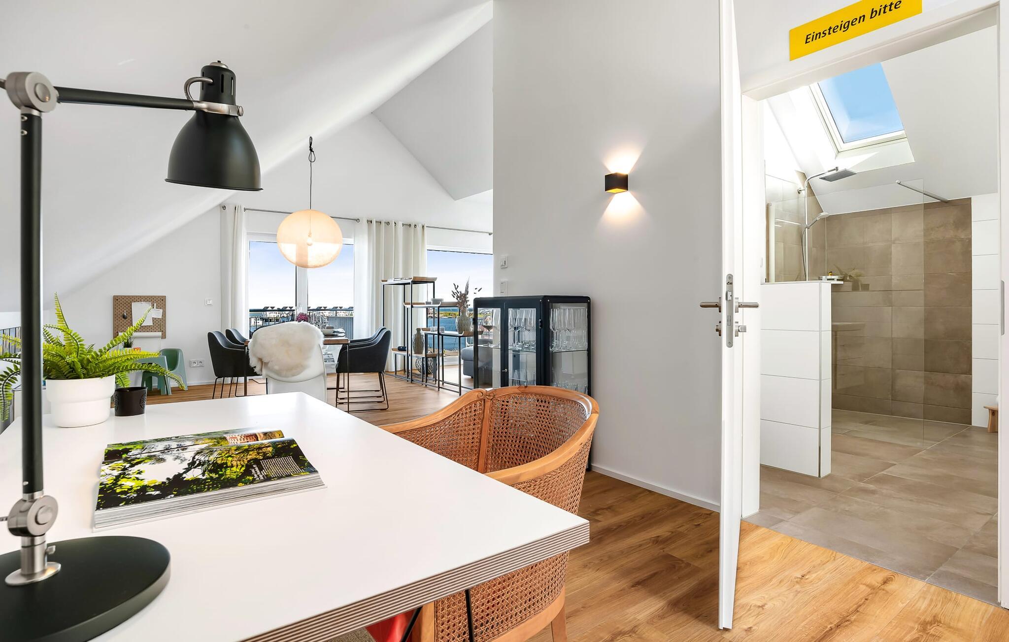 Denne ferielejlighed ligger på 3. sal i en top beliggenhed! BLAUE STUNDE 54/10 er centralt og alligevel roligt beliggende direkte ved sejl- og sportsbådshavnen i feriestedet Østersøen, på den populære havnepromenade med dens varierede butikker. Så snart I åbner lejlighedsdøren, kan I se havnepanoramaet med dets farverige stress og jag gennem vinduet fra gulv til loft foran den åbne stue/alrum over altanen. Lad jer overvælde af farverne i DEN BLÅ TIME her hos os (54°N 10°Ø). Farvespillet er unikt i al slags vejr og vil glæde dig! Ferielejligheden, indrettet i nordisk, afslappet stil, er både moderne og indbydende og emmer af hygge. Det rummelige og åbne opholds-, spise- og køkkenområde byder på alle de bekvemmeligheder, I kender hjemmefra. Og hvis I ønsker at flytte jeres hjemmekontor til havet, finder I det, I leder efter her: En separat arbejdsplads med udsigt over Sleien og følelsen af havets vidder og lethed runder lejlighedens indretning af. Det føles ikke som arbejde i den blå time! Det rummelige soveværelse byder på fire komfortable sovepladser. For familier er piratskibsloftsengen et ideelt sovested for børn, mens voksne sover behageligt i en dobbeltseng. Men voksne kan også sove i hemsen. Der er plads til op til 6 personer i lejligheden, da sofaen i stuen kan omdannes til to ekstra sovepladser med få enkle trin. Intet står i vejen for en ferie med jeres bedste venner. Ud over alt det nyttige har badeværelset en brusekabine i gulvniveau til en frisk start på en ny feriedag. Parkeringspladsen ved huset byder på yderligere bekvemmelighed. Den eksisterende elevator sikrer nem adgang til BLUE HOUR 54/10. Vores foretrukne sted: at beundre den BLÅ HOUR over havnen på balkonen om aftenen... Bemærk venligst: OstseeResort Olpenitz er meget populært, og der bygges fortsat i parken. Ikke desto mindre kan I se frem til en 5-stjernet standard og et førsteklasses ophold. Byggeaktiviteterne kommer ikke til at forstyrre jer på ferien, og derfor gives der ikke yderligere afslag i prisen.