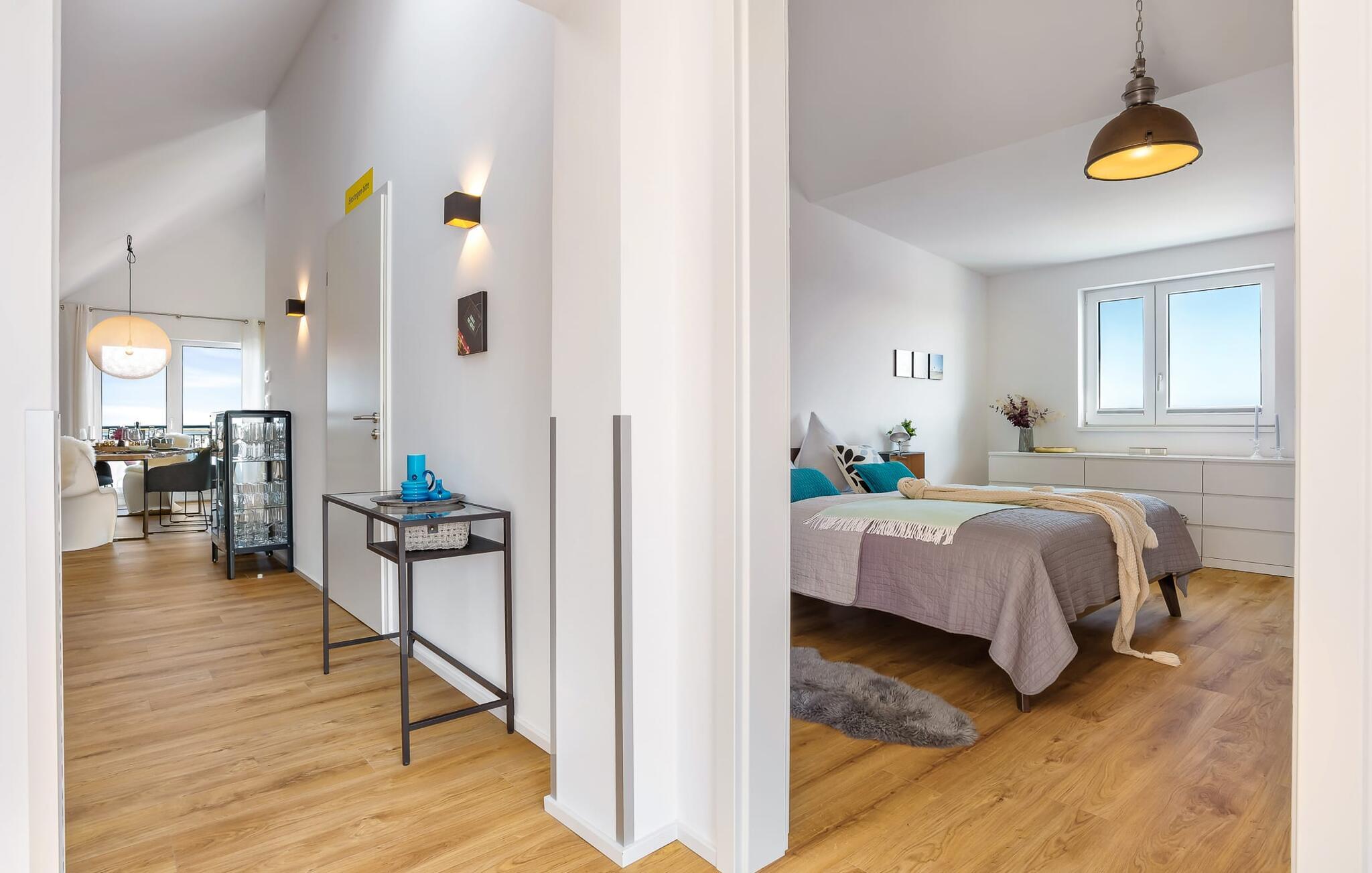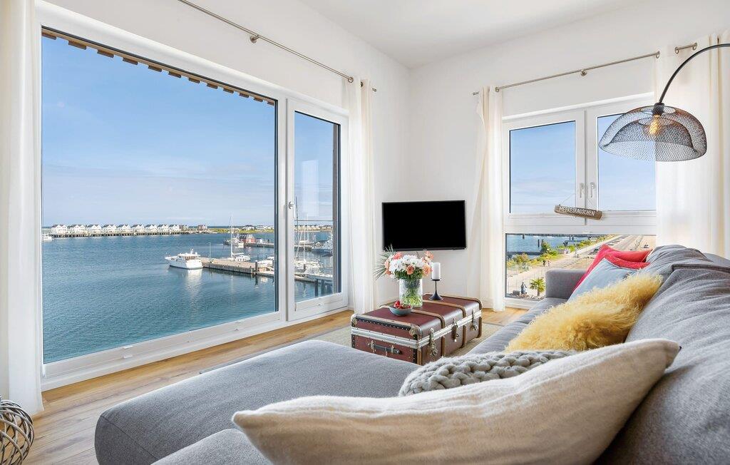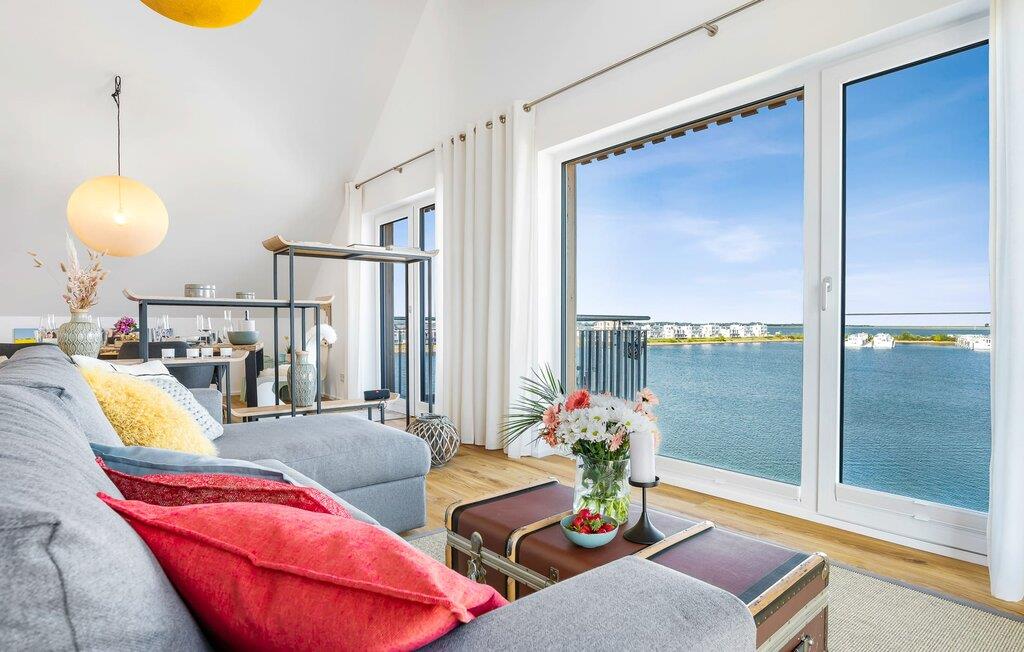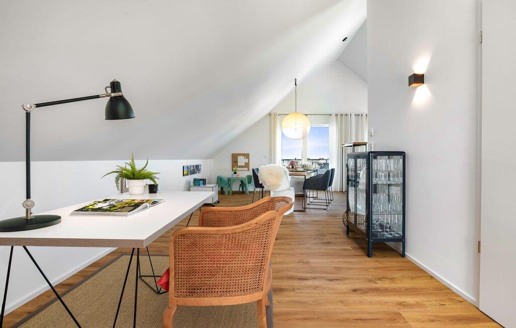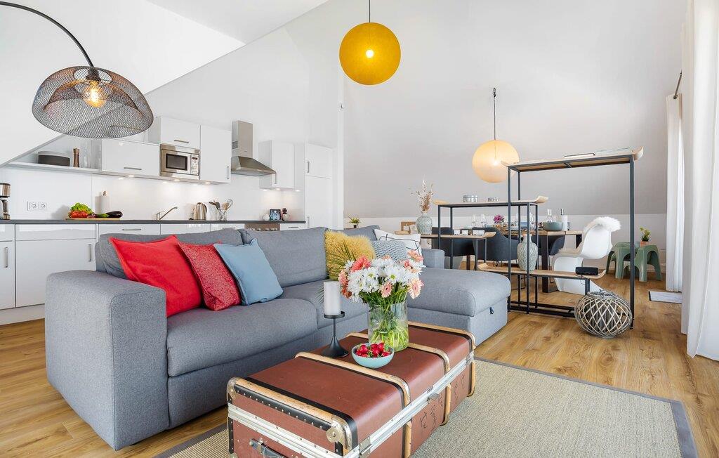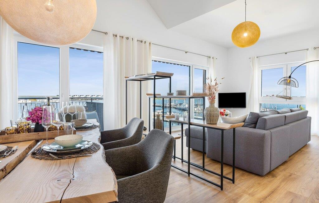 Denne ferielejlighed ligger på 3. sal i en top beliggenhed! BLAUE STUNDE 54/10 er centralt og alligevel roligt beliggende direkte ved sejl- og sportsbådshavnen i feriestedet Østersøen, på den populære havnepromenade med dens varierede butikker. Så snart I åbner lejlighedsdøren, kan I se havnepanoramaet med dets farverige stress og jag gennem vinduet fra gulv til loft foran den åbne stue/alrum over altanen. Lad jer overvælde af farverne i DEN BLÅ TIME her hos os (54°N 10°Ø). Farvespillet er unikt i al slags vejr og vil glæde dig! Ferielejligheden, indrettet i nordisk, afslappet stil, er både moderne og indbydende og emmer af hygge. Det rummelige og åbne opholds-, spise- og køkkenområde byder på alle de bekvemmeligheder, I kender hjemmefra. Og hvis I ønsker at flytte jeres hjemmekontor til havet, finder I det, I leder efter her: En separat arbejdsplads med udsigt over Sleien og følelsen af havets vidder og lethed runder lejlighedens indretning af. Det føles ikke som arbejde i den blå time! Det rummelige soveværelse byder på fire komfortable sovepladser. For familier er piratskibsloftsengen et ideelt sovested for børn, mens voksne sover behageligt i en dobbeltseng. Men voksne kan også sove i hemsen. Der er plads til op til 6 personer i lejligheden, da sofaen i stuen kan omdannes til to ekstra sovepladser med få enkle trin. Intet står i vejen for en ferie med jeres bedste venner. Ud over alt det nyttige har badeværelset en brusekabine i gulvniveau til en frisk start på en ny feriedag. Parkeringspladsen ved huset byder på yderligere bekvemmelighed. Den eksisterende elevator sikrer nem adgang til BLUE HOUR 54/10. Vores foretrukne sted: at beundre den BLÅ HOUR over havnen på balkonen om aftenen... Bemærk venligst: OstseeResort Olpenitz er meget populært, og der bygges fortsat i parken. Ikke desto mindre kan I se frem til en 5-stjernet standard og et førsteklasses ophold. Byggeaktiviteterne kommer ikke til at forstyrre jer på ferien, og derfor gives der ikke yderligere afslag i prisen.