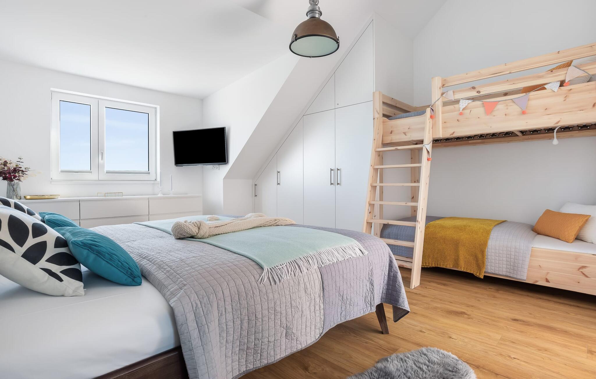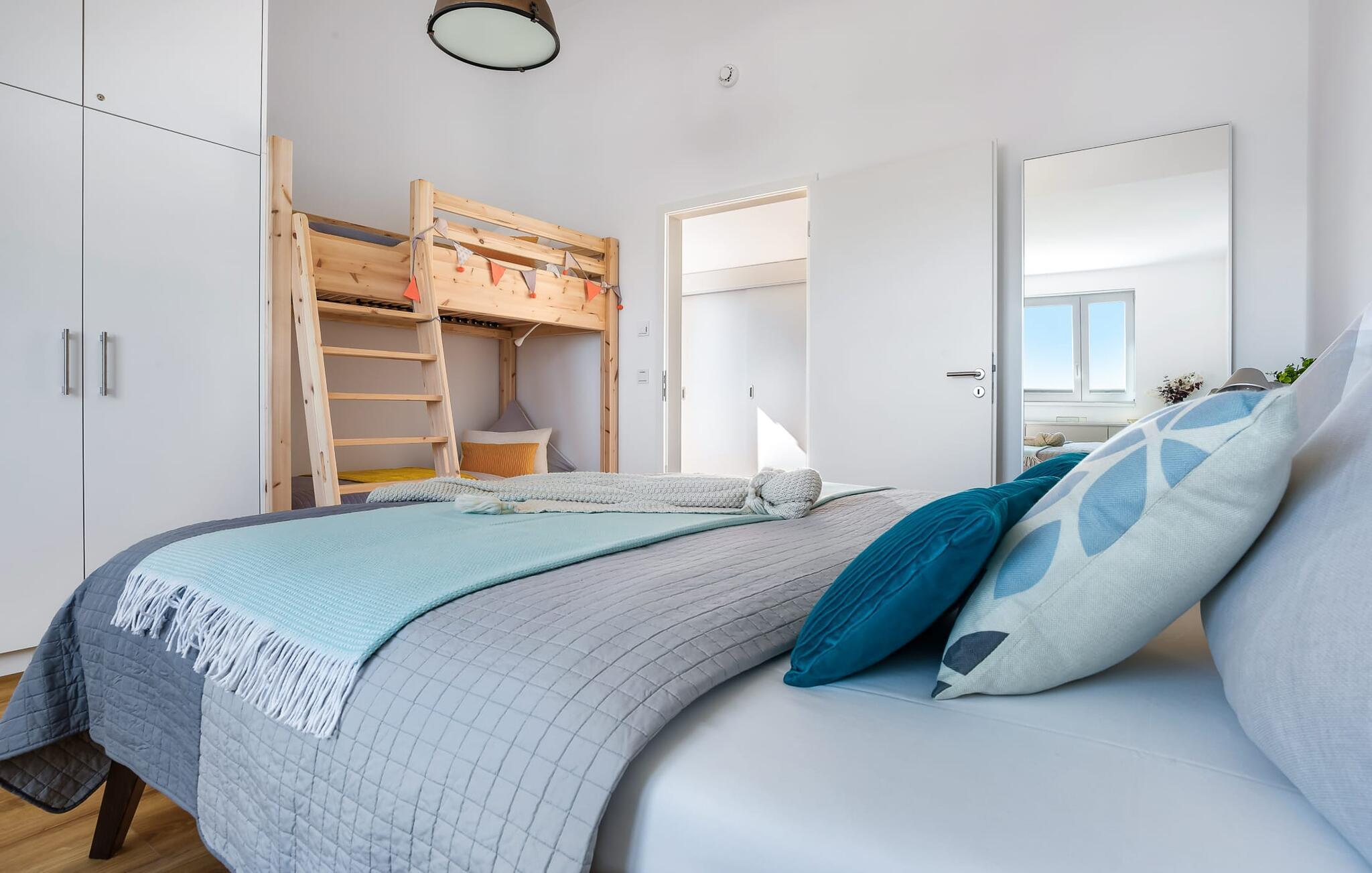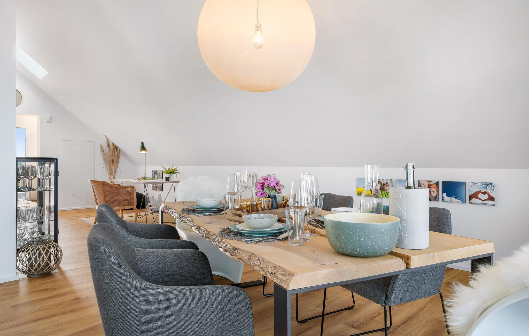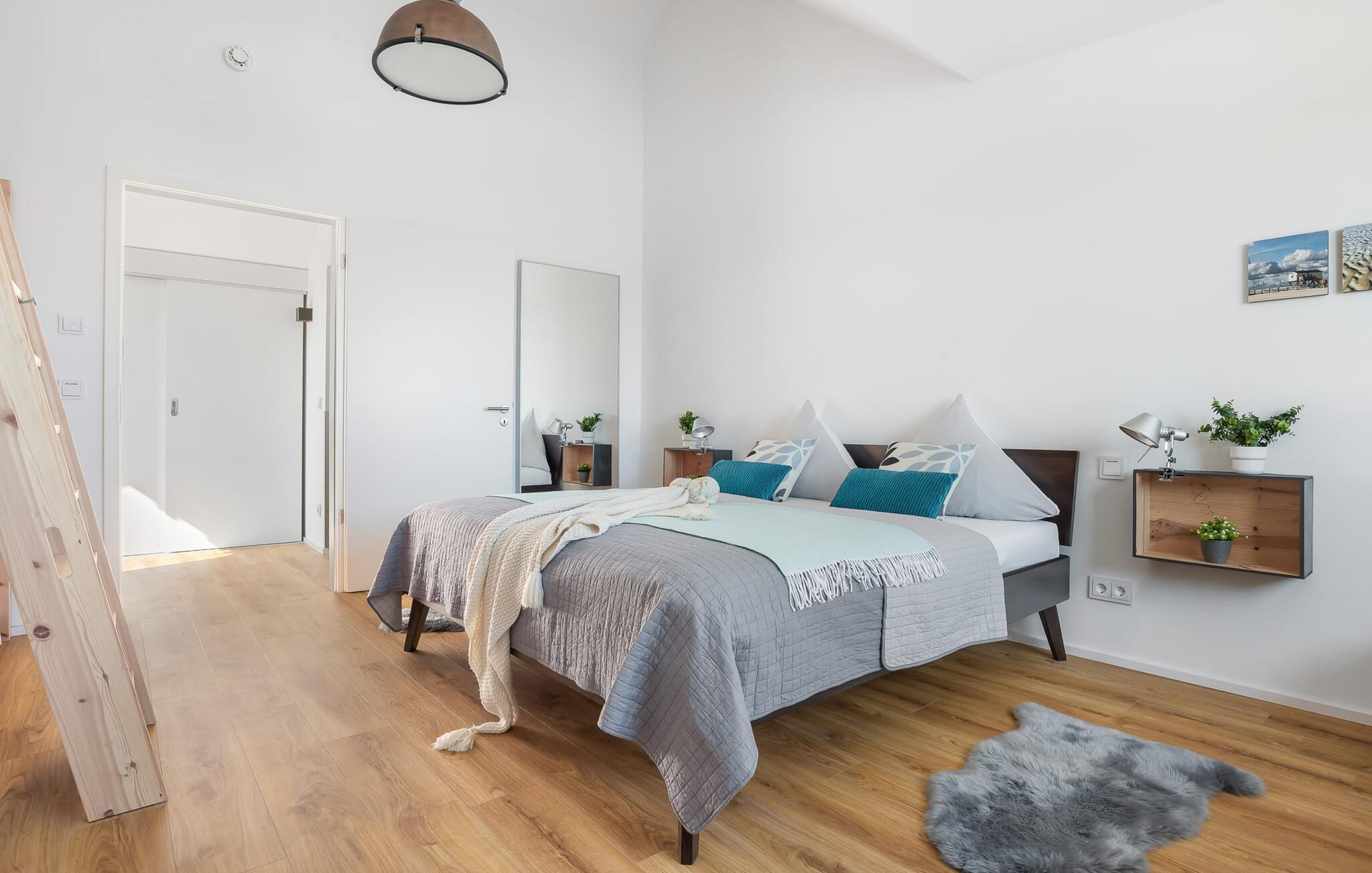 Denne ferielejlighed ligger på 3. sal i en top beliggenhed! BLAUE STUNDE 54/10 er centralt og alligevel roligt beliggende direkte ved sejl- og sportsbådshavnen i feriestedet Østersøen, på den populære havnepromenade med dens varierede butikker. Så snart I åbner lejlighedsdøren, kan I se havnepanoramaet med dets farverige stress og jag gennem vinduet fra gulv til loft foran den åbne stue/alrum over altanen. Lad jer overvælde af farverne i DEN BLÅ TIME her hos os (54°N 10°Ø). Farvespillet er unikt i al slags vejr og vil glæde dig! Ferielejligheden, indrettet i nordisk, afslappet stil, er både moderne og indbydende og emmer af hygge. Det rummelige og åbne opholds-, spise- og køkkenområde byder på alle de bekvemmeligheder, I kender hjemmefra. Og hvis I ønsker at flytte jeres hjemmekontor til havet, finder I det, I leder efter her: En separat arbejdsplads med udsigt over Sleien og følelsen af havets vidder og lethed runder lejlighedens indretning af. Det føles ikke som arbejde i den blå time! Det rummelige soveværelse byder på fire komfortable sovepladser. For familier er piratskibsloftsengen et ideelt sovested for børn, mens voksne sover behageligt i en dobbeltseng. Men voksne kan også sove i hemsen. Der er plads til op til 6 personer i lejligheden, da sofaen i stuen kan omdannes til to ekstra sovepladser med få enkle trin. Intet står i vejen for en ferie med jeres bedste venner. Ud over alt det nyttige har badeværelset en brusekabine i gulvniveau til en frisk start på en ny feriedag. Parkeringspladsen ved huset byder på yderligere bekvemmelighed. Den eksisterende elevator sikrer nem adgang til BLUE HOUR 54/10. Vores foretrukne sted: at beundre den BLÅ HOUR over havnen på balkonen om aftenen... Bemærk venligst: OstseeResort Olpenitz er meget populært, og der bygges fortsat i parken. Ikke desto mindre kan I se frem til en 5-stjernet standard og et førsteklasses ophold. Byggeaktiviteterne kommer ikke til at forstyrre jer på ferien, og derfor gives der ikke yderligere afslag i prisen.