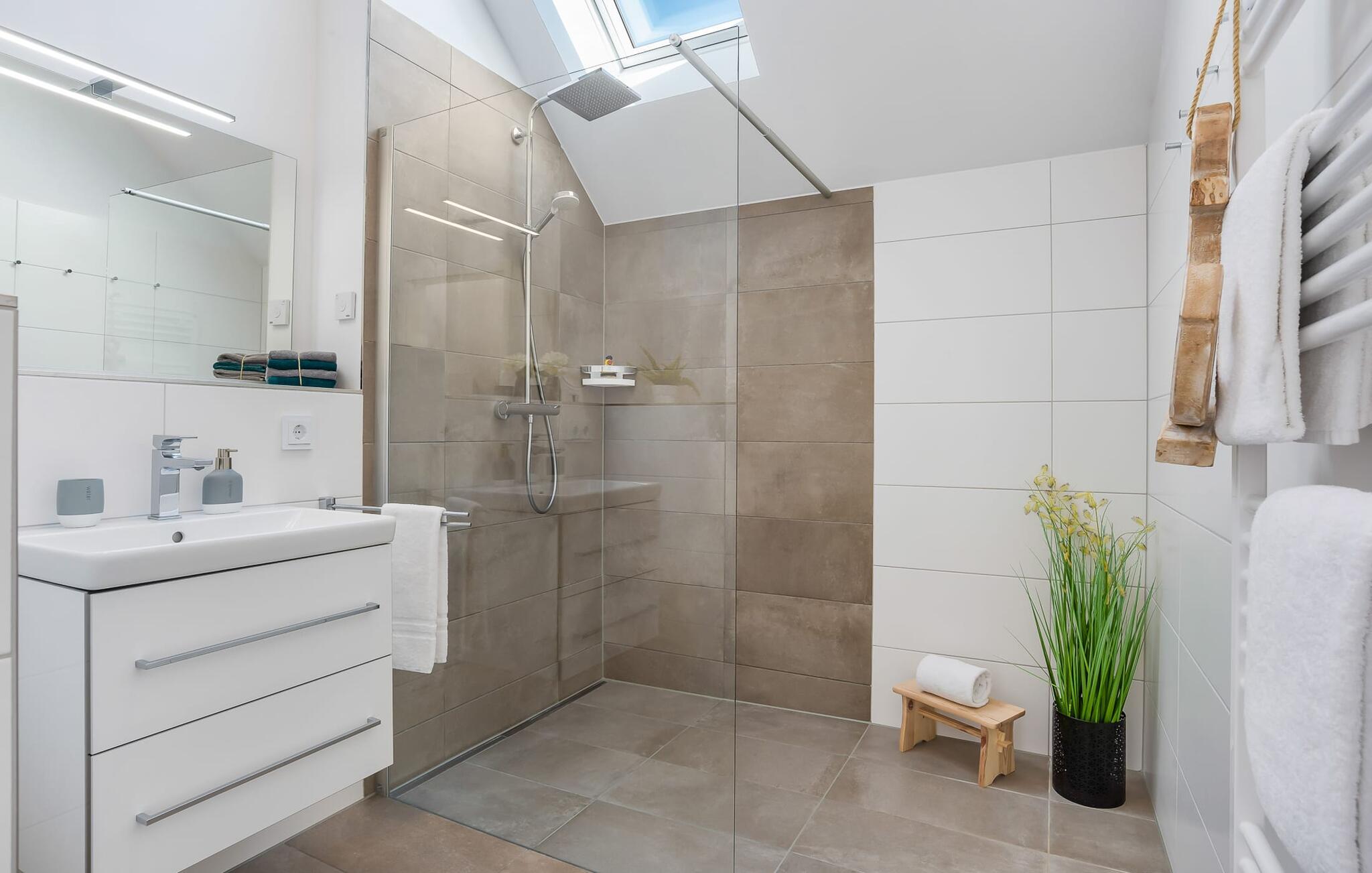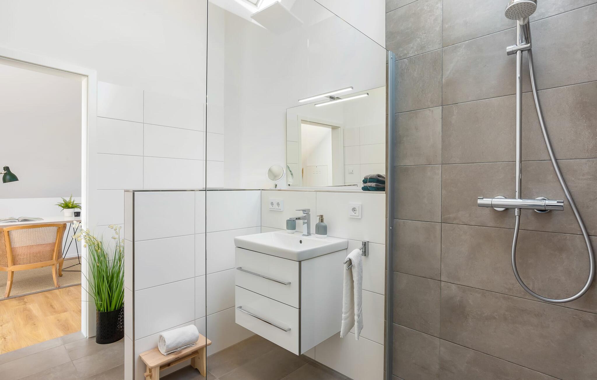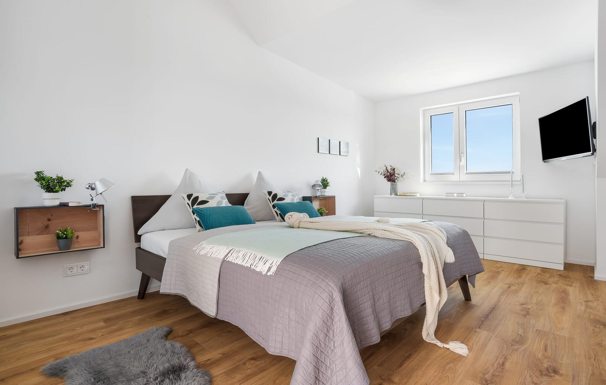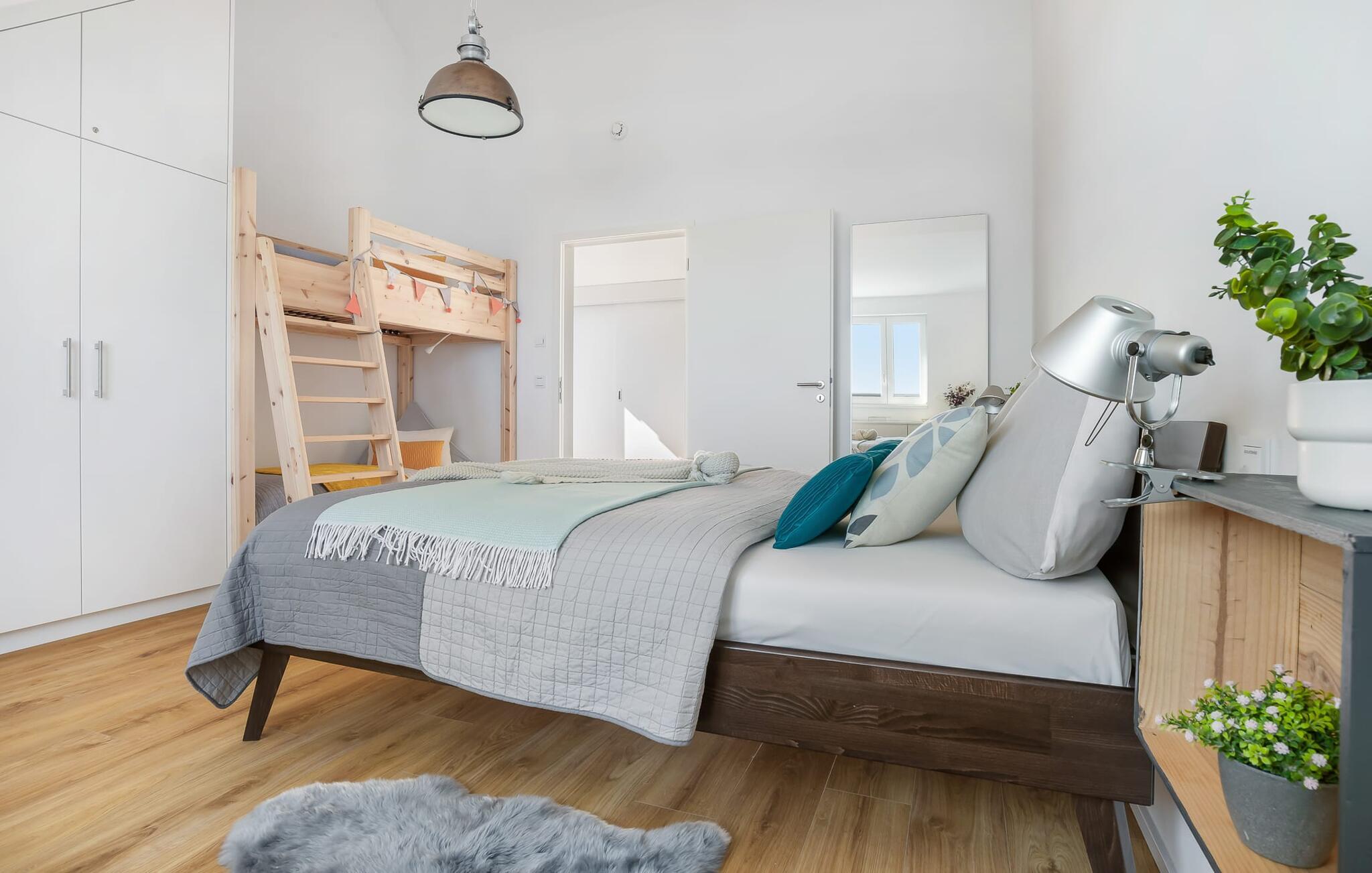 Denne ferielejlighed ligger på 3. sal i en top beliggenhed! BLAUE STUNDE 54/10 er centralt og alligevel roligt beliggende direkte ved sejl- og sportsbådshavnen i feriestedet Østersøen, på den populære havnepromenade med dens varierede butikker. Så snart I åbner lejlighedsdøren, kan I se havnepanoramaet med dets farverige stress og jag gennem vinduet fra gulv til loft foran den åbne stue/alrum over altanen. Lad jer overvælde af farverne i DEN BLÅ TIME her hos os (54°N 10°Ø). Farvespillet er unikt i al slags vejr og vil glæde dig! Ferielejligheden, indrettet i nordisk, afslappet stil, er både moderne og indbydende og emmer af hygge. Det rummelige og åbne opholds-, spise- og køkkenområde byder på alle de bekvemmeligheder, I kender hjemmefra. Og hvis I ønsker at flytte jeres hjemmekontor til havet, finder I det, I leder efter her: En separat arbejdsplads med udsigt over Sleien og følelsen af havets vidder og lethed runder lejlighedens indretning af. Det føles ikke som arbejde i den blå time! Det rummelige soveværelse byder på fire komfortable sovepladser. For familier er piratskibsloftsengen et ideelt sovested for børn, mens voksne sover behageligt i en dobbeltseng. Men voksne kan også sove i hemsen. Der er plads til op til 6 personer i lejligheden, da sofaen i stuen kan omdannes til to ekstra sovepladser med få enkle trin. Intet står i vejen for en ferie med jeres bedste venner. Ud over alt det nyttige har badeværelset en brusekabine i gulvniveau til en frisk start på en ny feriedag. Parkeringspladsen ved huset byder på yderligere bekvemmelighed. Den eksisterende elevator sikrer nem adgang til BLUE HOUR 54/10. Vores foretrukne sted: at beundre den BLÅ HOUR over havnen på balkonen om aftenen... Bemærk venligst: OstseeResort Olpenitz er meget populært, og der bygges fortsat i parken. Ikke desto mindre kan I se frem til en 5-stjernet standard og et førsteklasses ophold. Byggeaktiviteterne kommer ikke til at forstyrre jer på ferien, og derfor gives der ikke yderligere afslag i prisen.