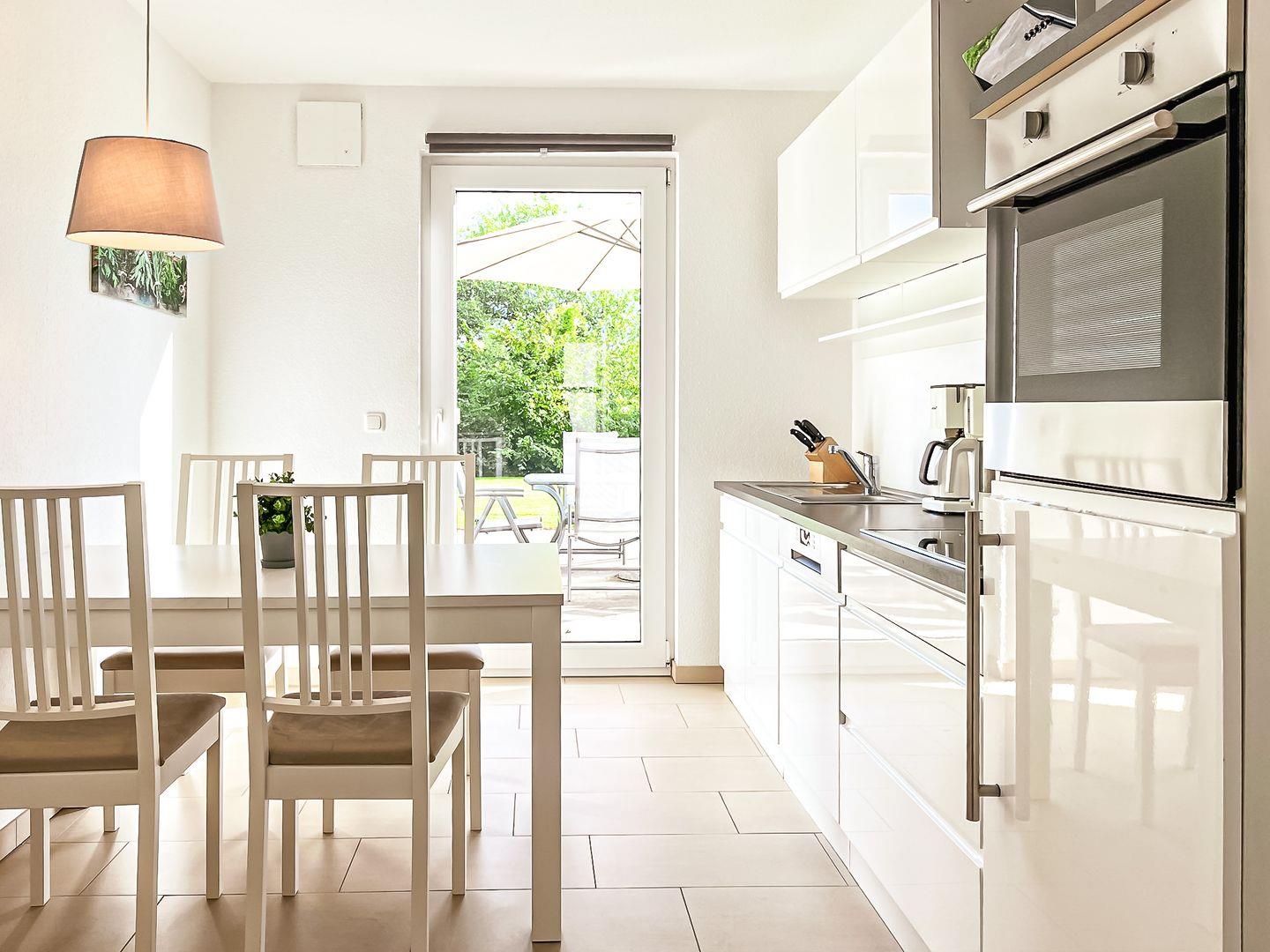 Dank der gut ausgestatteten separaten Küche bereitest du deine Lieblingsmahlzeiten auch im Urlaub gern zu. Sie verfügt über eine Mikrowelle, einen 4-Platten-Ceranherd und Backofen, einen Kühlschrank mit Gefrierfach, eine Geschirrspülmaschine, ausreichend Geschirr und Gläser, Toaster, Kaffeemaschine und Wasserkocher. Serviere deine Mahlzeiten gleich auf dem Esstisch und genieße deine gemeinsame Urlaubszeit.