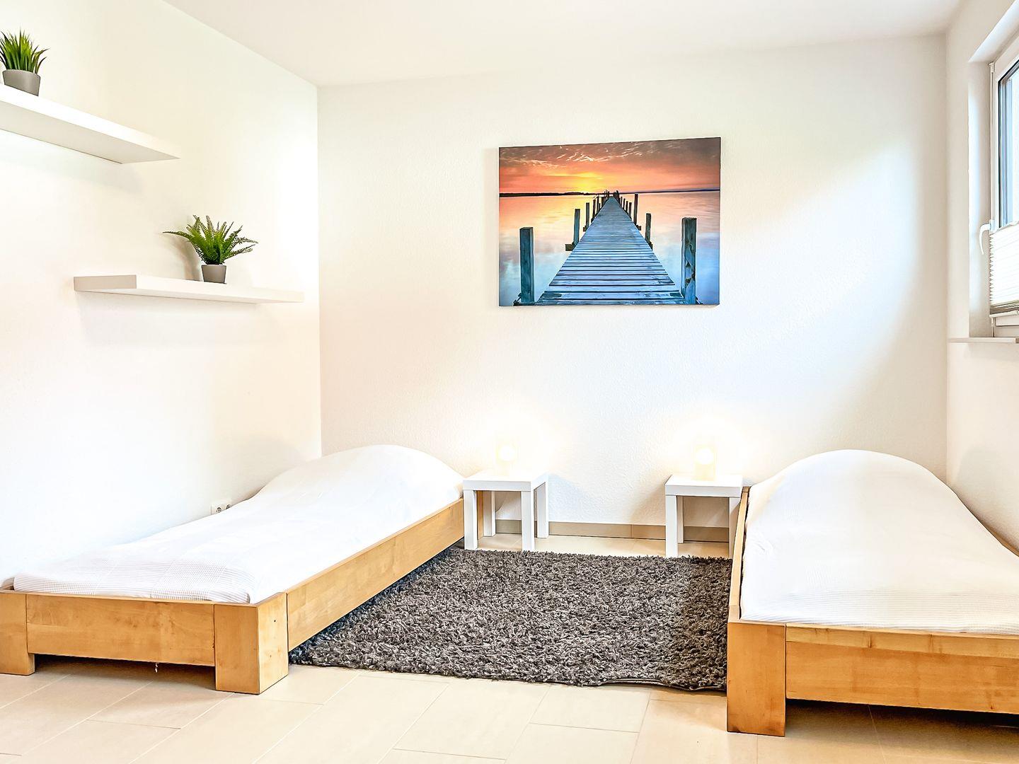 Im ersten Schlafzimmer stehen zwei Einzelbetten (mäßige Höhe) sowie ein Kleiderschrank, welcher genügend Platz für deine Urlaubsgarderobe bietet. Das zweite Schlafzimmer der Ferienwohnung ist mit einem Doppelbett ausgestattet. Ebenfalls steht hier ein geräumiger Kleiderschrank. Von diesem Schlafzimmer aus gelangst du ebenfalls auf die große Terrasse.