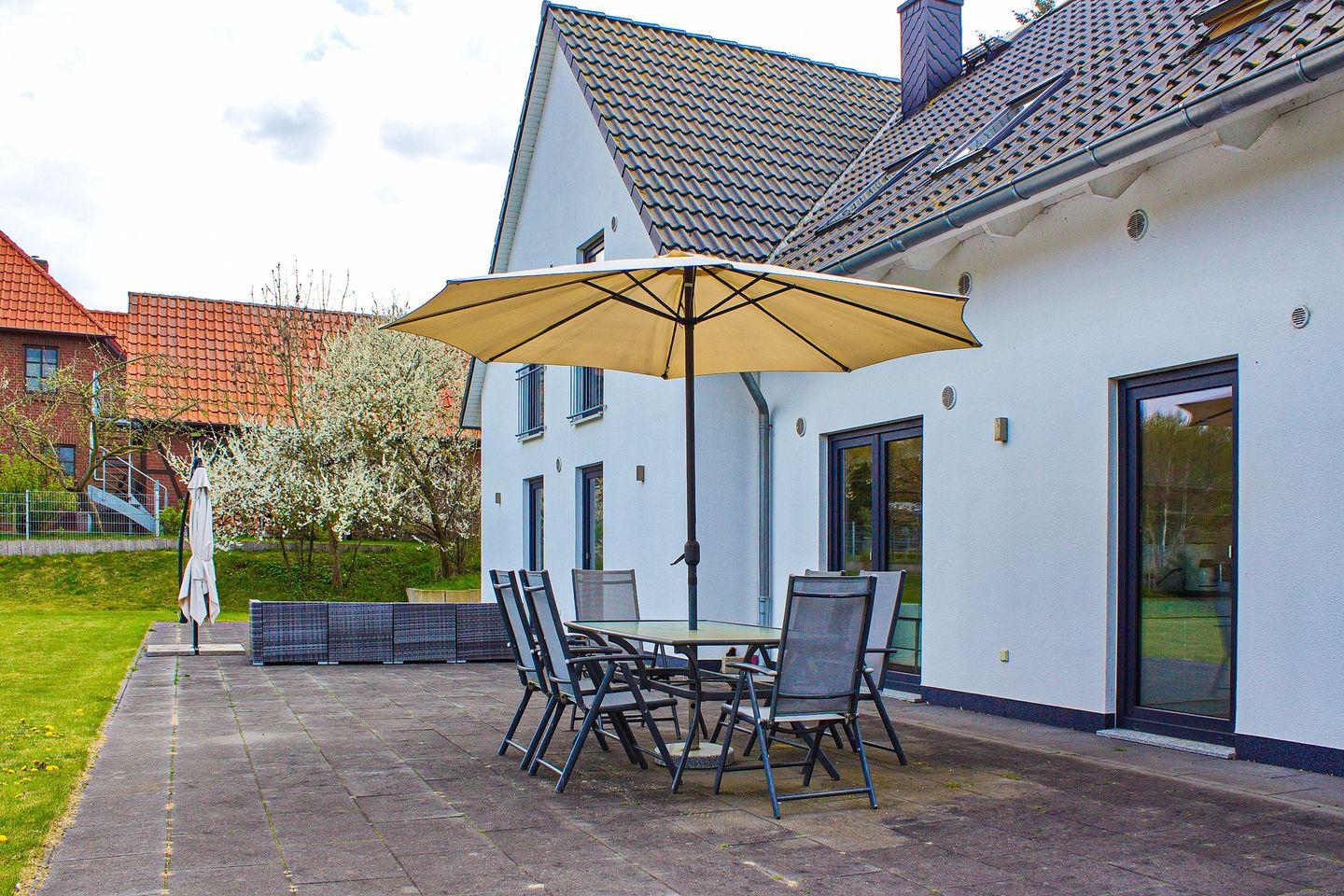 Im gemütlich eingerichteten Wohnzimmer lädt das Sofa mit den Sesseln zum entspannten TV-Abend ein. Für ein gemütliches Ambiente und wohlige Wärme sorgt der Kamin. Vom Wohnzimmer aus gelangst du auf die Nord-Ost-Terrasse. Hier findest du während der Saison Terrassenmöbel und einen Sonnenschirm vor. Ebenfalls kann die hinter dem Haus liegende Wiese zum Spielen genutzt werden.