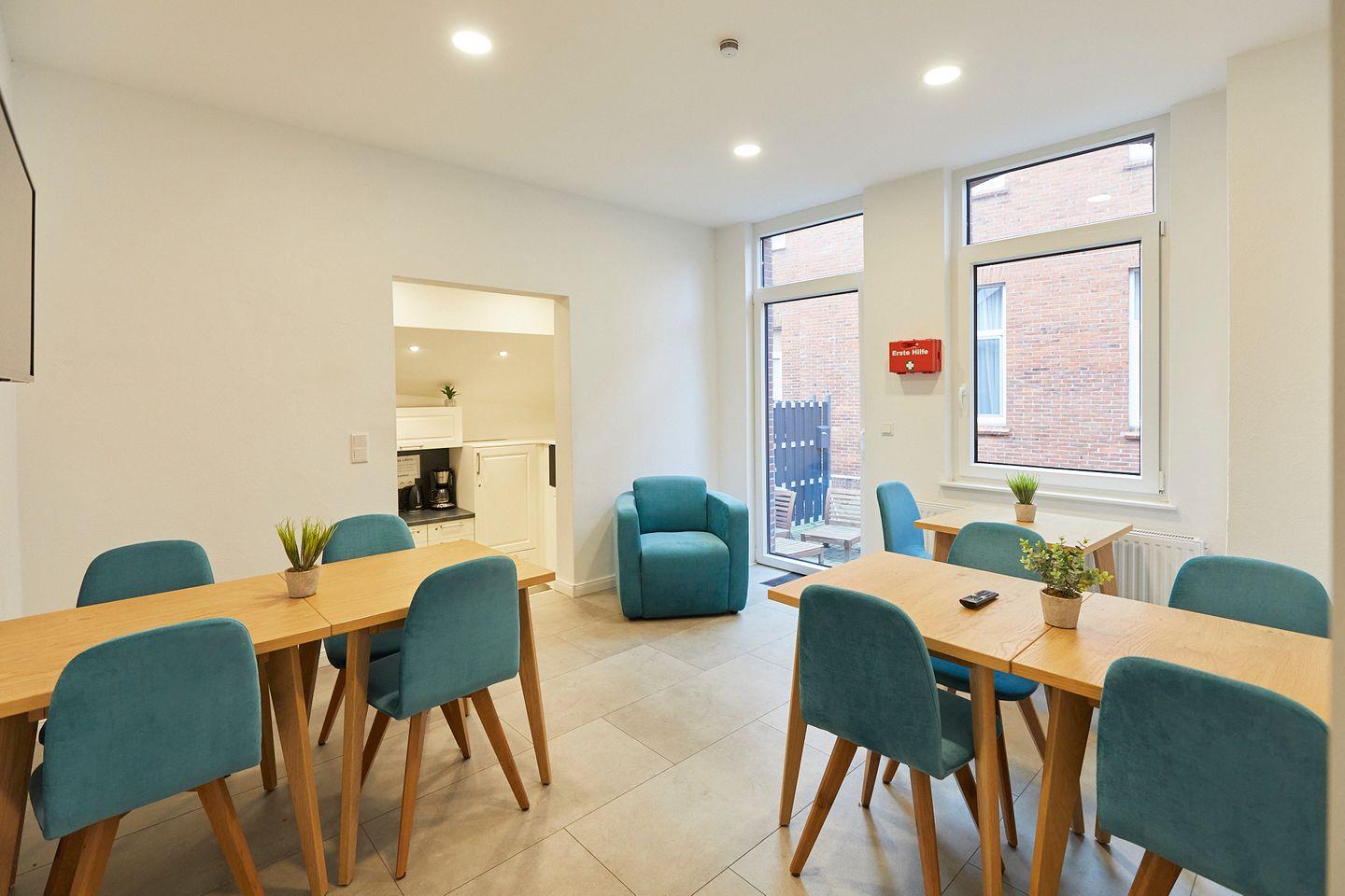Im Erdgeschoss des Hauses steht den Gästen eine umfangreich ausgestattete Gemeinschaftsküche sowie eine Außenterrasse zur Verfügung. Hier können sich die Gäste Ihre Mahlzeiten zubereiten - dafür steht jedem Appartement ein eigener abschließbarer Kühlschrank zur exklusiven Nutzung zur Verfügung.