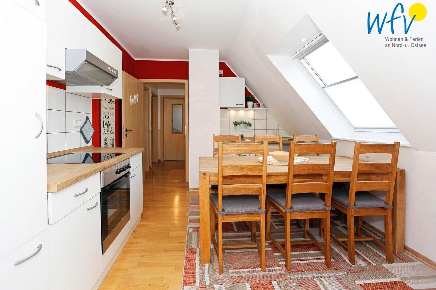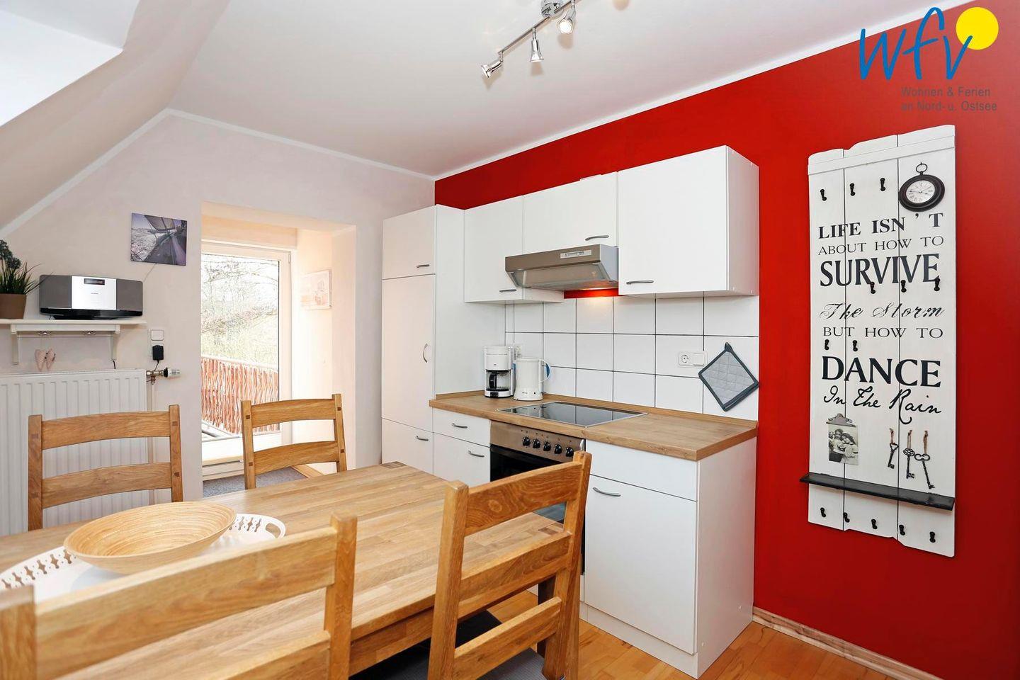 Sie möchten sich in Ihrem Urlaub auf Borkum bequem selbst verpflegen? Die Ferienwohnung verfügt über eine moderne Einbauküche - u.a. mit Cerankochherd und Backofen, Mikrowelle, Geschirrspüler und Kühlschrank mit Tiefkühlfach. An dem großen Esstisch können Sie wunderbar das ausgedehnte Ferienfrühstück genießen, abends gemeinsam Tischspiele spielen oder bereits den nächsten ereignisreichen Tag auf Borkum planen!